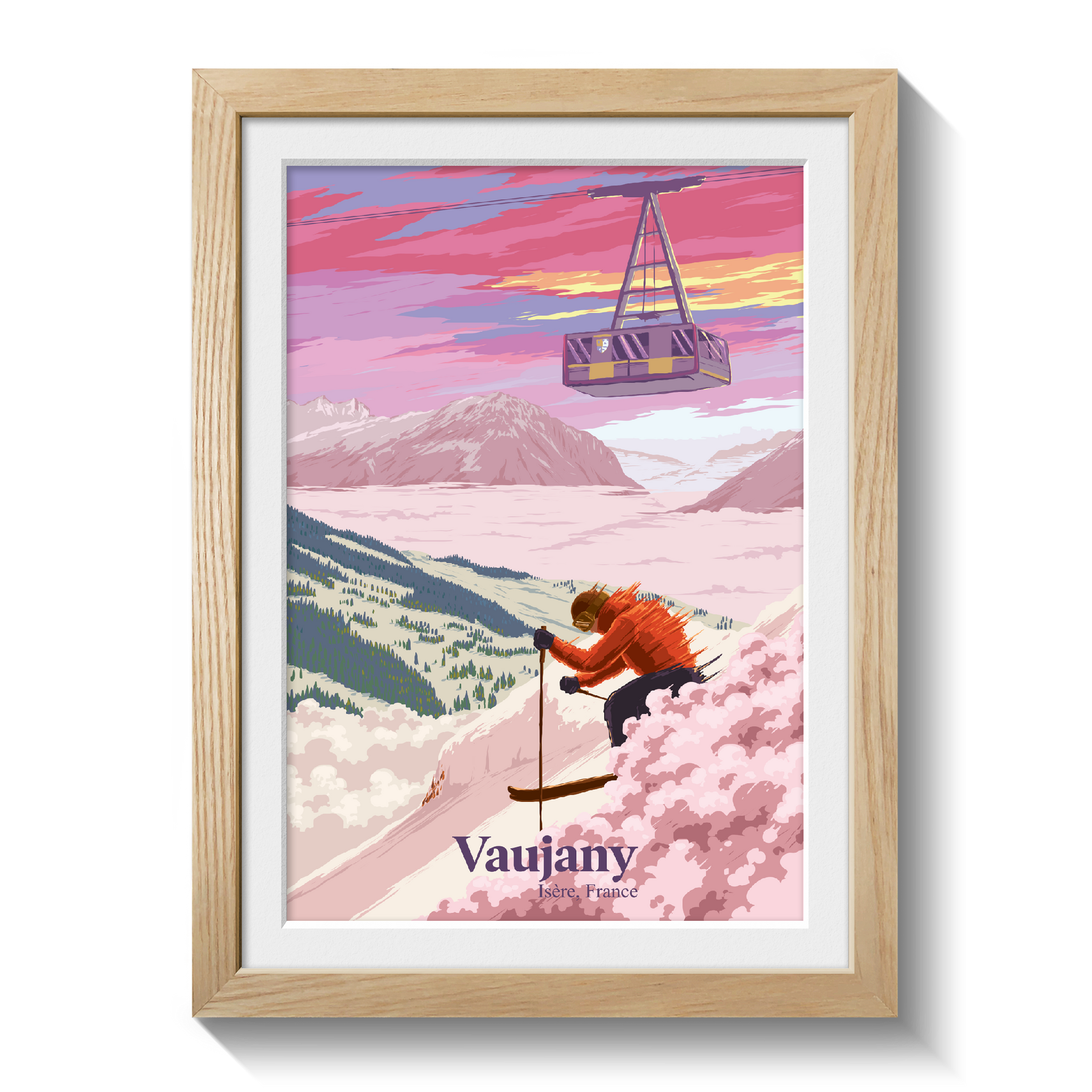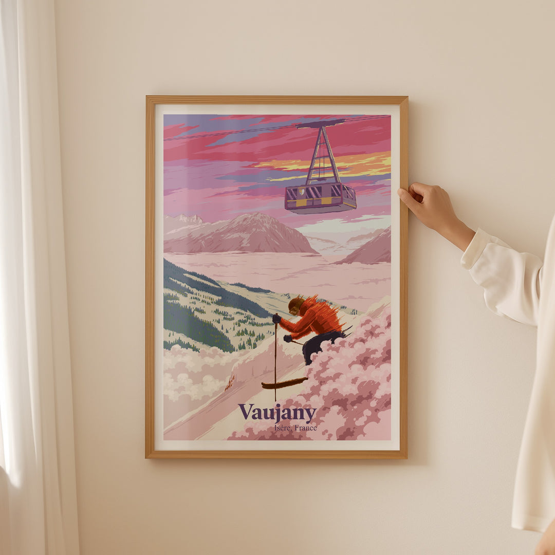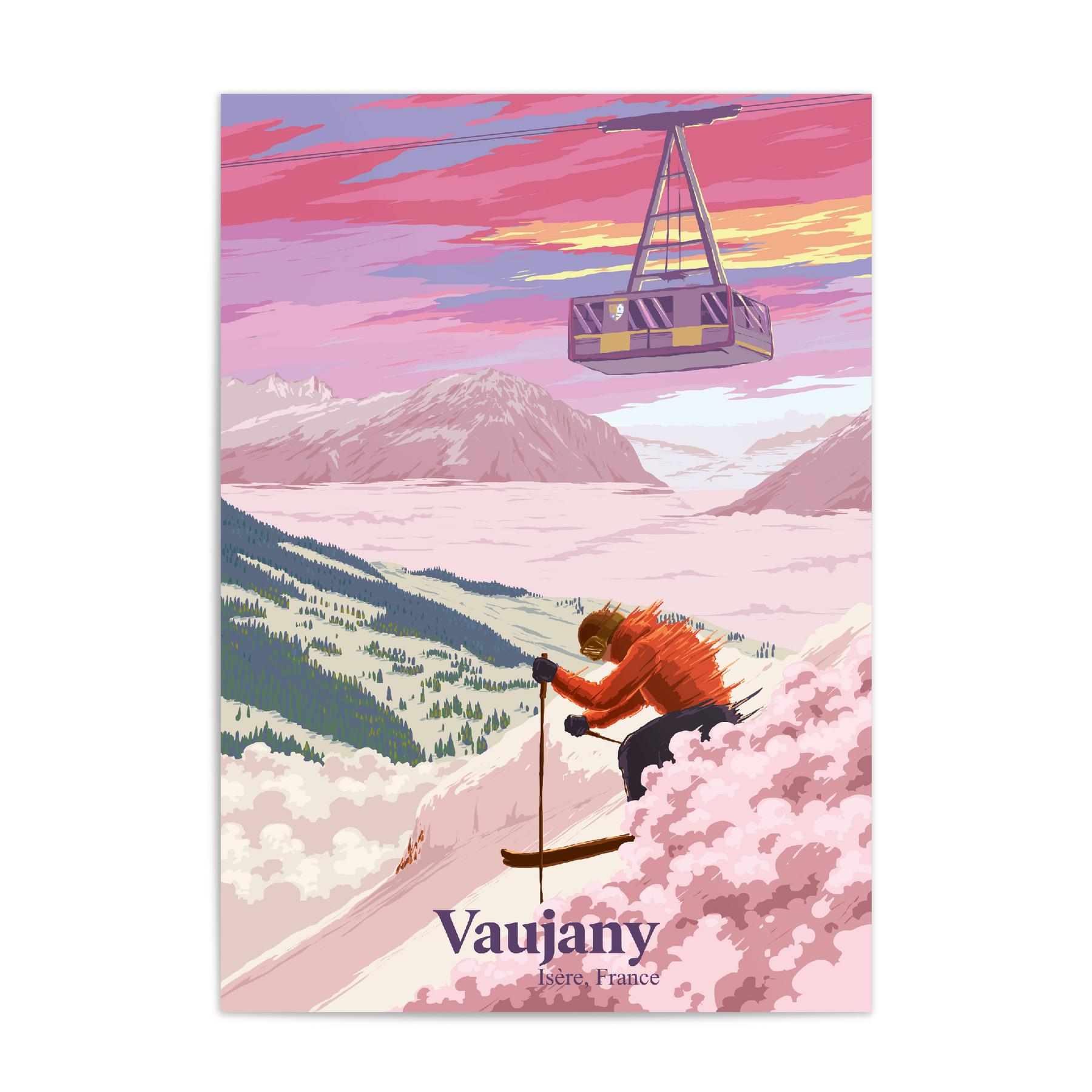 This is an original travel poster featuring the French ski resort of Vaujany in the Isere area of the French Alps, connected by ski lift to nearby Alpe d'Huez.