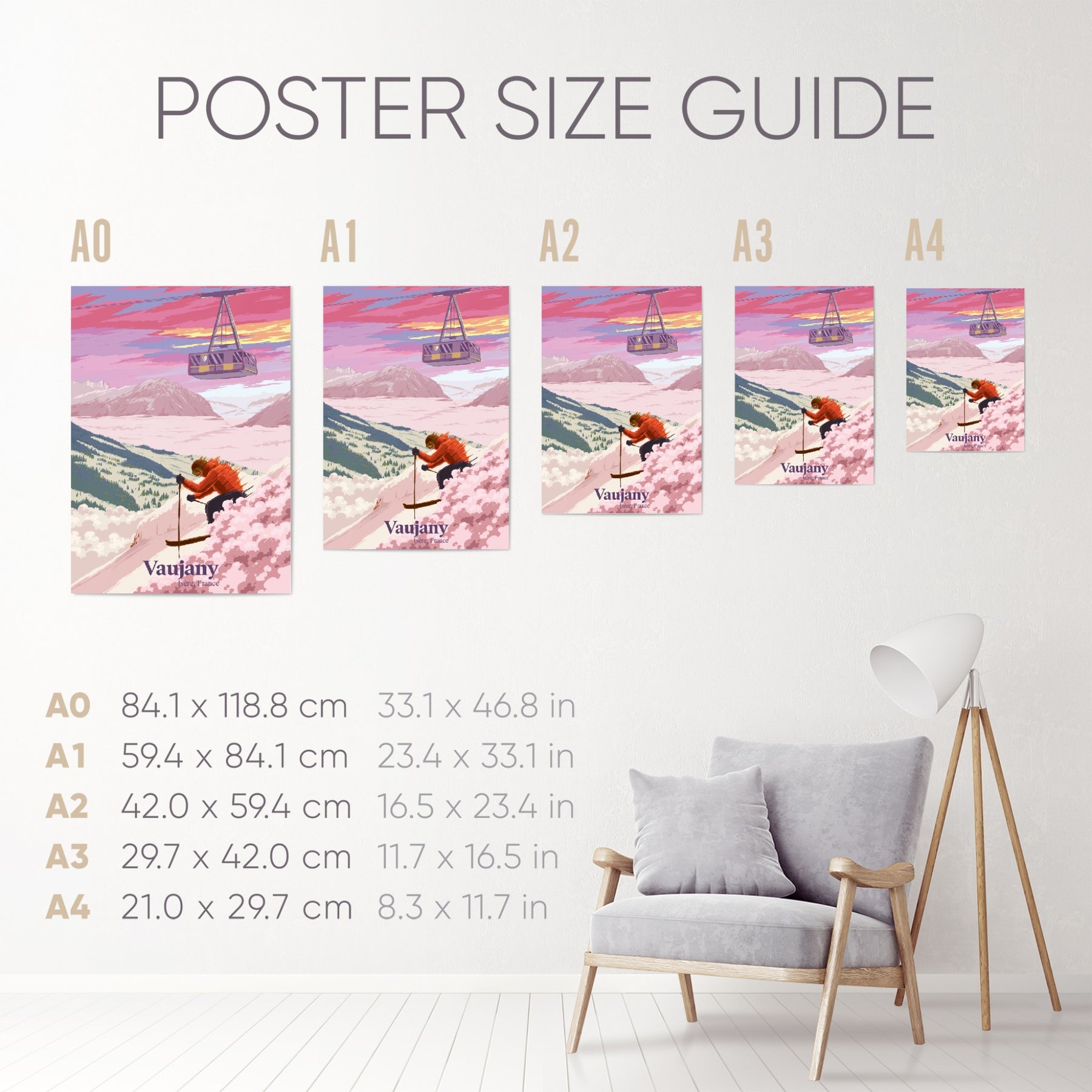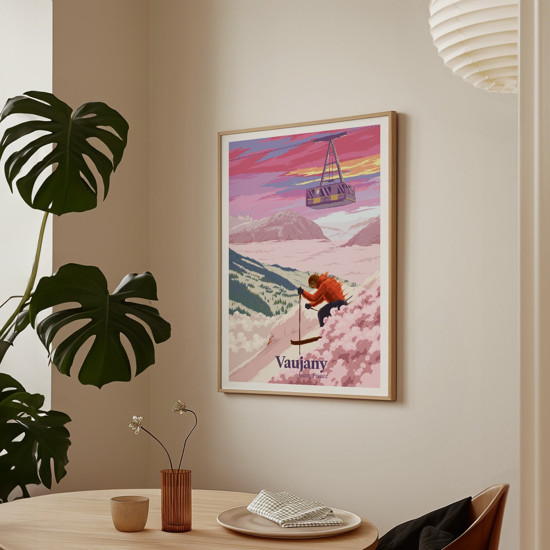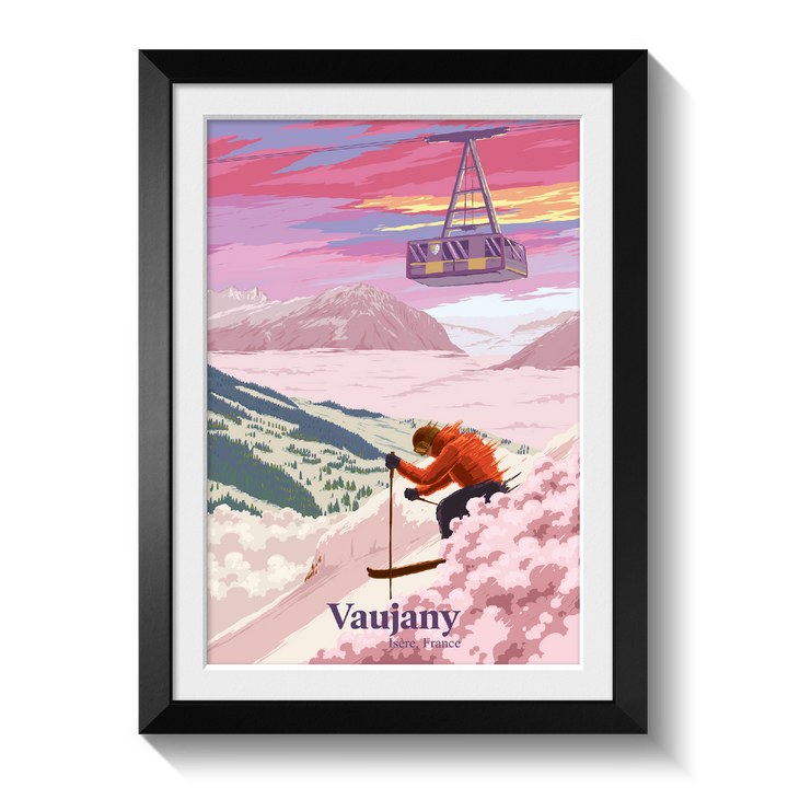 This is an original travel poster featuring the French ski resort of Vaujany in the Isere area of the French Alps, connected by ski lift to nearby Alpe d'Huez.