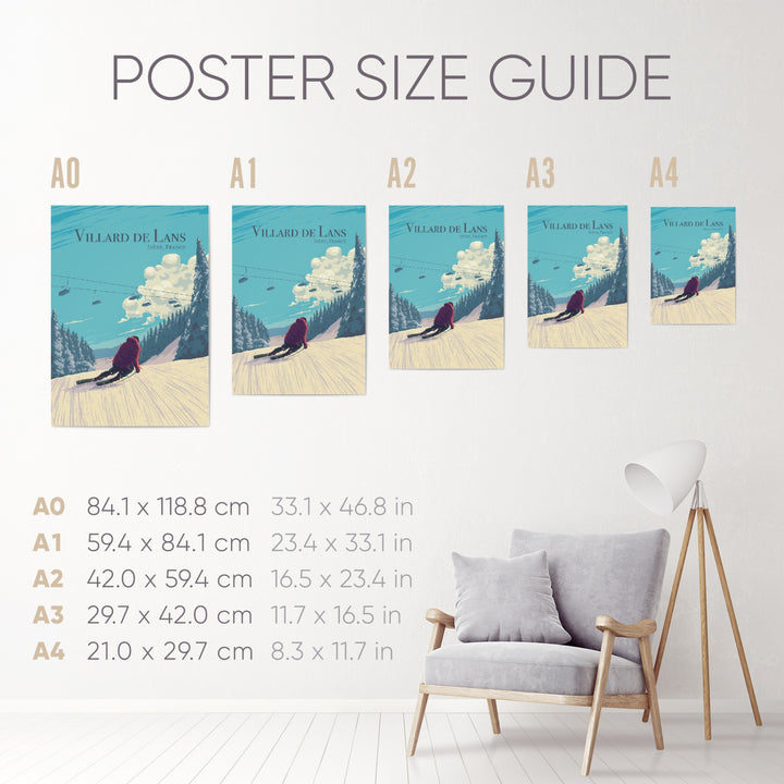 This is an original travel poster featuring the ski resort of Villard de Lans. Villard de Lans is set in the heart of the Vercors Regional Nature Park in the mountain range Vercors Massif. It is situated only an hour from Grenoble.