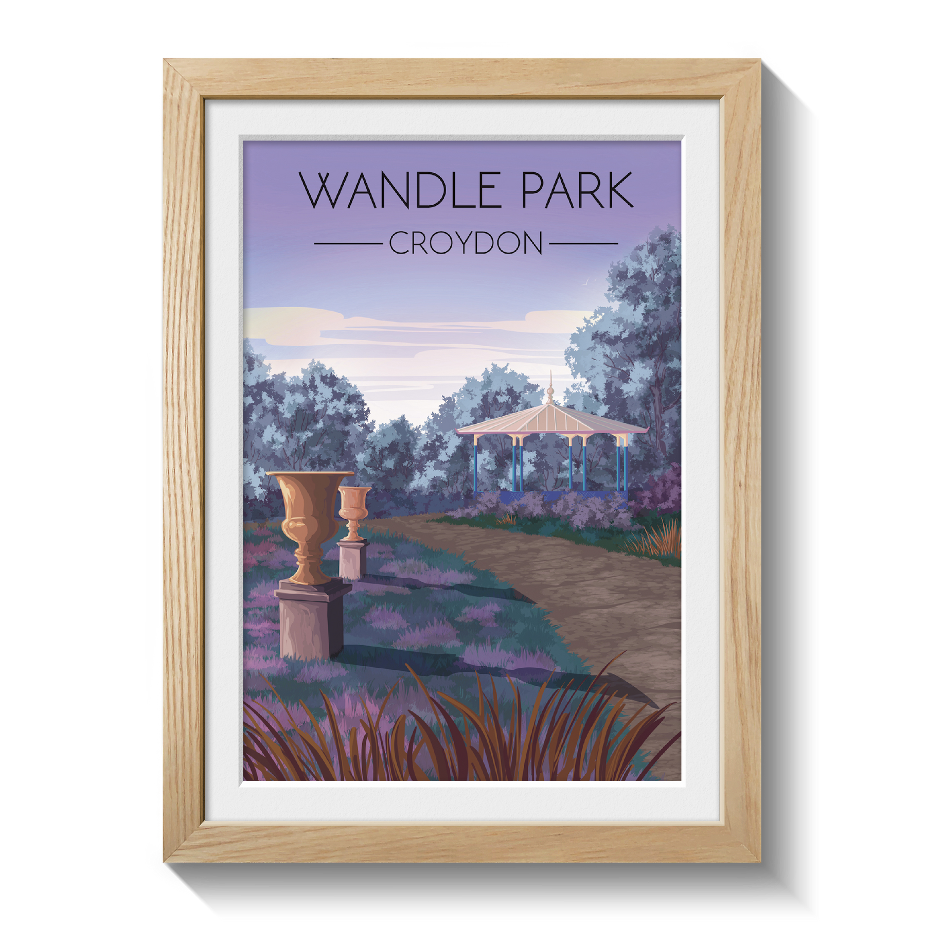 An original travel print featuring the bandstand at South London's Wandle Park in Croydon.