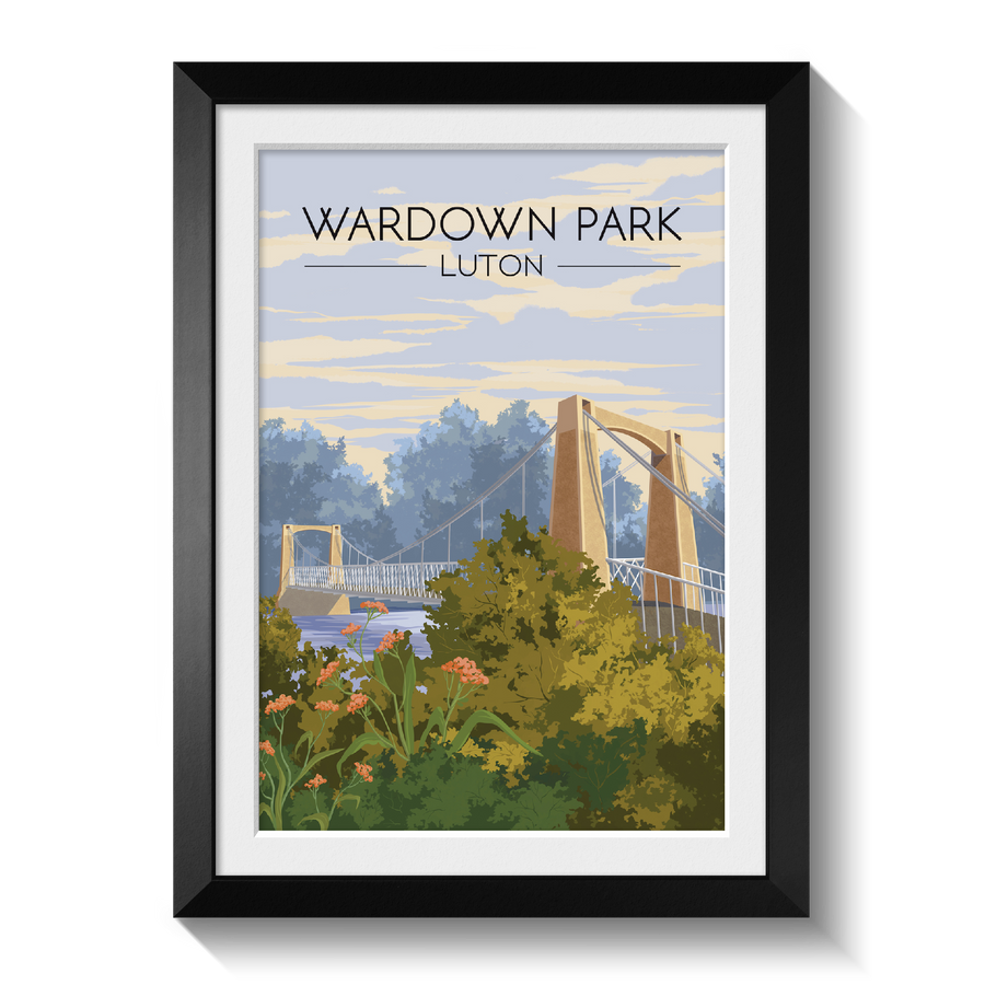 An original travel poster featuring the suspension bridge that crosses the River Lea in Luton's much loved Wardown Park.