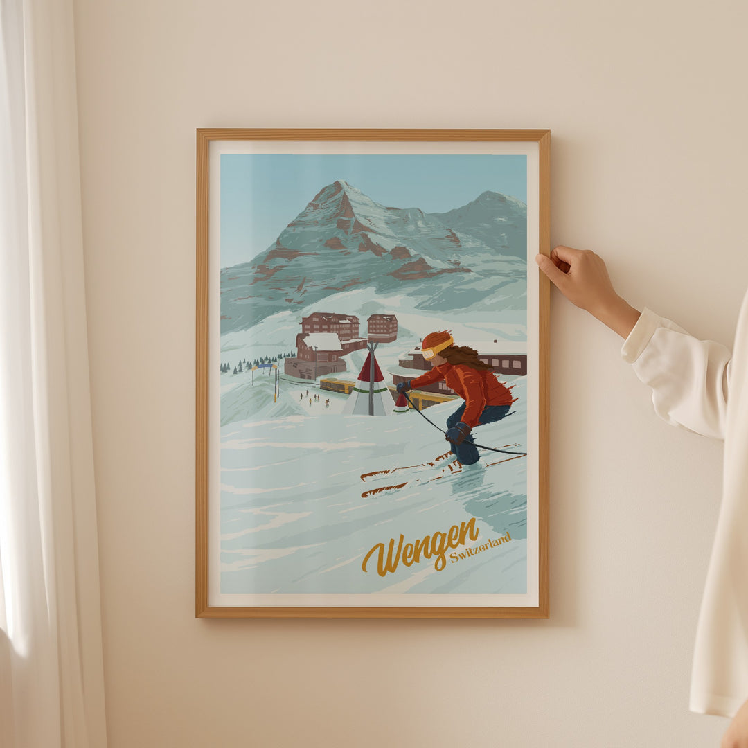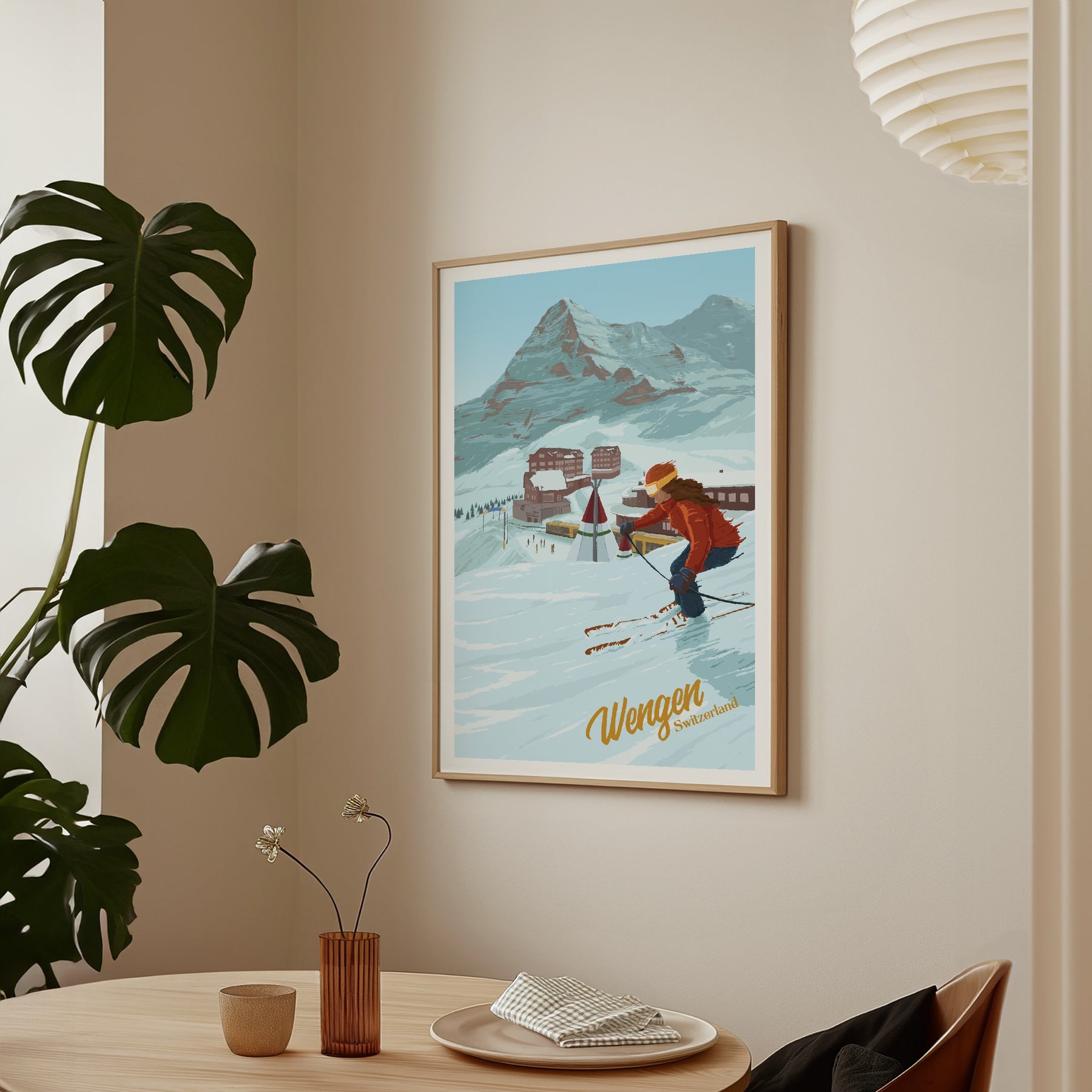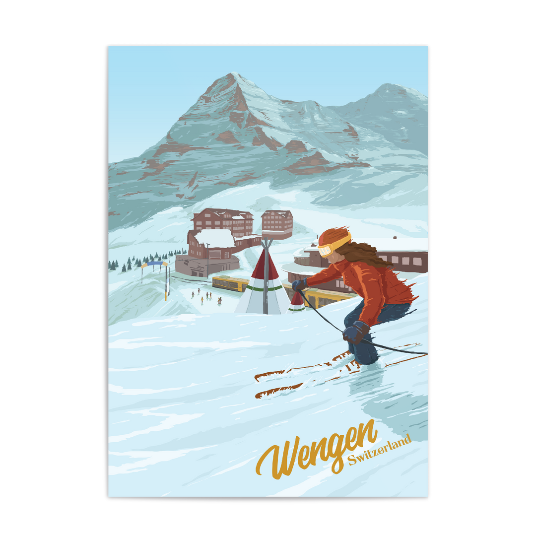 This is an original travel poster featuring the popular Swiss ski resort of Wengen.