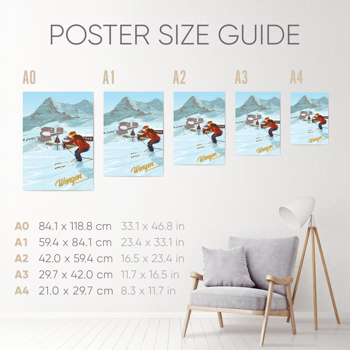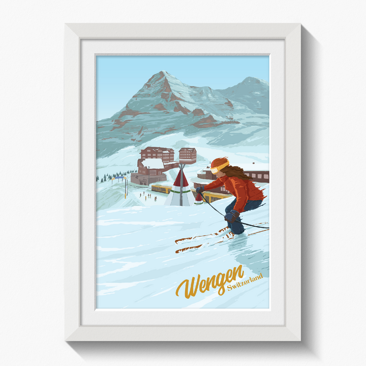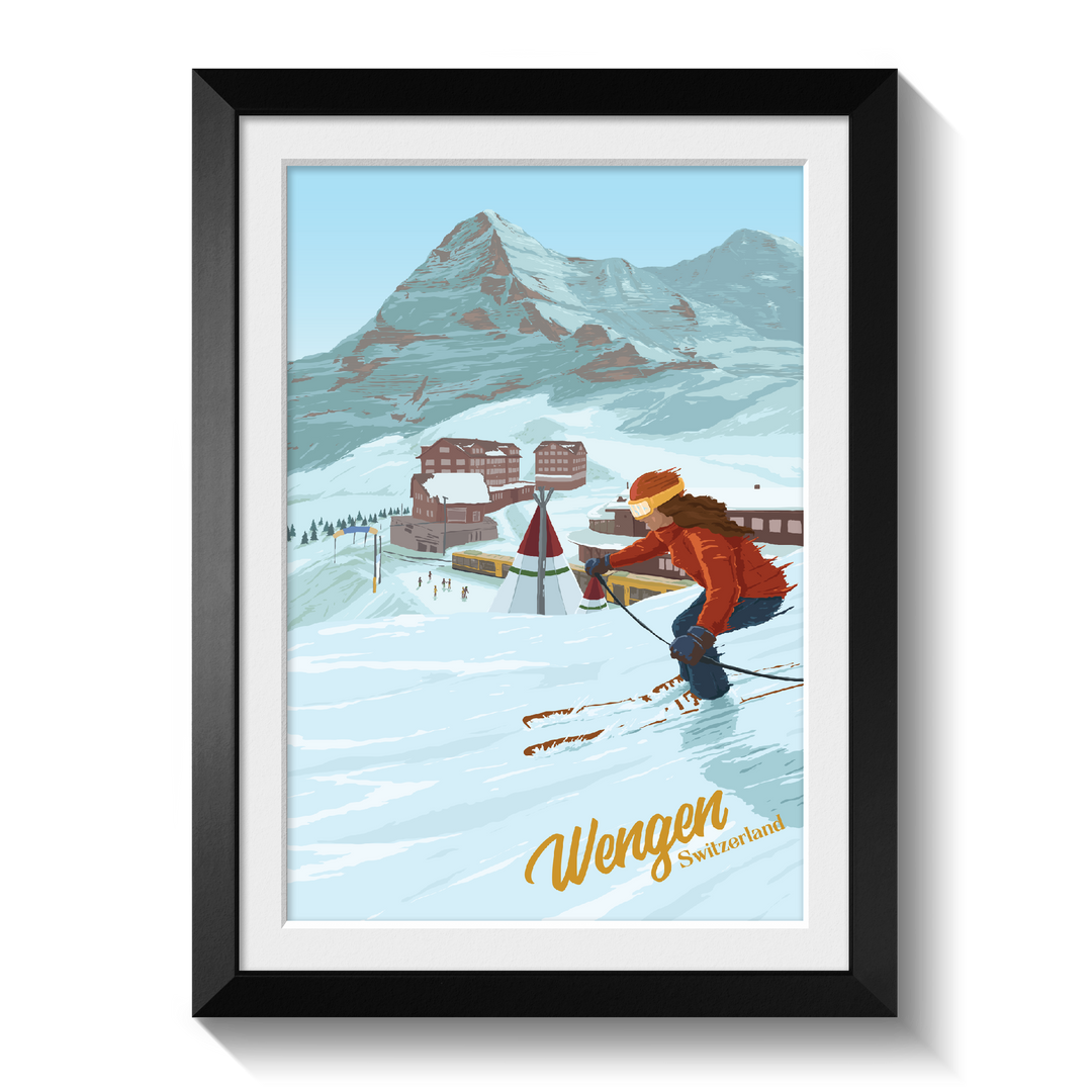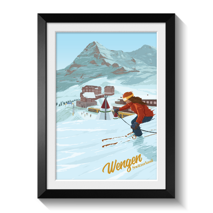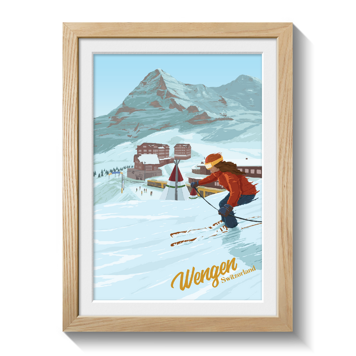 This is an original travel poster featuring the popular Swiss ski resort of Wengen.