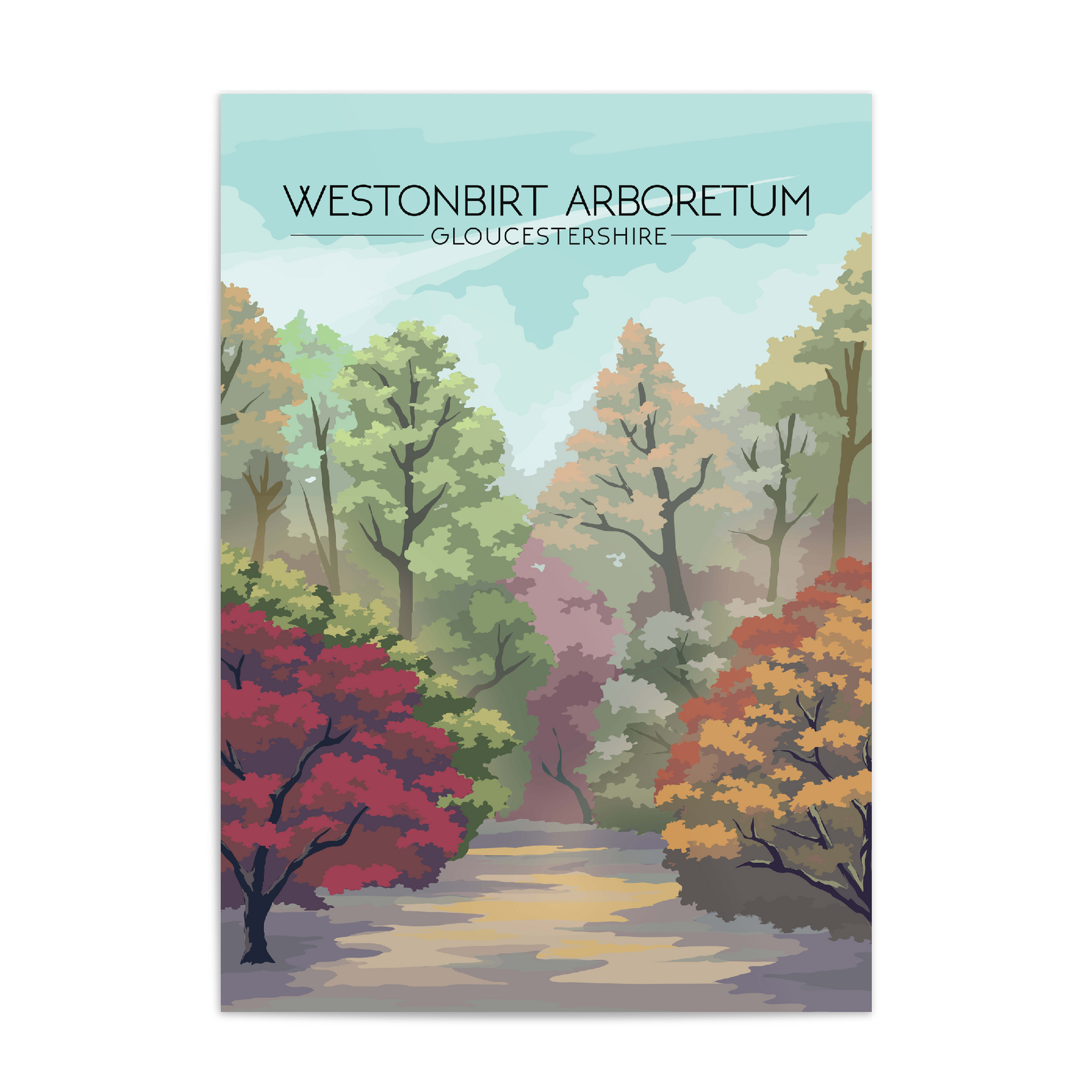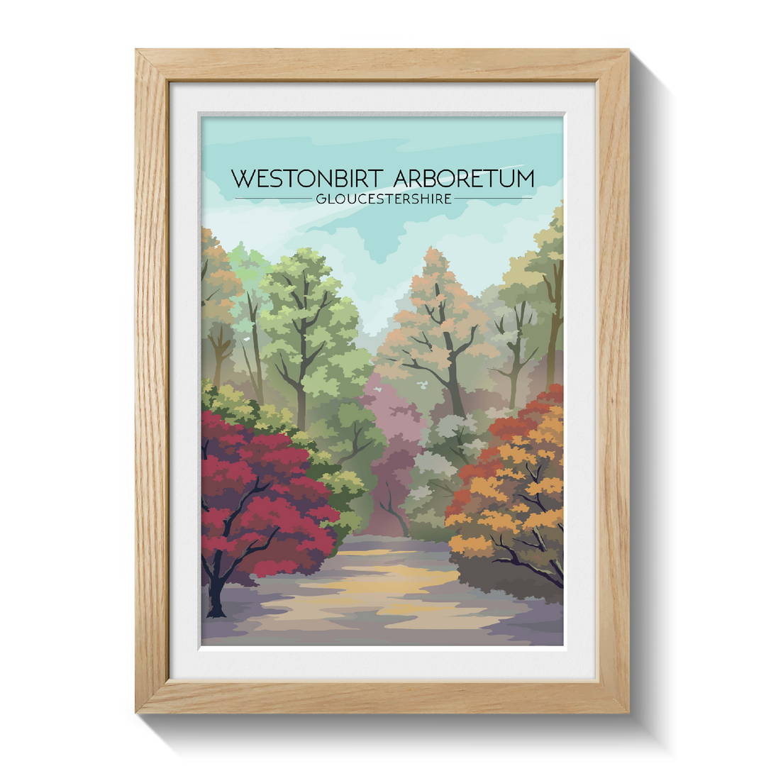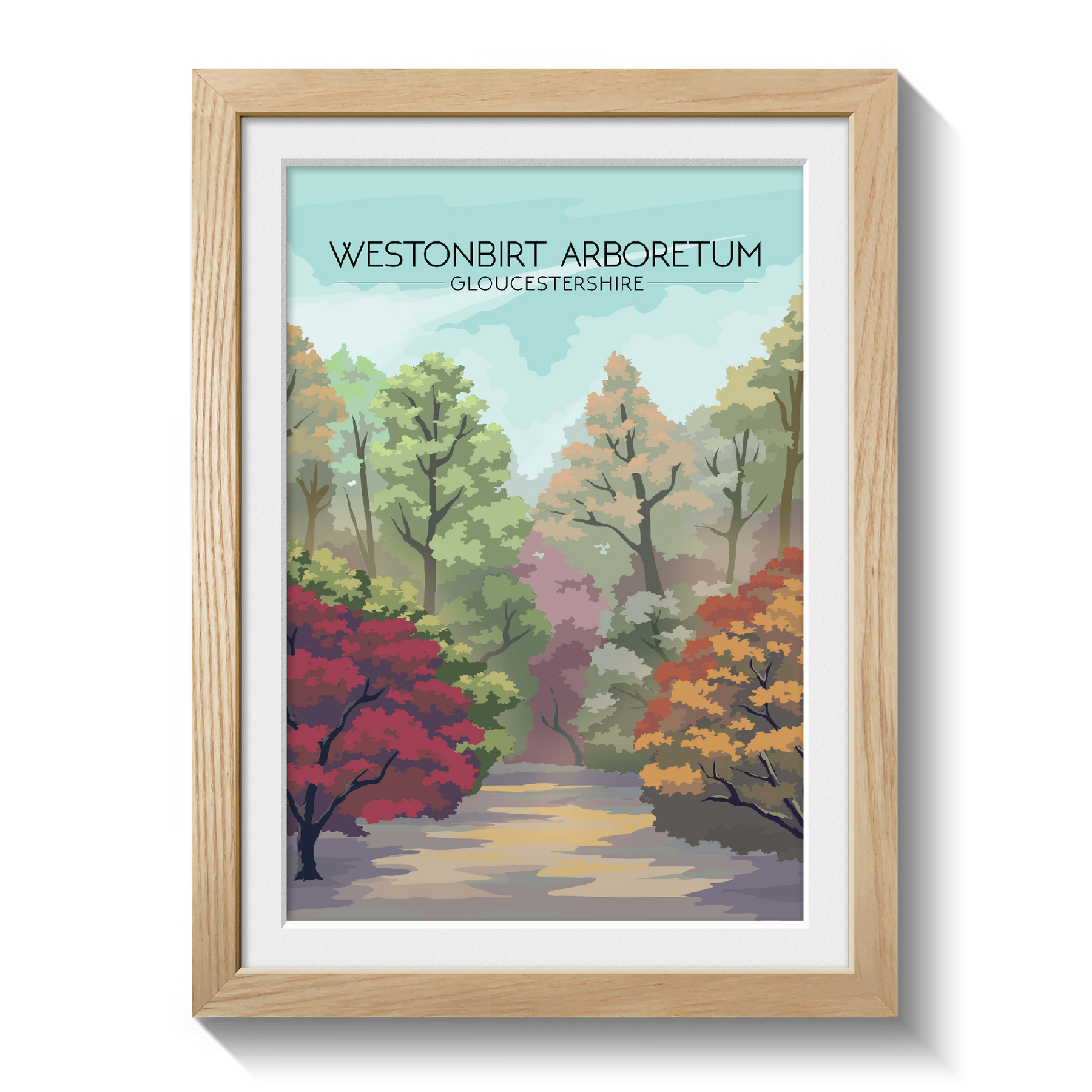 Original travel poster featuring Westonbirt Arboretum, also known as The National Arboretum, in Gloucestershire, England. It is probably the most important and widely known arboretum in the United Kingdom, planted in the heyday of Victorian plant hunting in the mid-19th century. It is a Grade I site.