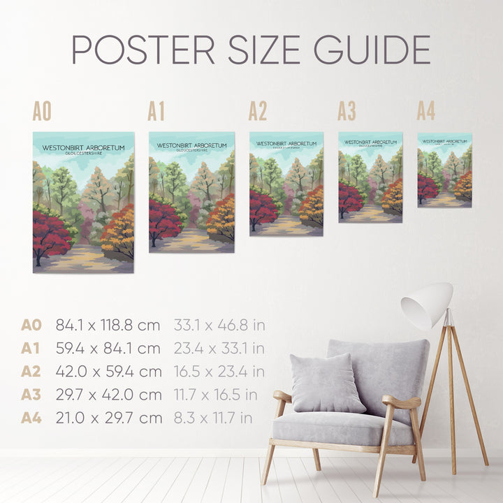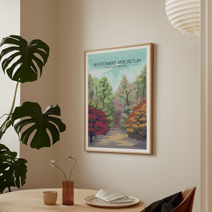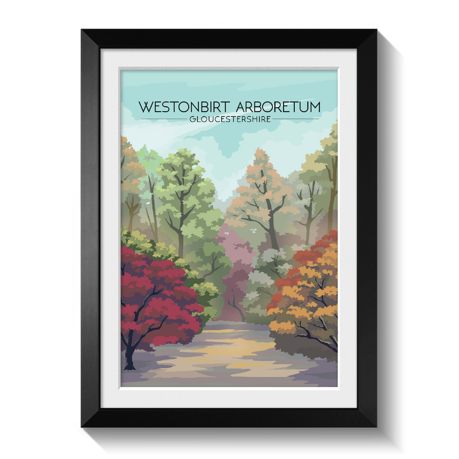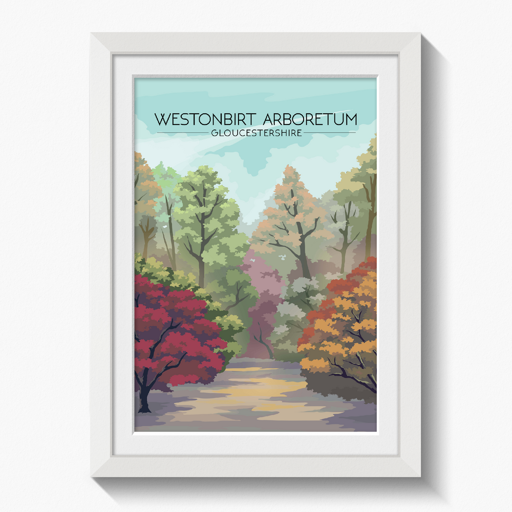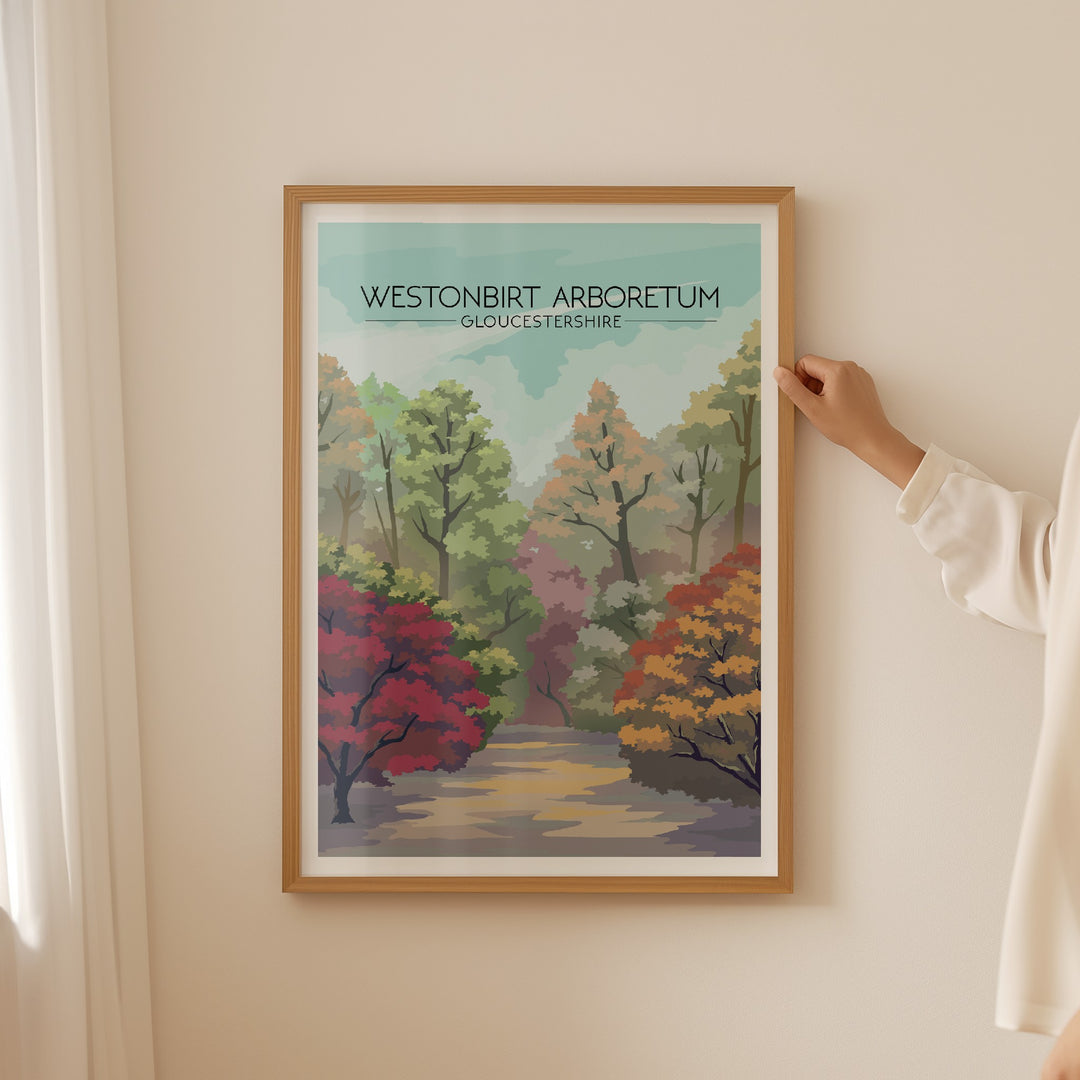 Original travel poster featuring Westonbirt Arboretum, also known as The National Arboretum, in Gloucestershire, England. It is probably the most important and widely known arboretum in the United Kingdom, planted in the heyday of Victorian plant hunting in the mid-19th century. It is a Grade I site.