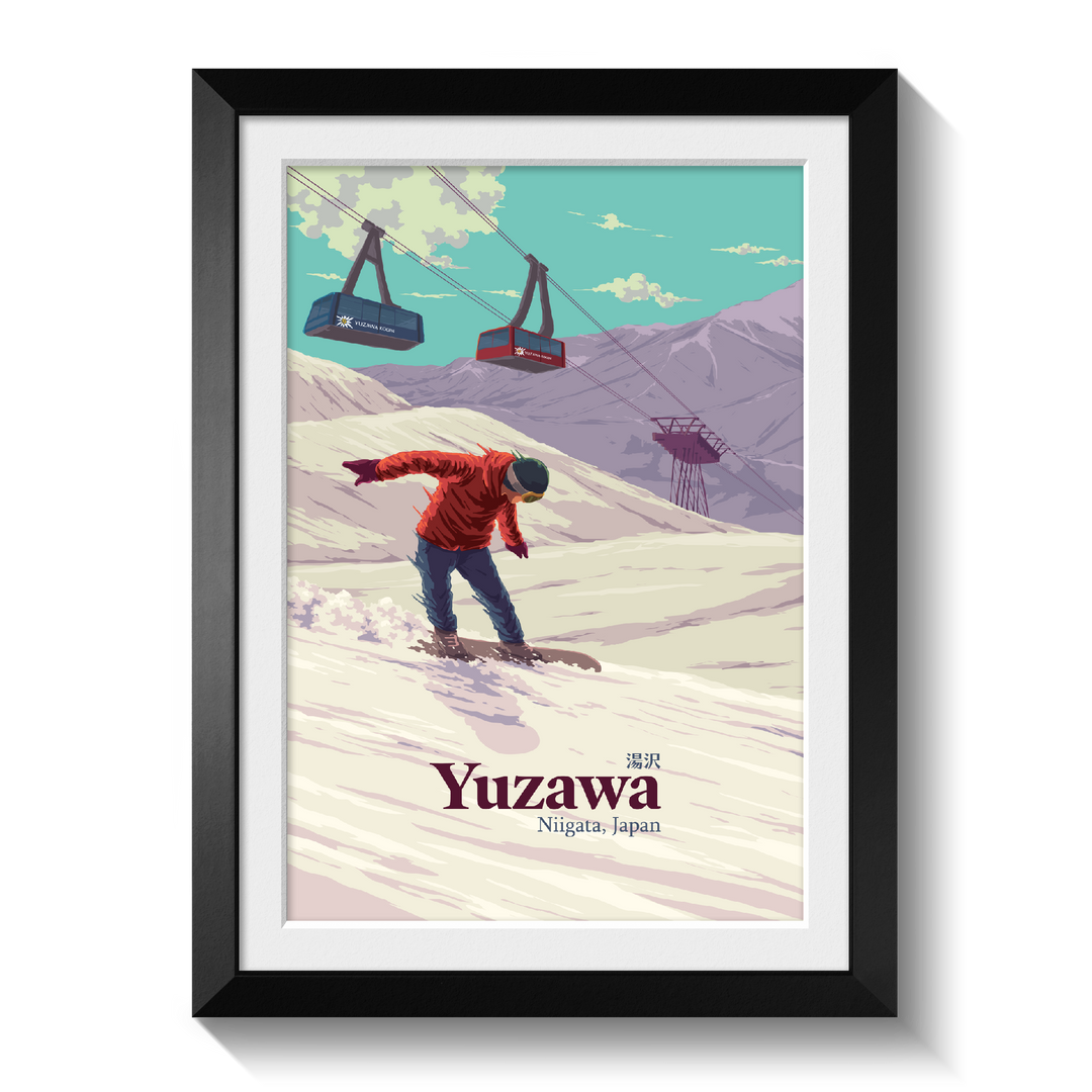 This is an original snowboarding poster featuring the ski resort of Yuzawa, also known as GALA Yuzawa in Niigata, Japan. Yuzawa, in the Japanese Alps, is as famous for its 'Onsen' hot springs as it is for its world class ski slopes.