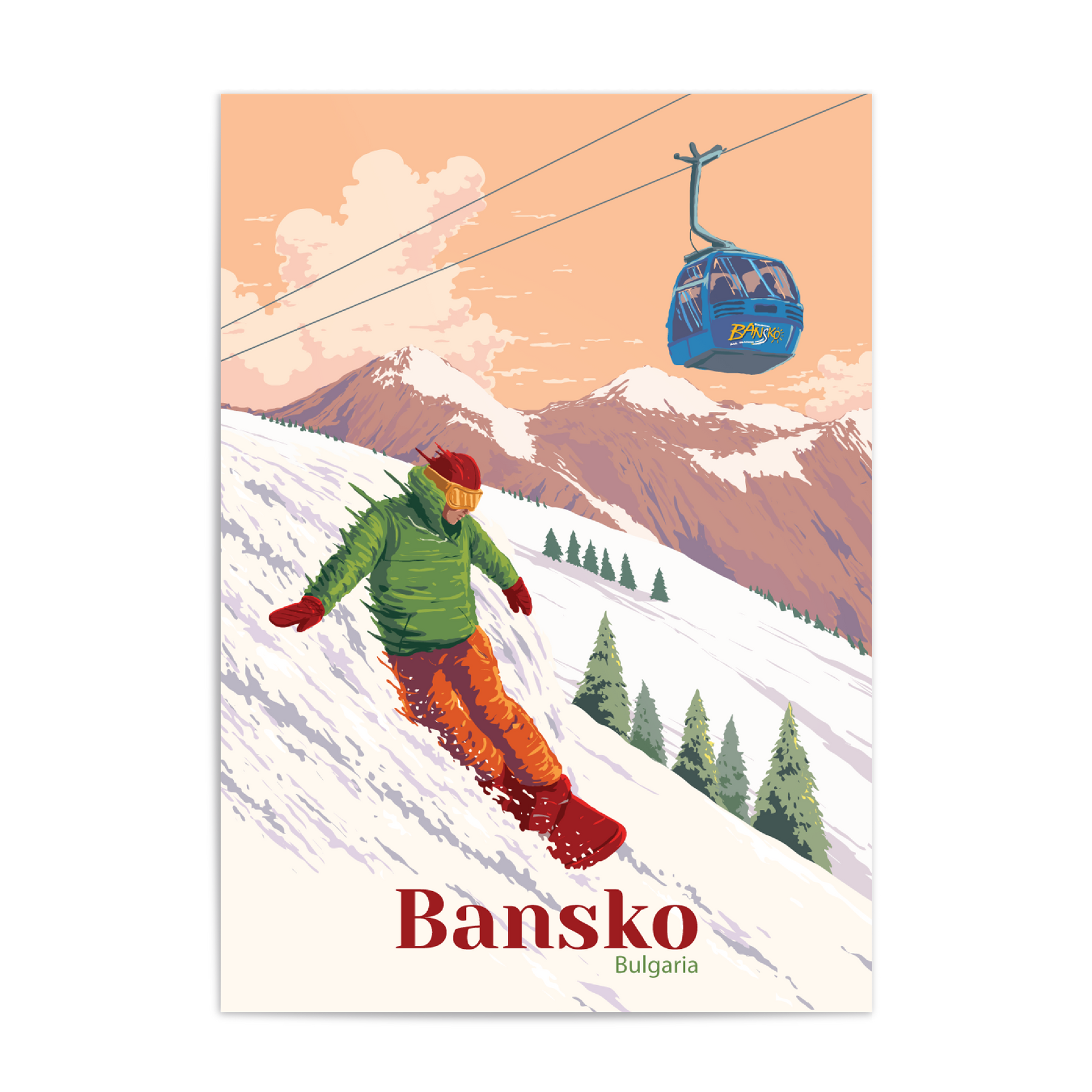 This is an original snowboarding travel poster featuring the Bulgarian ski resort of Bansko in the Pirin Mountains.