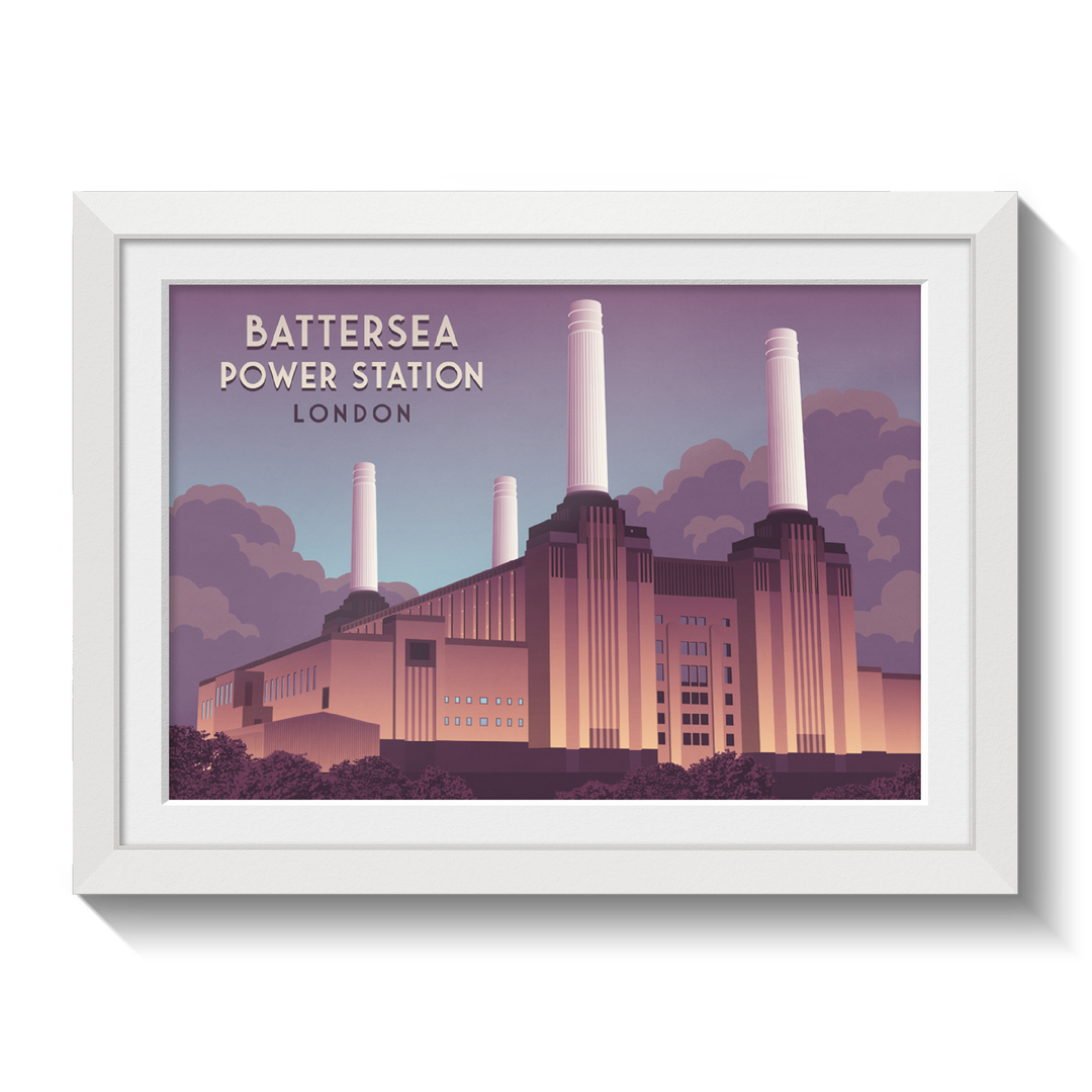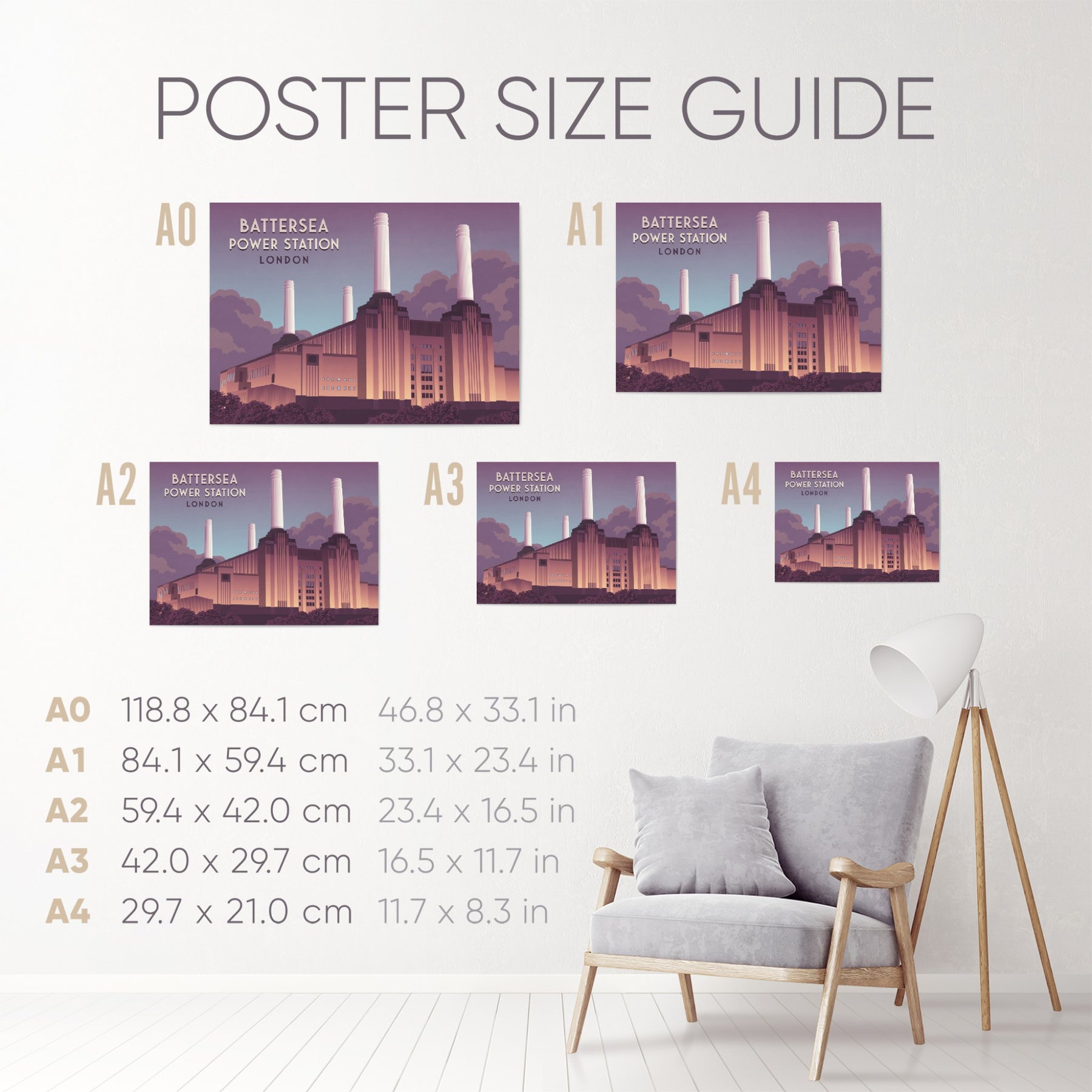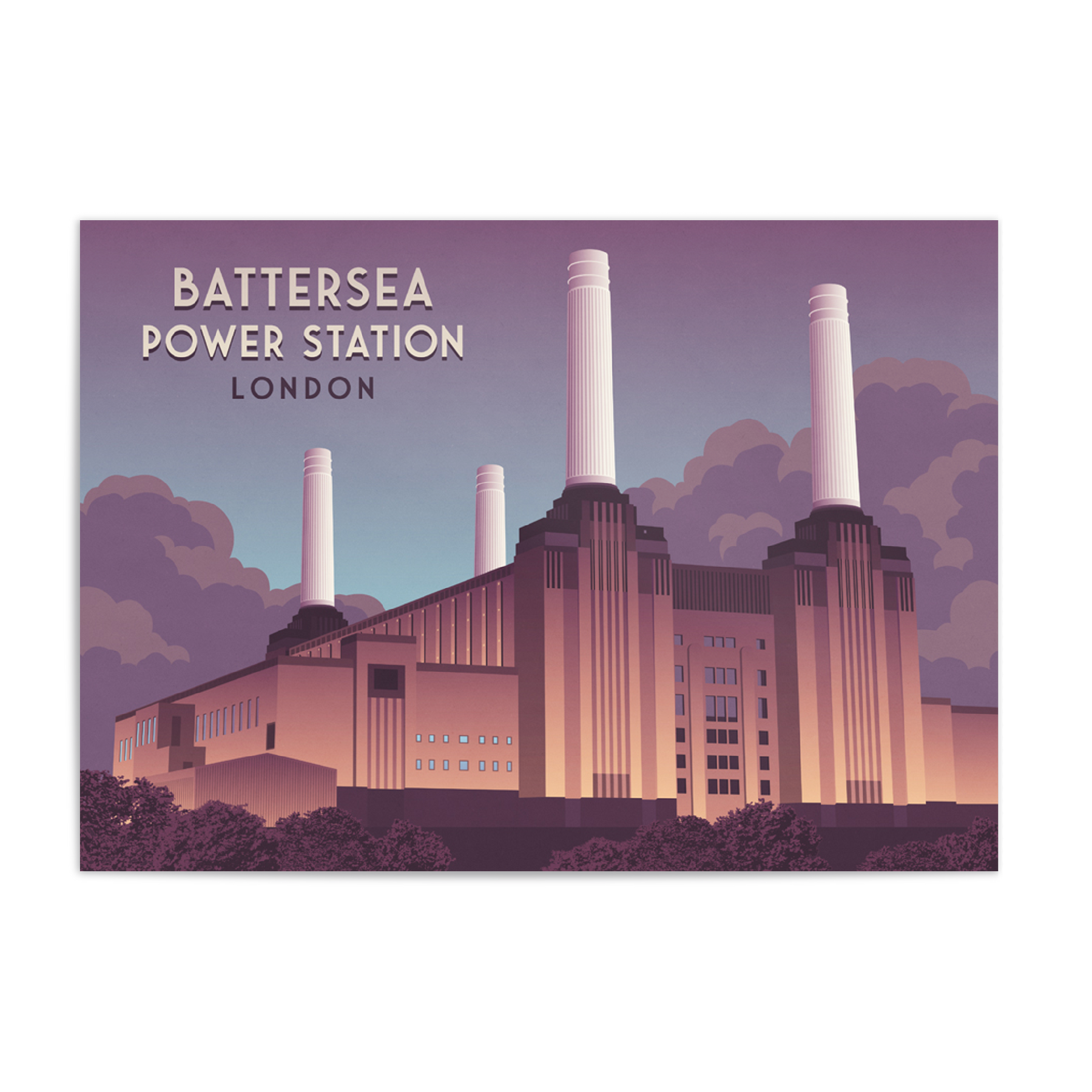 An original travel poster featuring the iconic Battersea Power Station, located on the South Bank of the River Thames. This decommissioned coal fired power station is one of the world's largest brick buildings and is noted for its distinctive art deco fittings and decor.