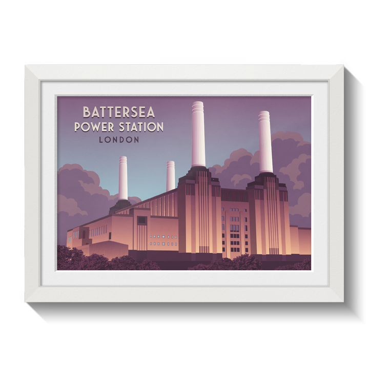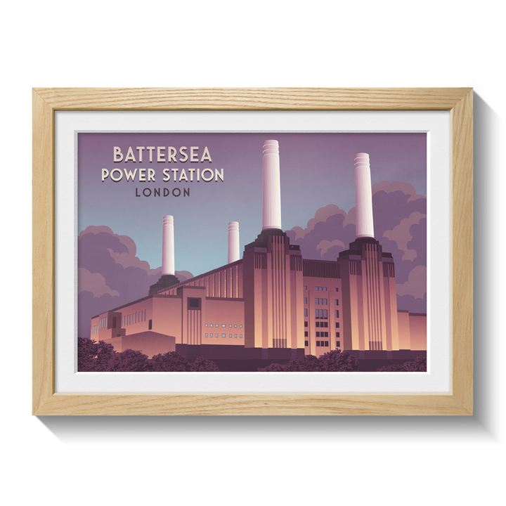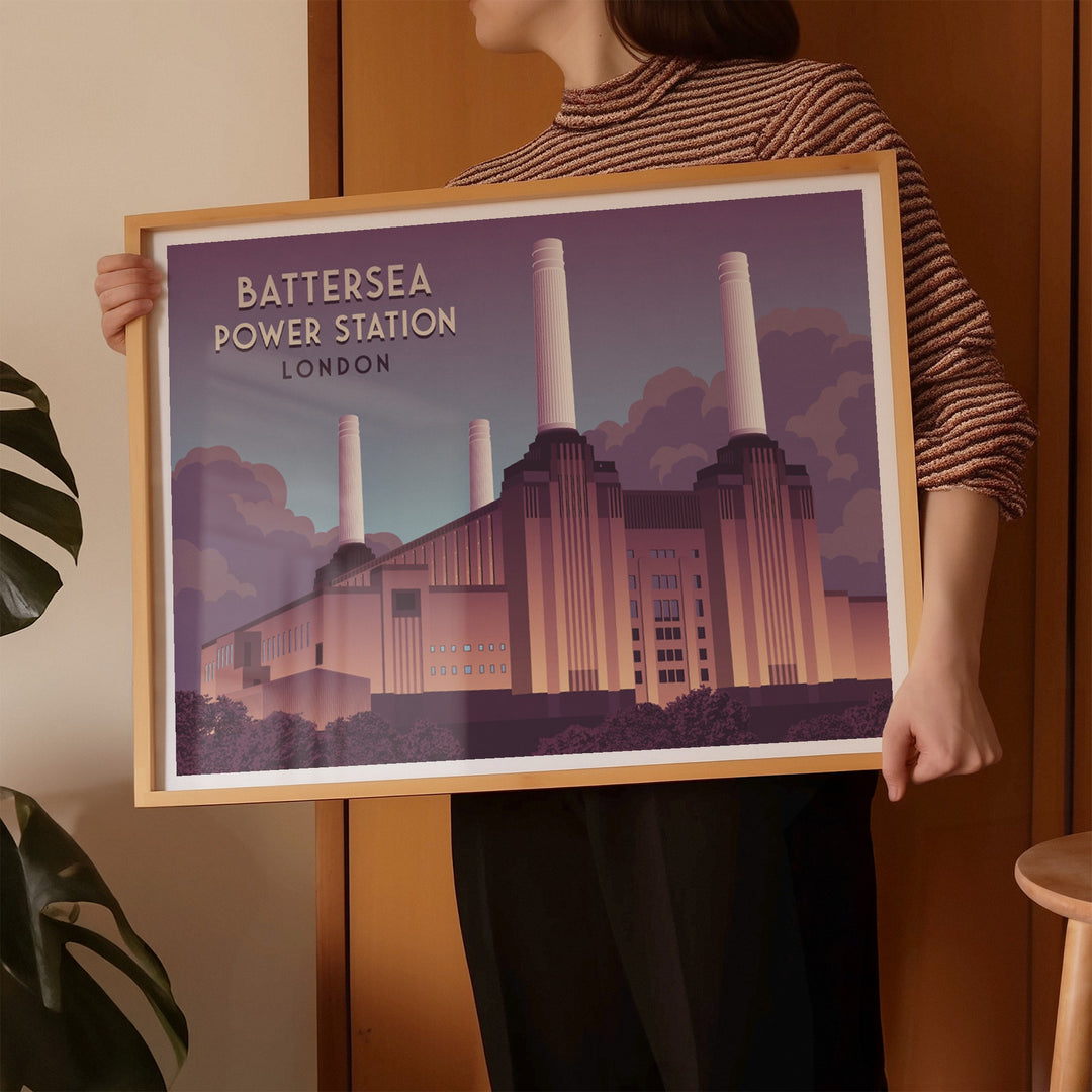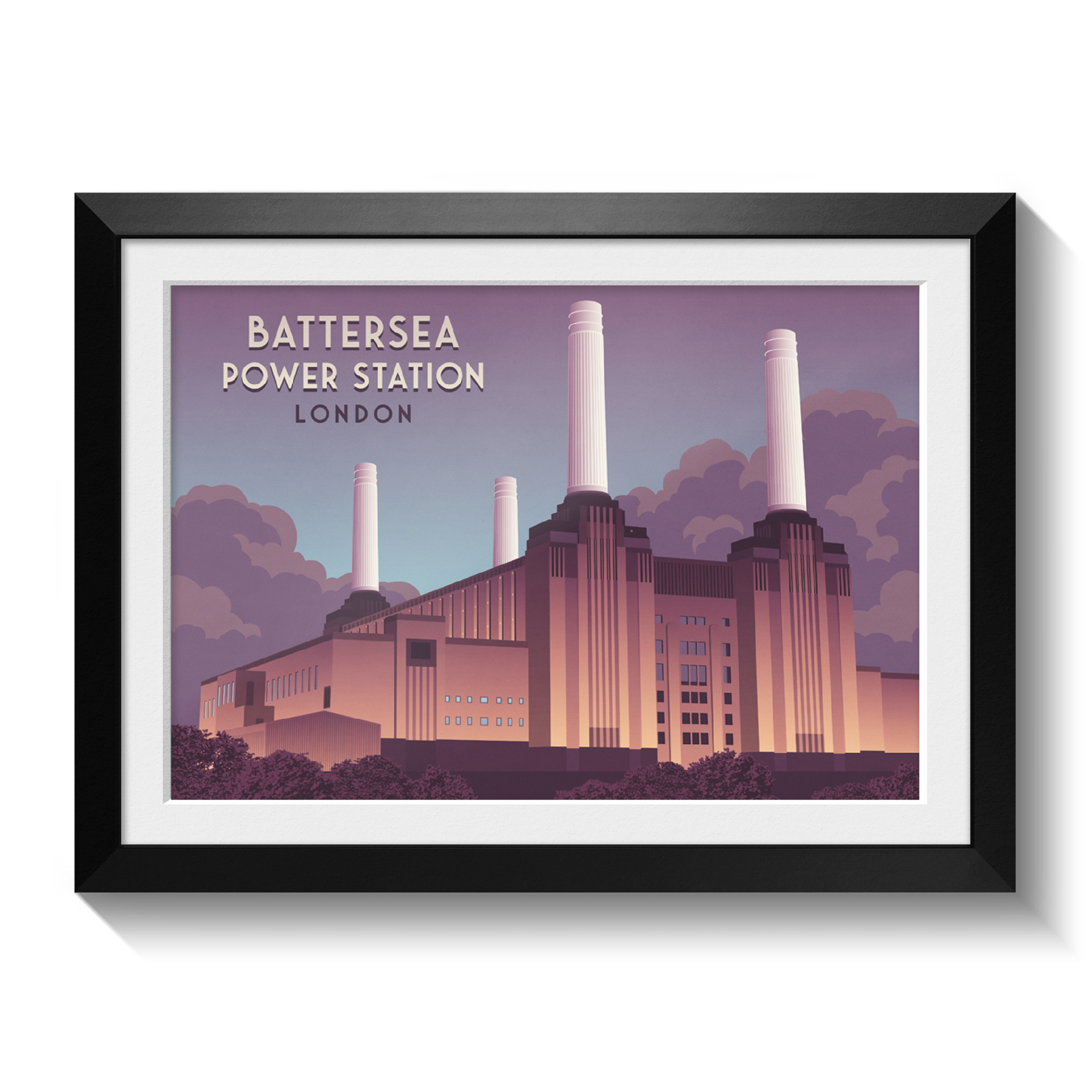 An original travel poster featuring the iconic Battersea Power Station, located on the South Bank of the River Thames. This decommissioned coal fired power station is one of the world's largest brick buildings and is noted for its distinctive art deco fittings and decor.