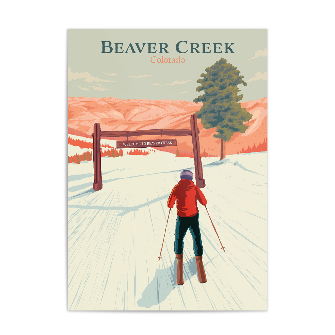 An original skiing print featuring the resort of Beaver Creek in the Rocky Mountains of Colorado, USA.