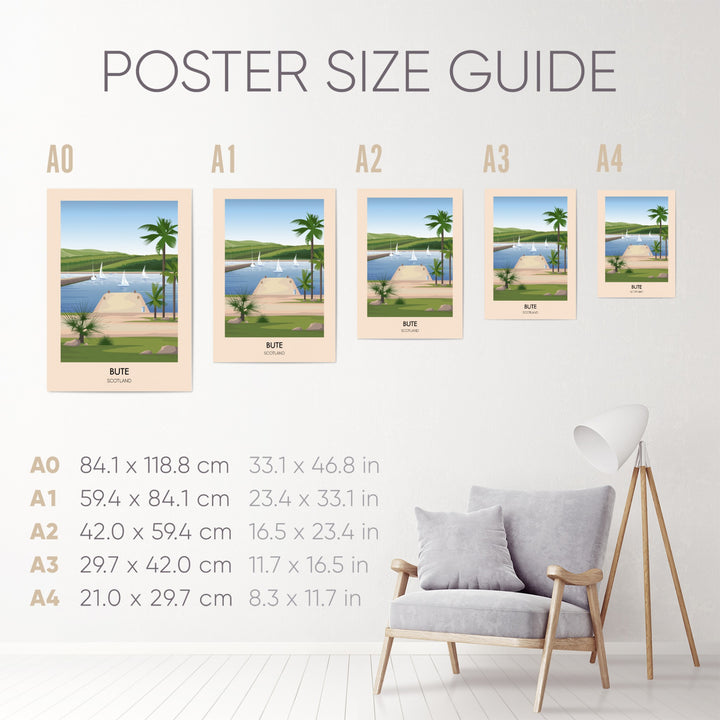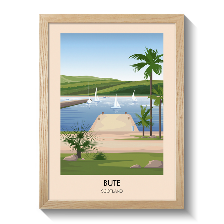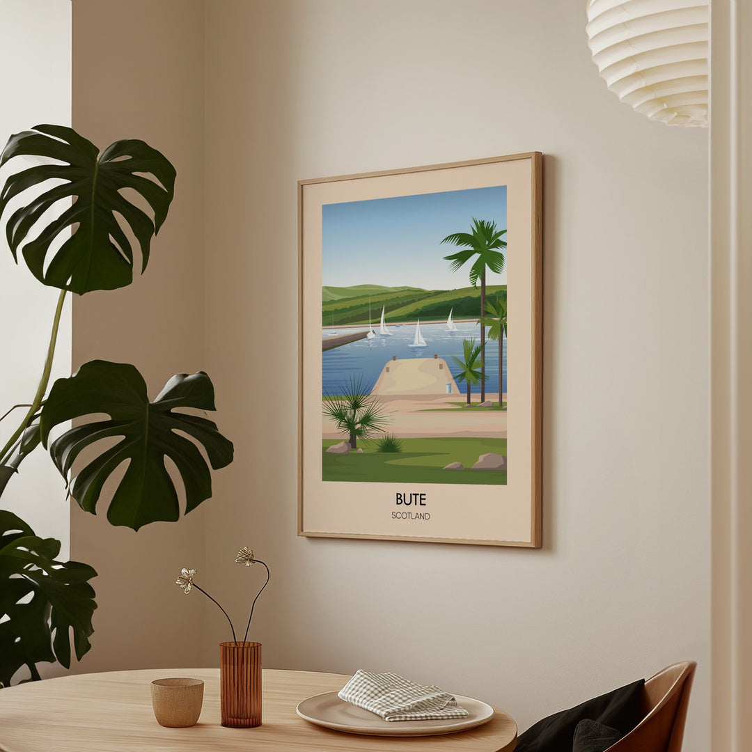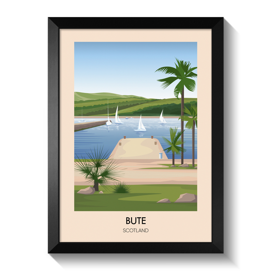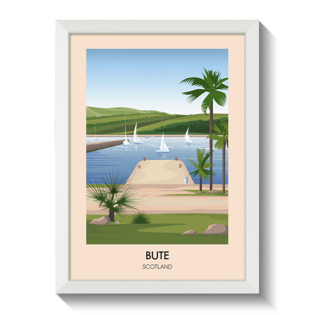 An original travel poster featuring the Scottish Island, Bute. The Isle of Bute is in the Islands of the Firth of Clyde and is one of the most accessible of the Scottish Islands.