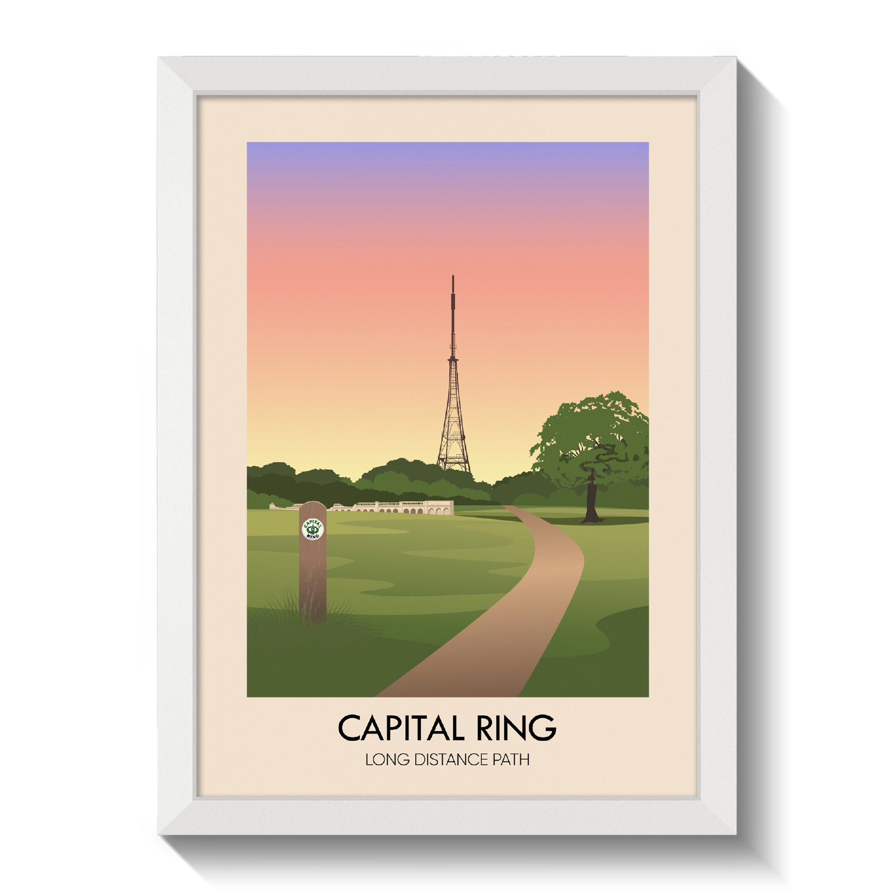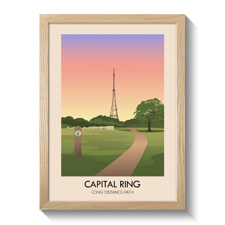The Capital Ring is an inner London circular orbital route linking parks, commons and open spaces. The path passes by rural areas, green parks and woods, round lakes and reservoirs and along rivers and canals. This poster features the section of the walk that goes through Crystal Palace Park with the Crystal Palace Transmitting Station visible in the background.