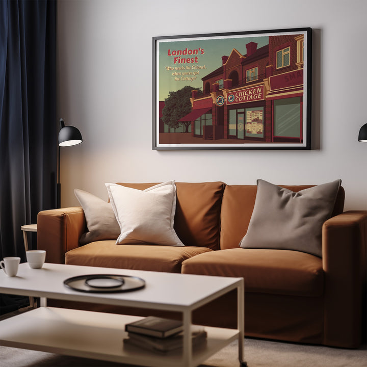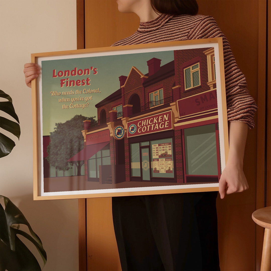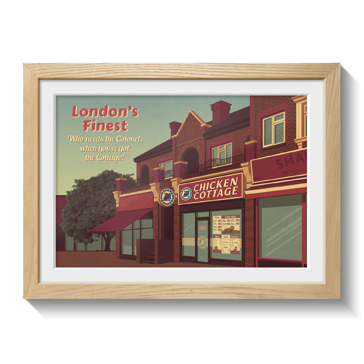 An original travel poster featuring everyone's favourite chicken shop. Chicken Cottage is one of the nation's best loved fast food outlets. Lovingly referred to as 'The Cottage', Chicken Cottage first opened in London in 1983, but branches can now be found churning out tasty meal deals and greasy bargain buckets all over the UK.