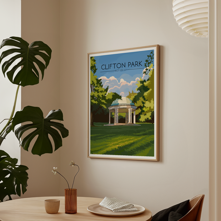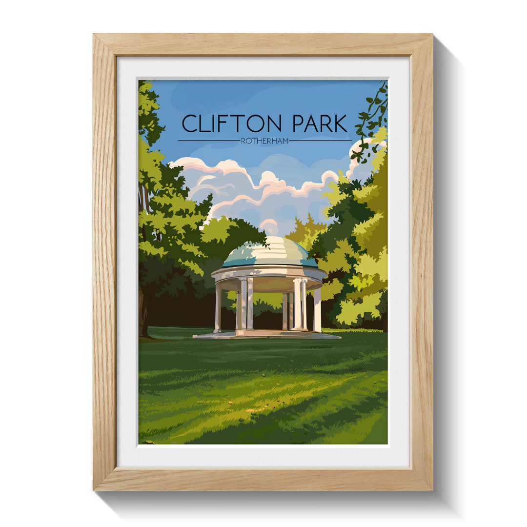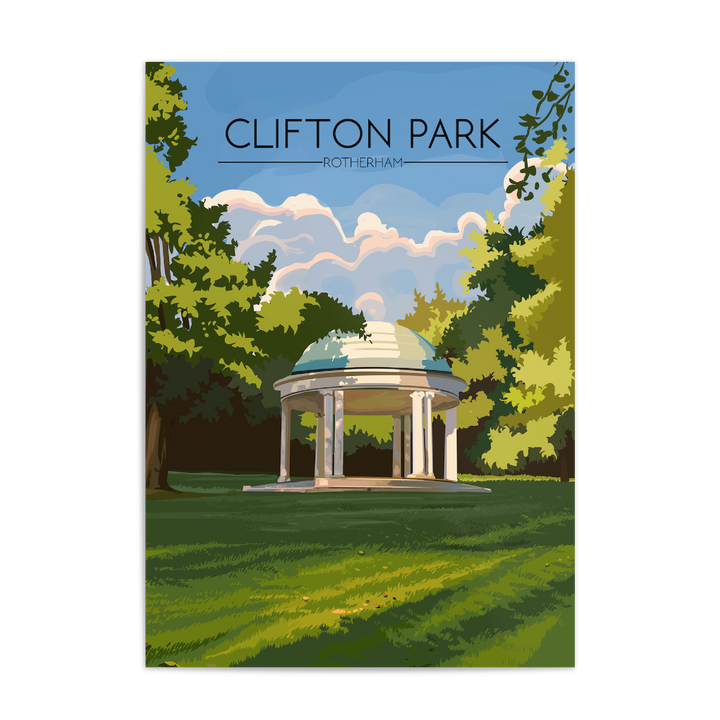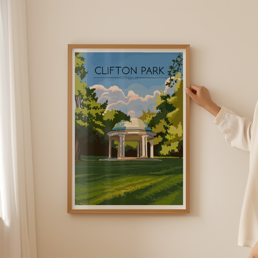 An original travel poster of Clifton Park in Rotherham featuring the charming bandstand. Known for its beautiful gardens and recreational activities, the park offers a perfect spot for relaxation and family outings.