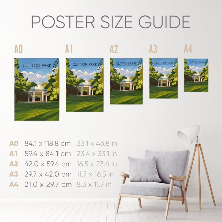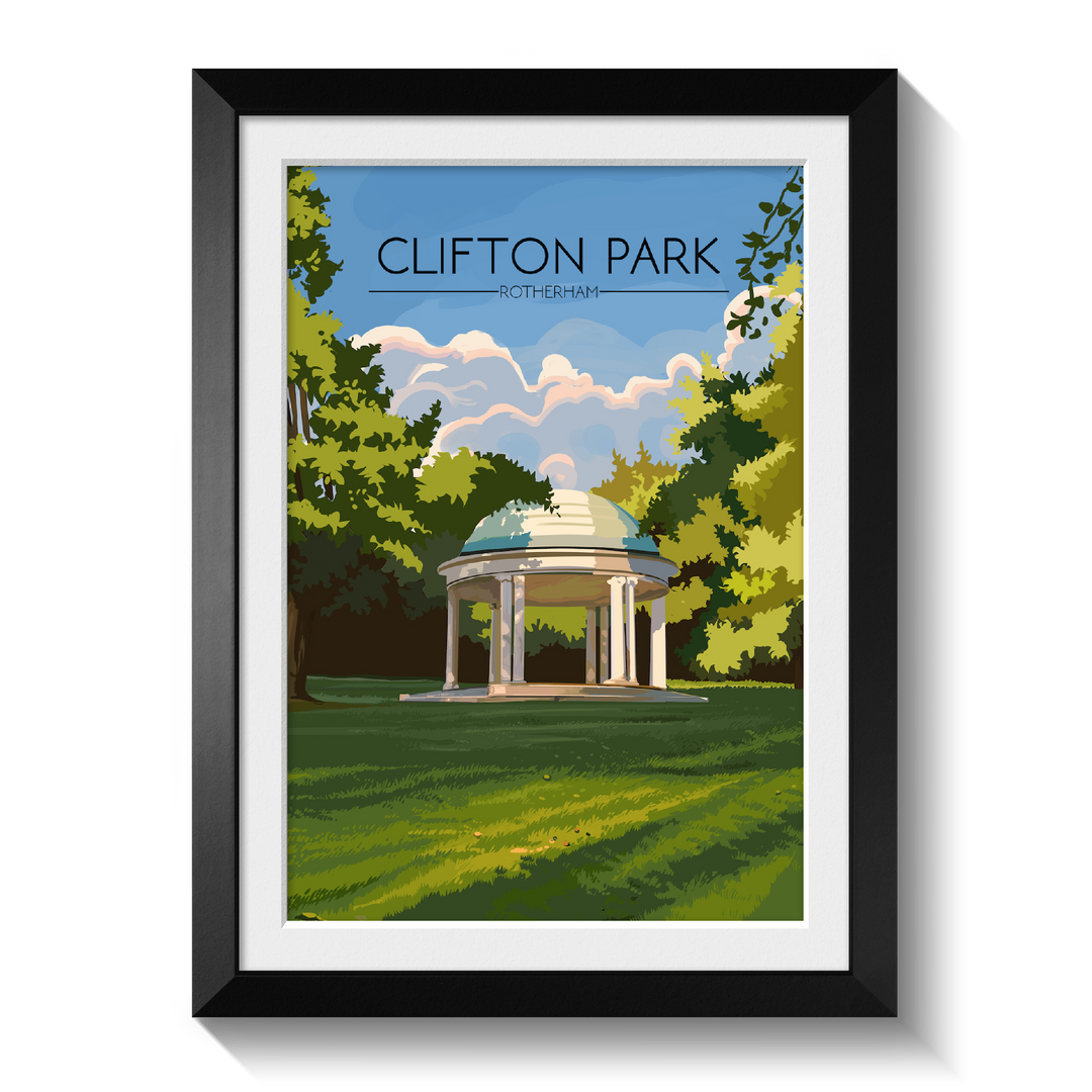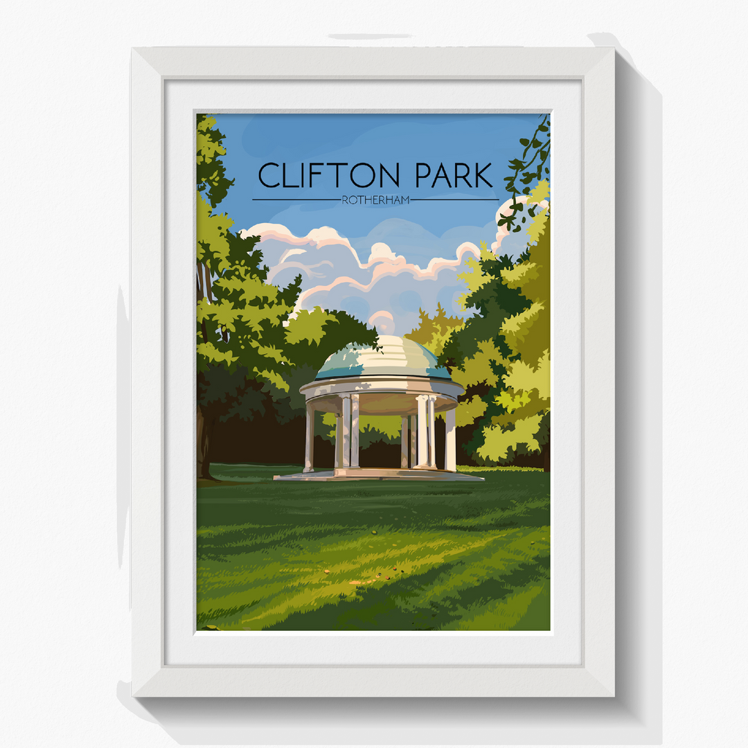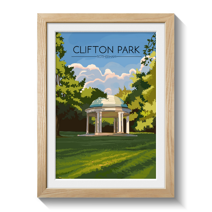 An original travel poster of Clifton Park in Rotherham featuring the charming bandstand. Known for its beautiful gardens and recreational activities, the park offers a perfect spot for relaxation and family outings.