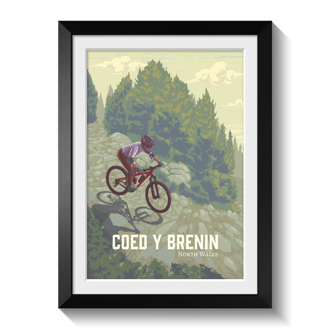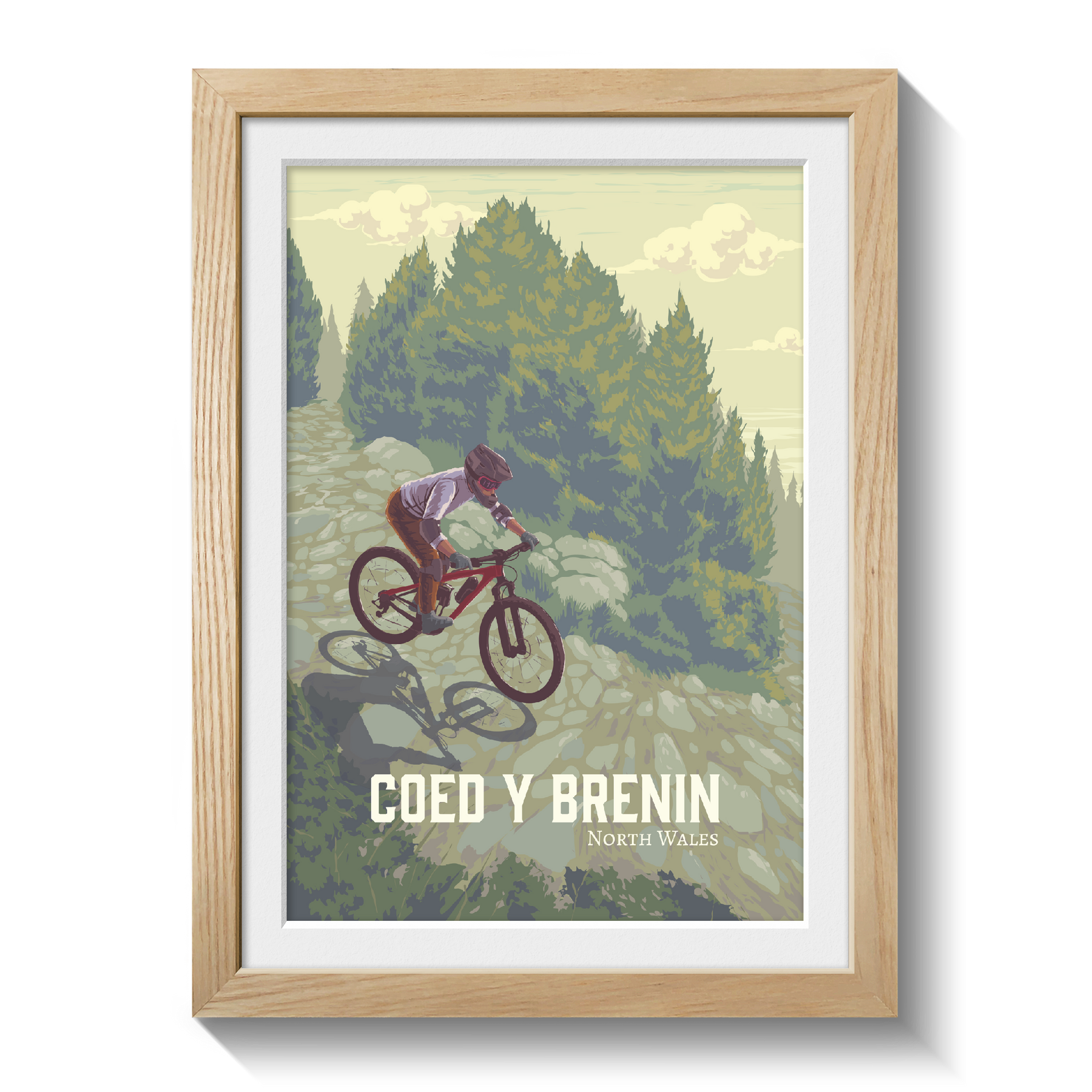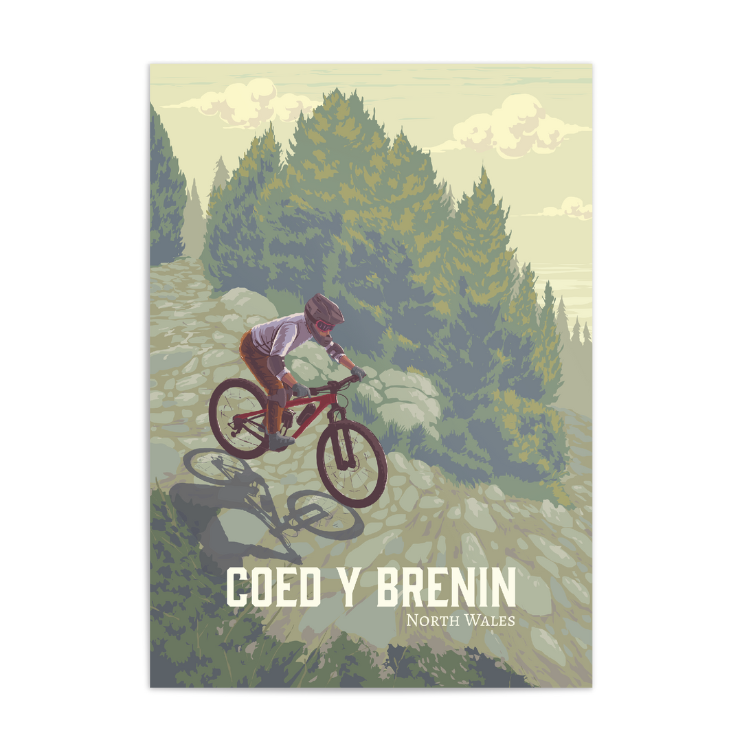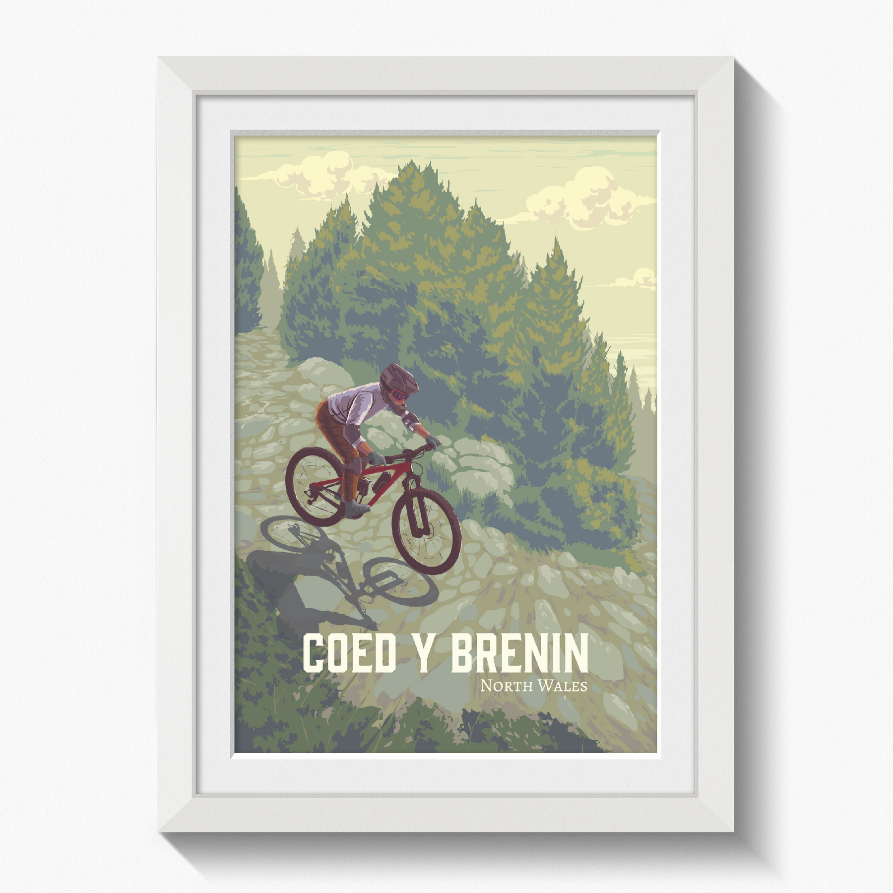 An original travel poster featuring Coed Y Brenin, a popular mountain biking area in Snowdonia, North Wales. Coed Y Brenin is the UK'™s first and largest dedicated mountain bike trail centre. It has miles of trails for riders of all abilities.
