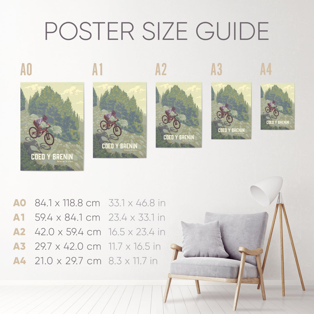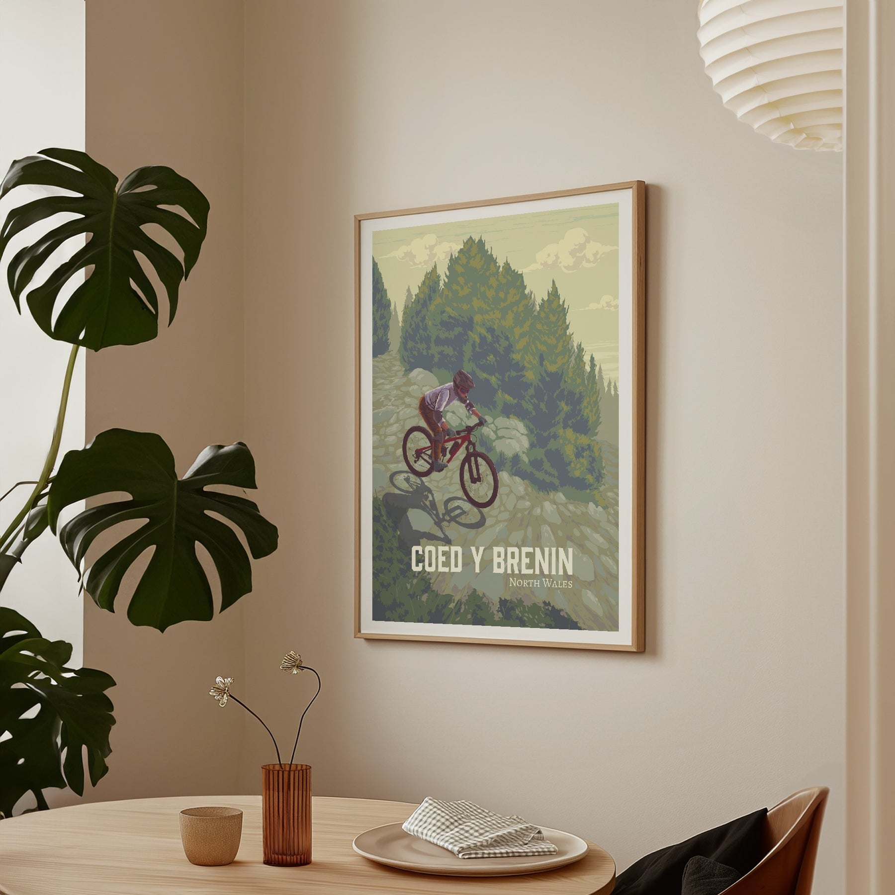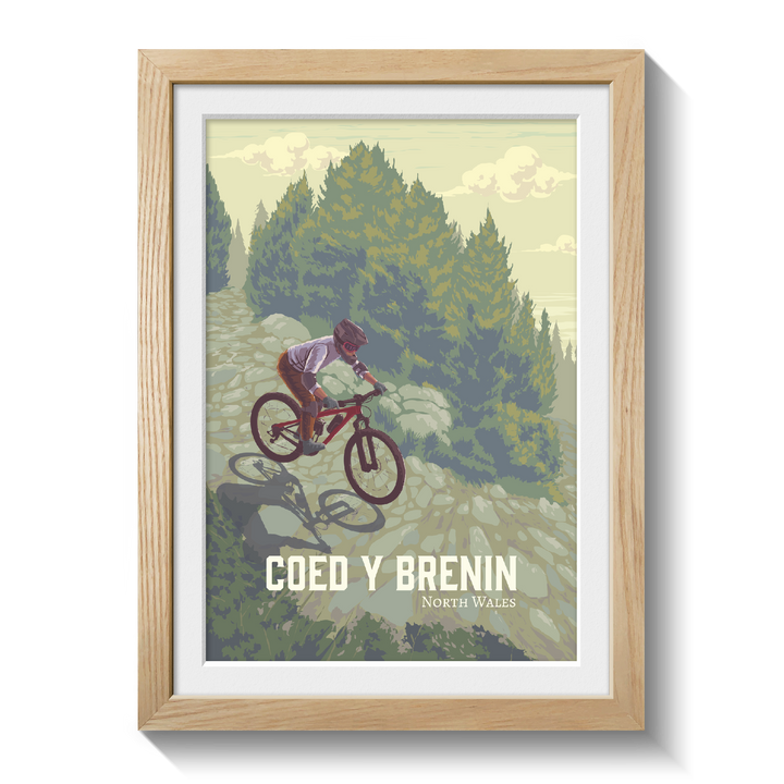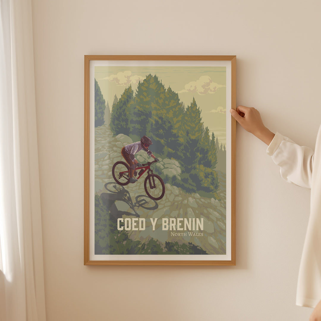 An original travel poster featuring Coed Y Brenin, a popular mountain biking area in Snowdonia, North Wales. Coed Y Brenin is the UK'™s first and largest dedicated mountain bike trail centre. It has miles of trails for riders of all abilities.