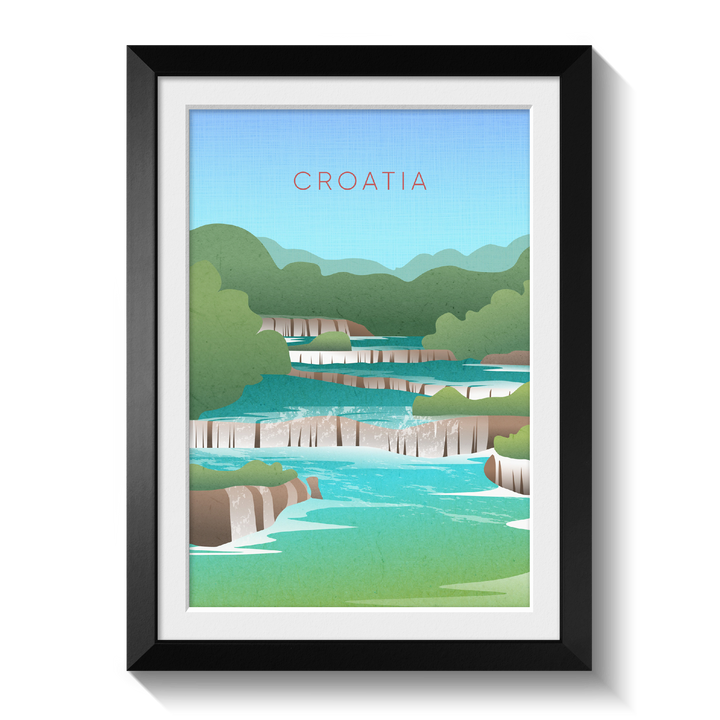 This Croatia travel poster showcases the stunning waterfalls of Krka National Park in a minimalist design. Perfect for nature lovers and adventurers, it captures the serene beauty of one of Croatia’s most famous landmarks. A stylish decor piece, celebrating the natural charm and tranquility of Croatia’s breathtaking landscapes.