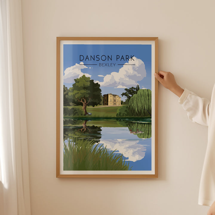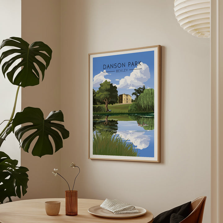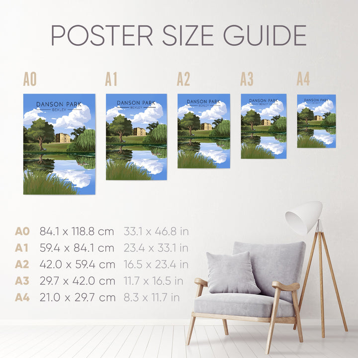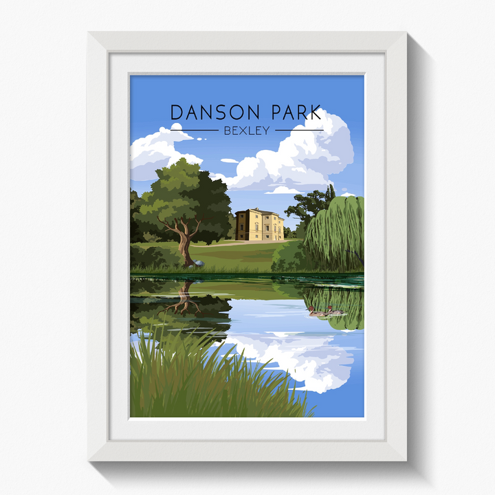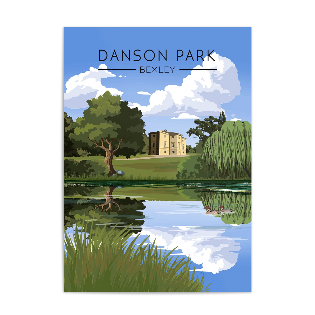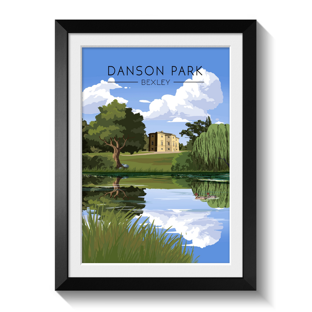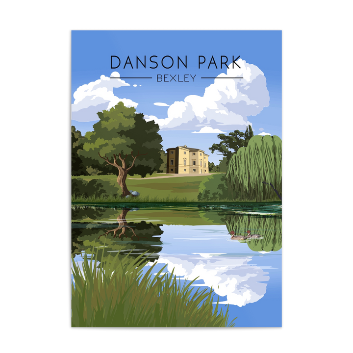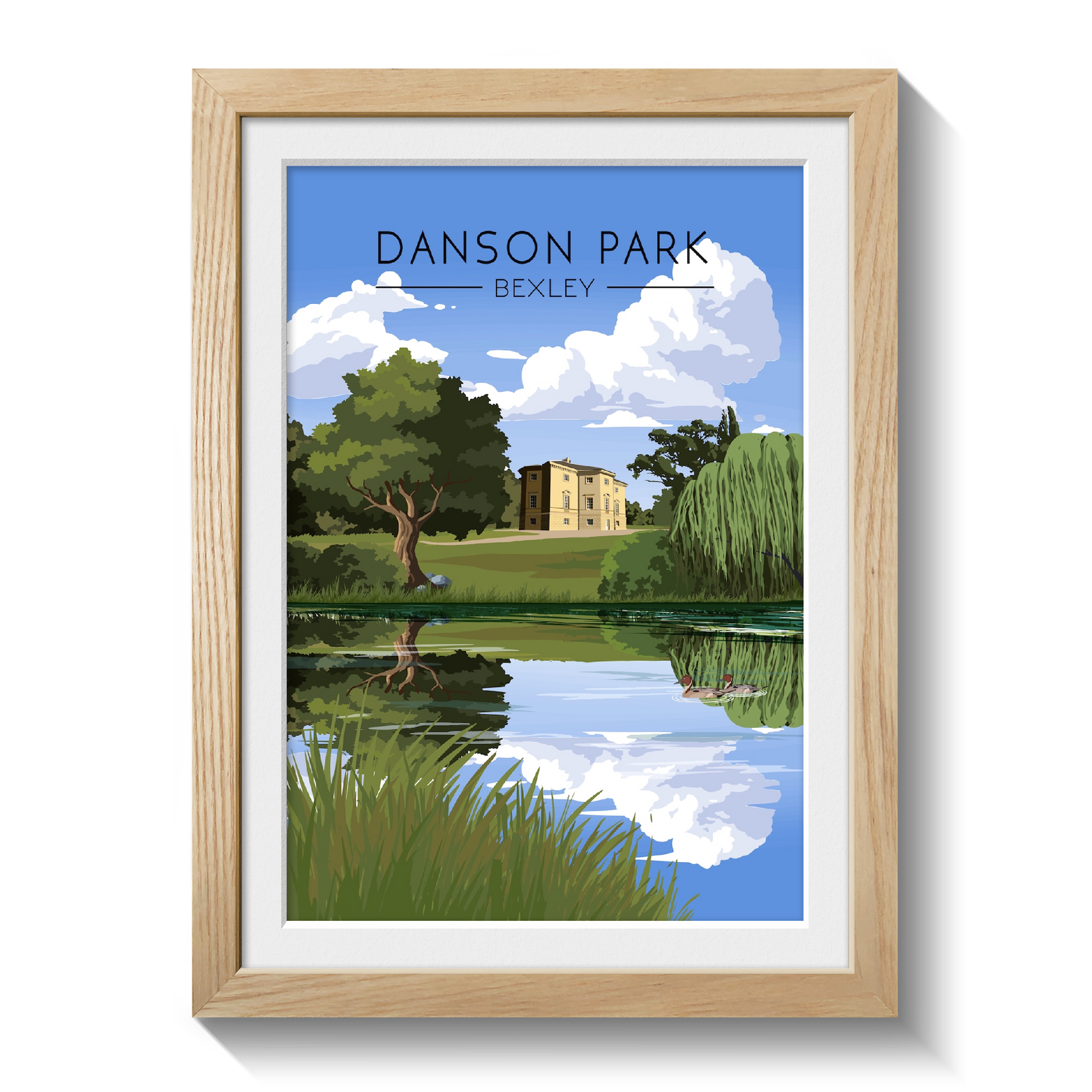 An original travel poster featuring Danson Park in the South London Borough of Bexley, located between Welling and Bexleyheath. It is the second largest public park in the borough, and is one of the best loved parks in the area.