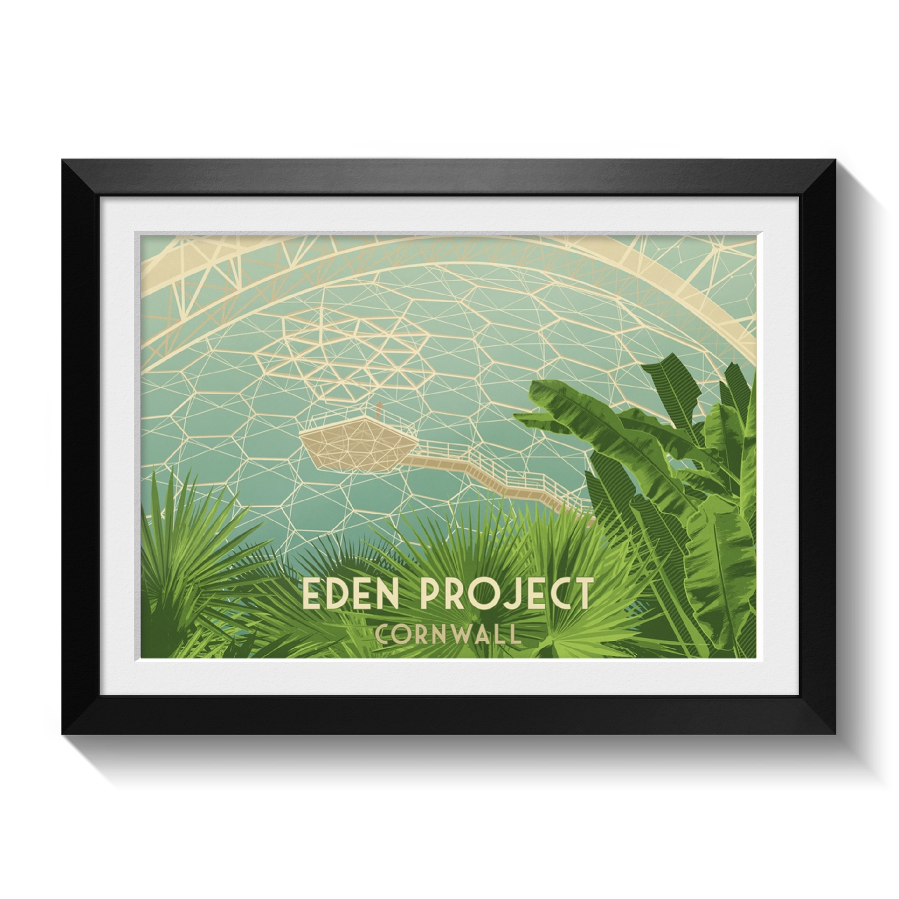 This is a travel print features an interior view of the now iconic biomes of the Eden Project in Cornwall, one of which is the largest indoor rainforest in the world.