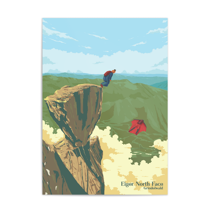 This travel poster features 2 daring wingsuit jumpers taking flight from the Eiger Mushroom in the Swiss Alps.
