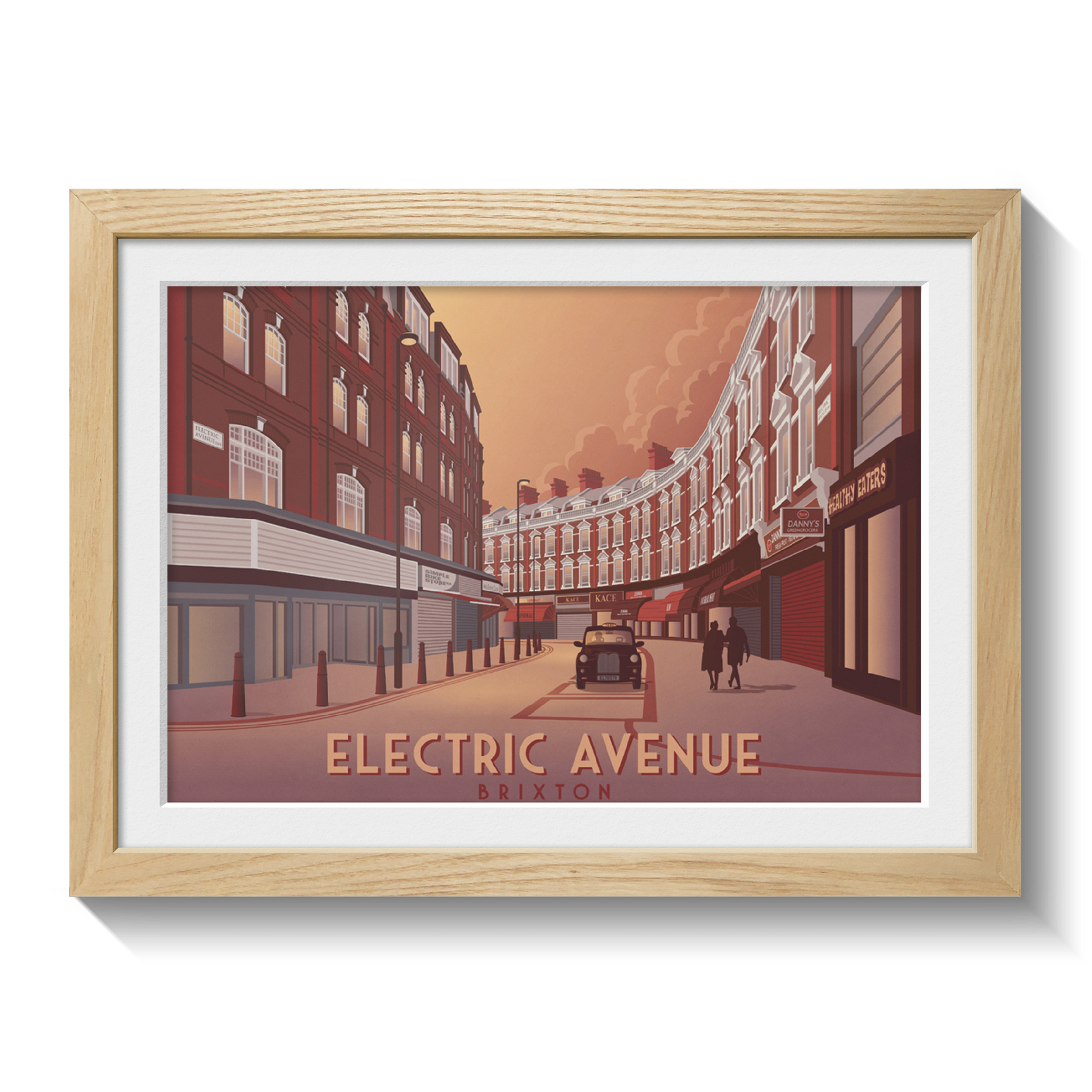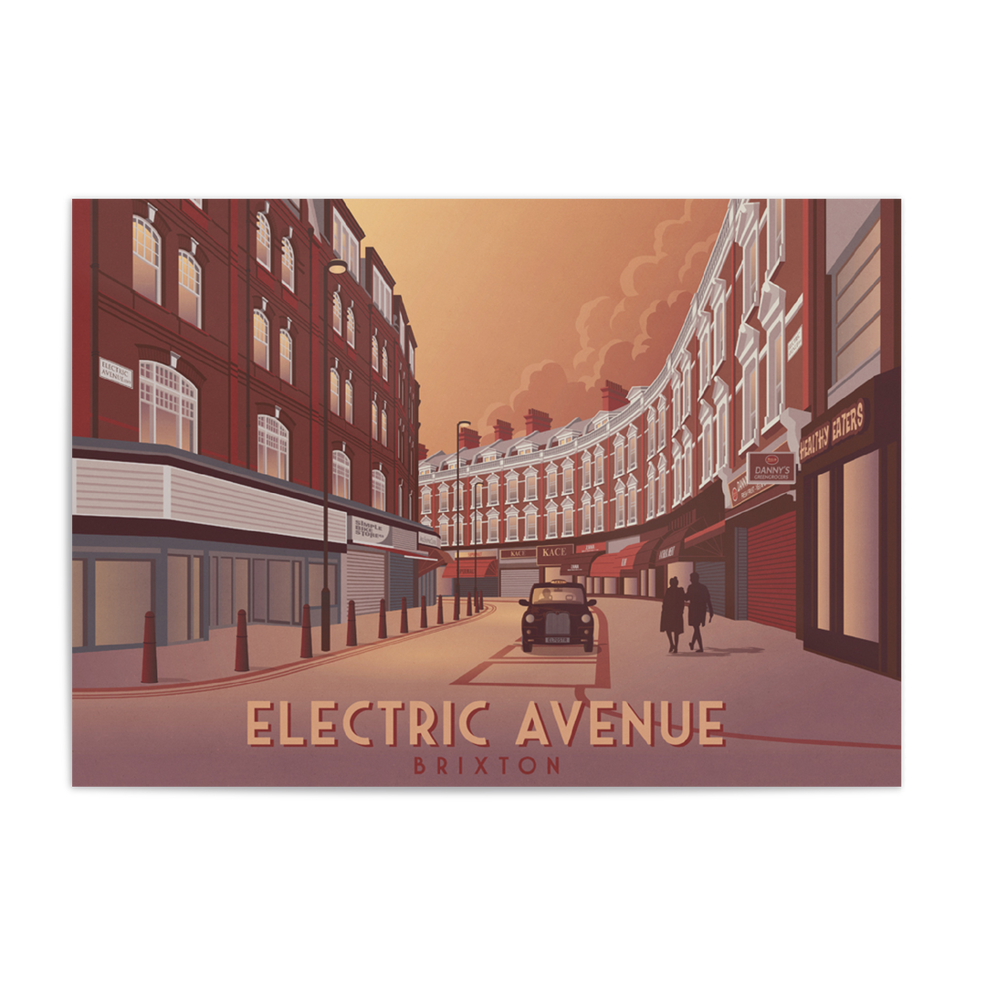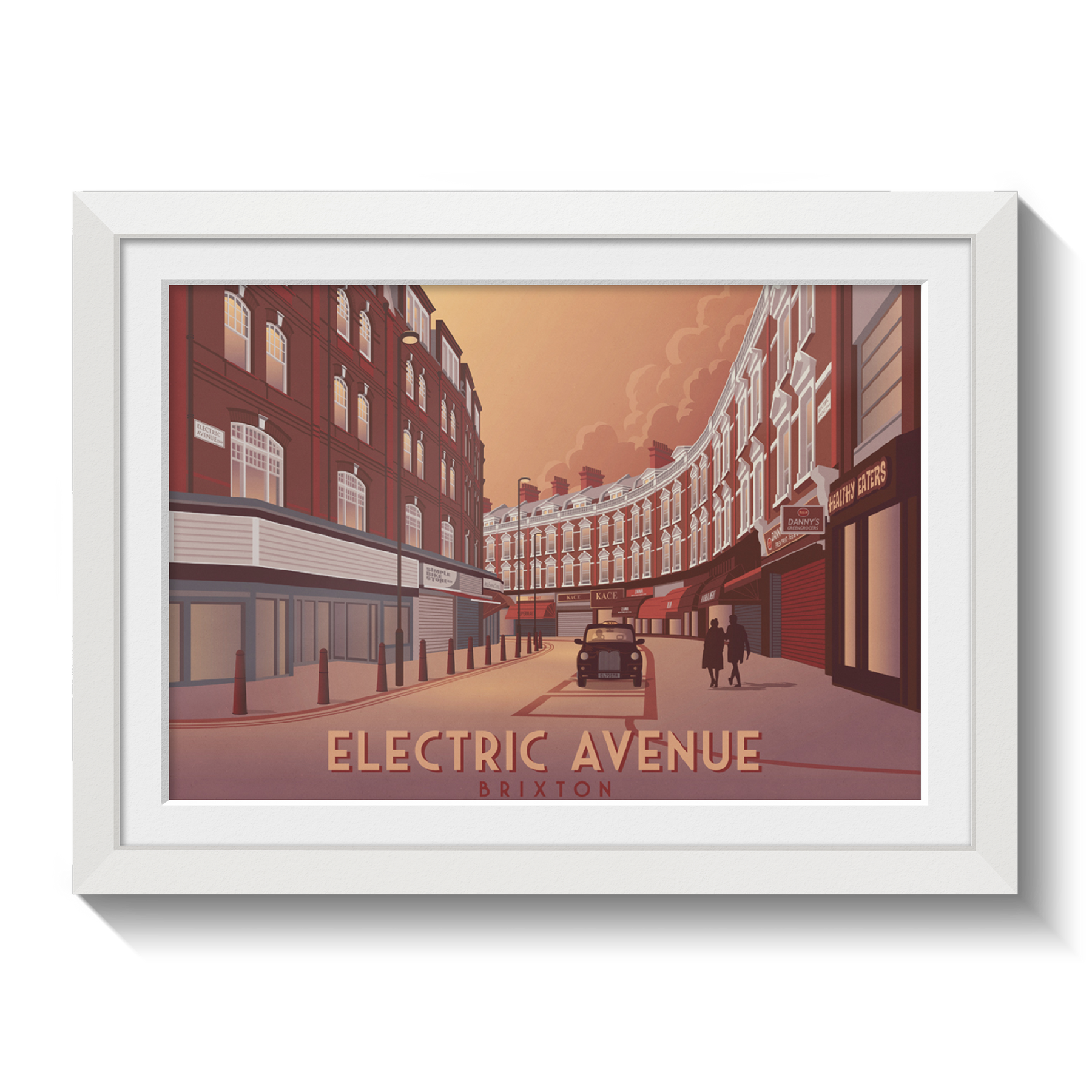 An original travel poster of the iconic Electric Avenue in South London's Brixton, known from the Eddy Grant song of the same name.