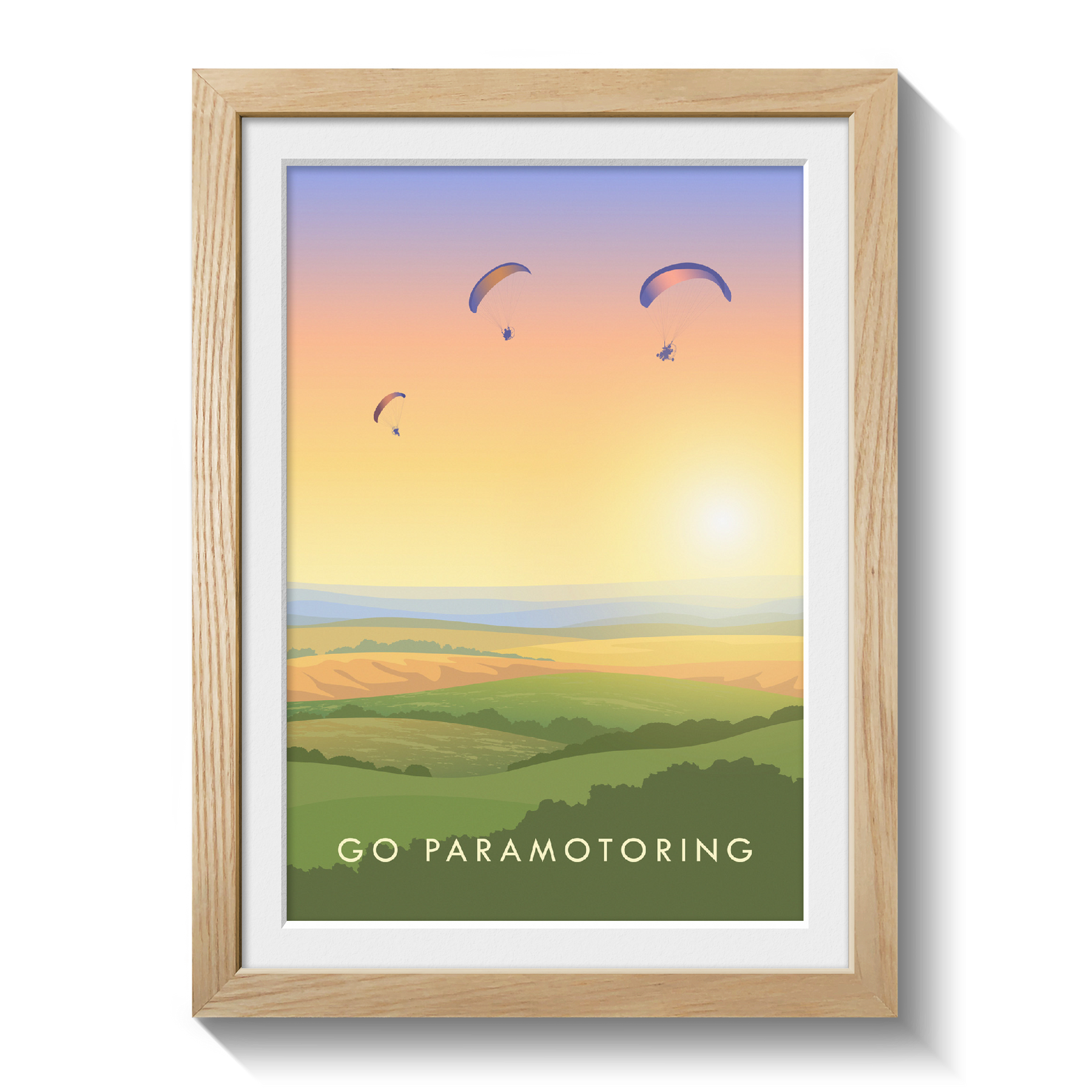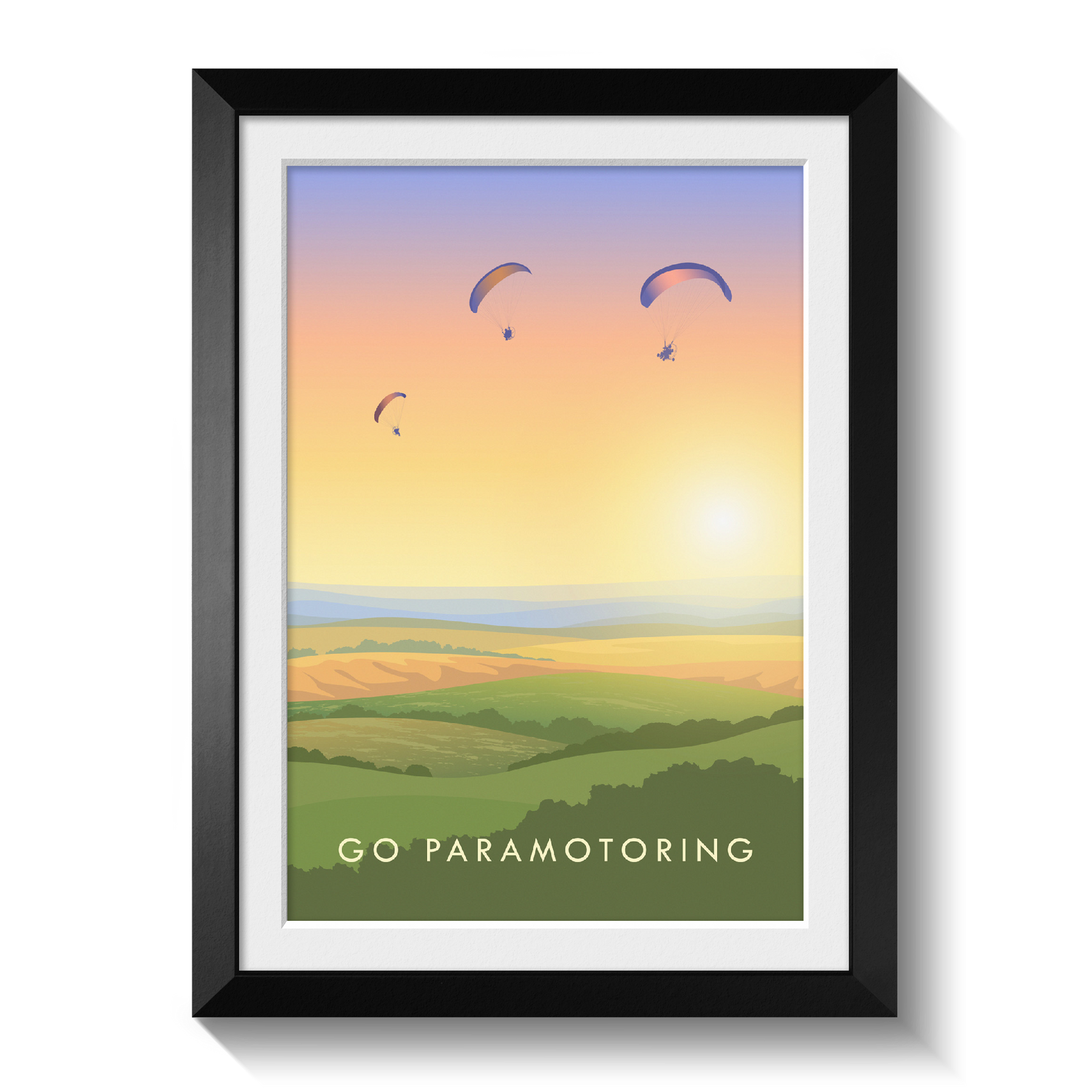 This is an original travel poster celebrating the popular outdoor hobby of Paramotoring. A perfect gift for the adventurous paraglider in your life or a great way to celebrate your love of your favourite adventurous pursuit.