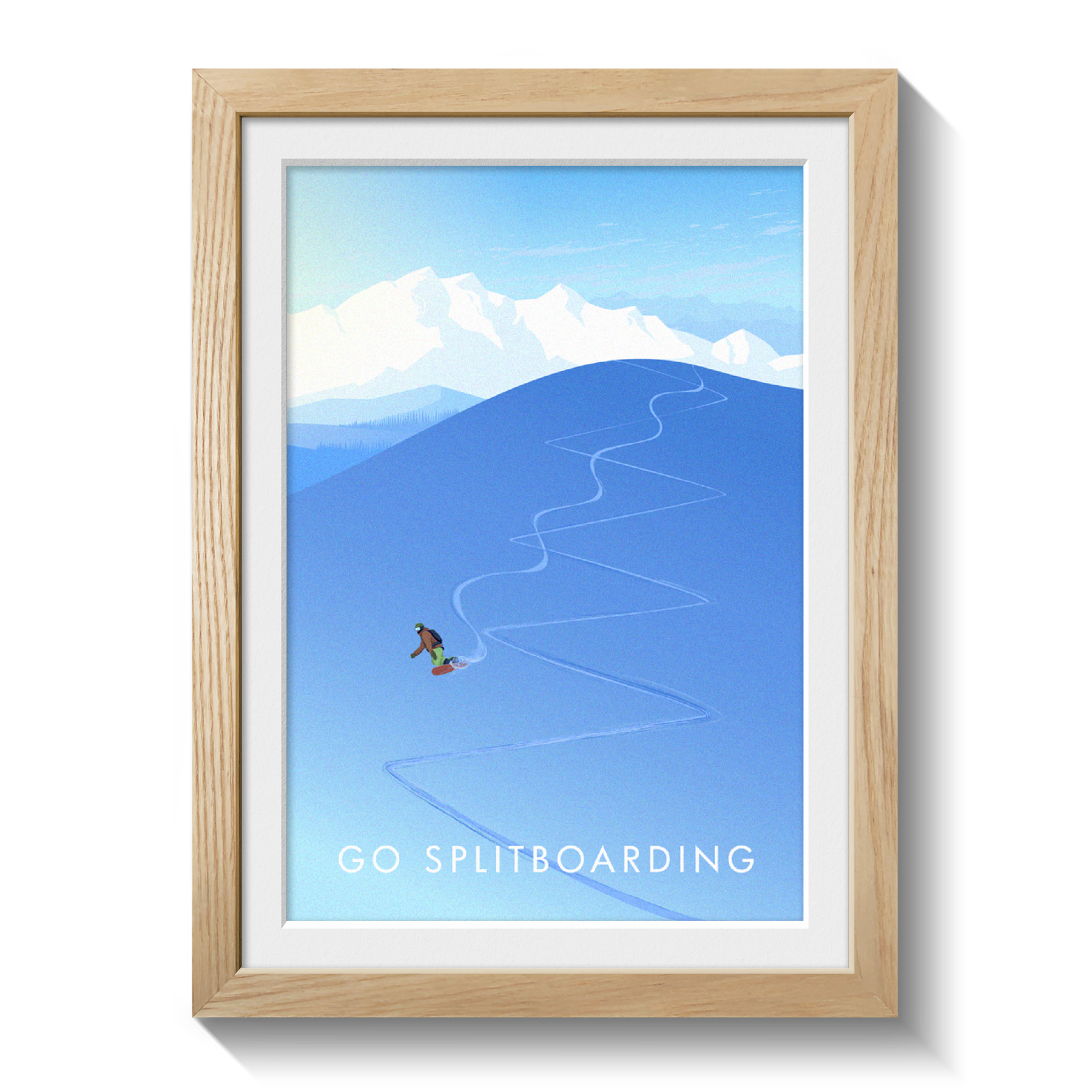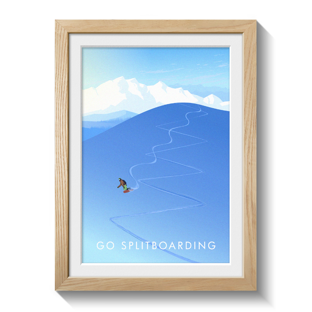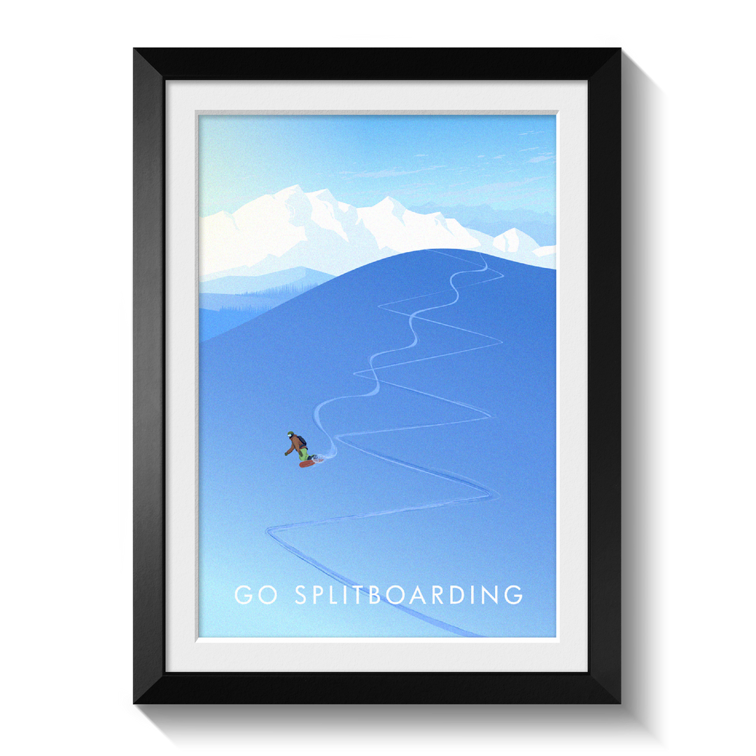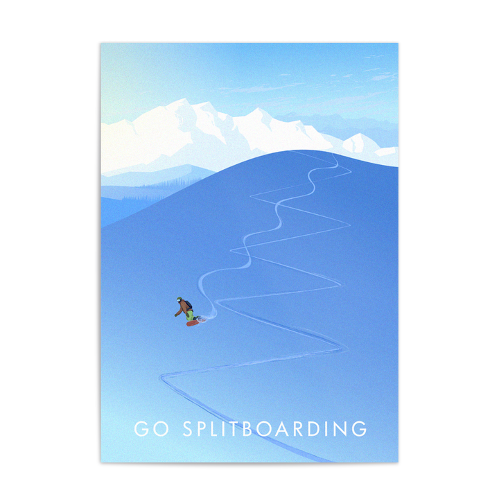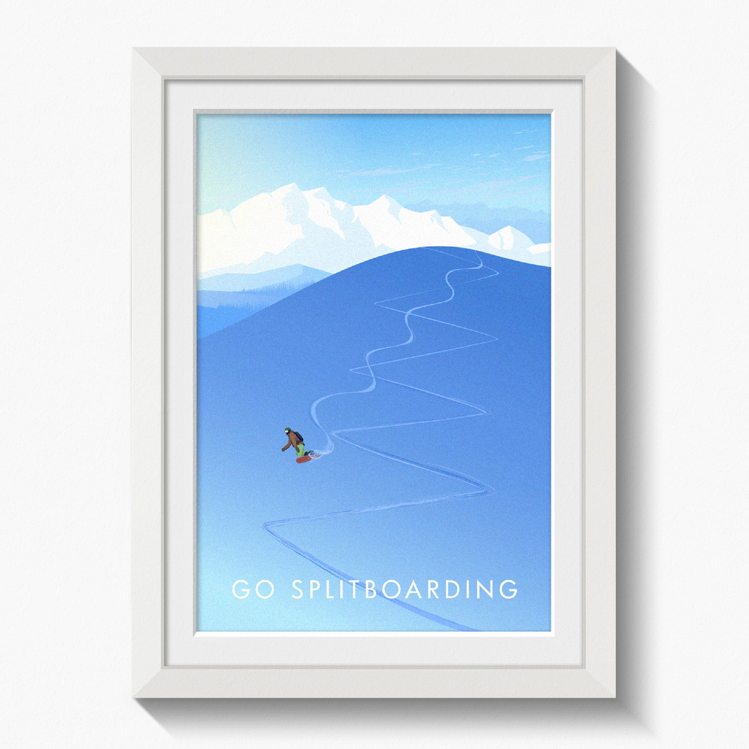 This is an original travel poster celebrating the winter sport of splitboarding, the snowboarder's alternative to ski touring. A perfect gift for the splitboarder or snowboarder in your life or a great way to celebrate your love of your favourite adventurous pursuit.