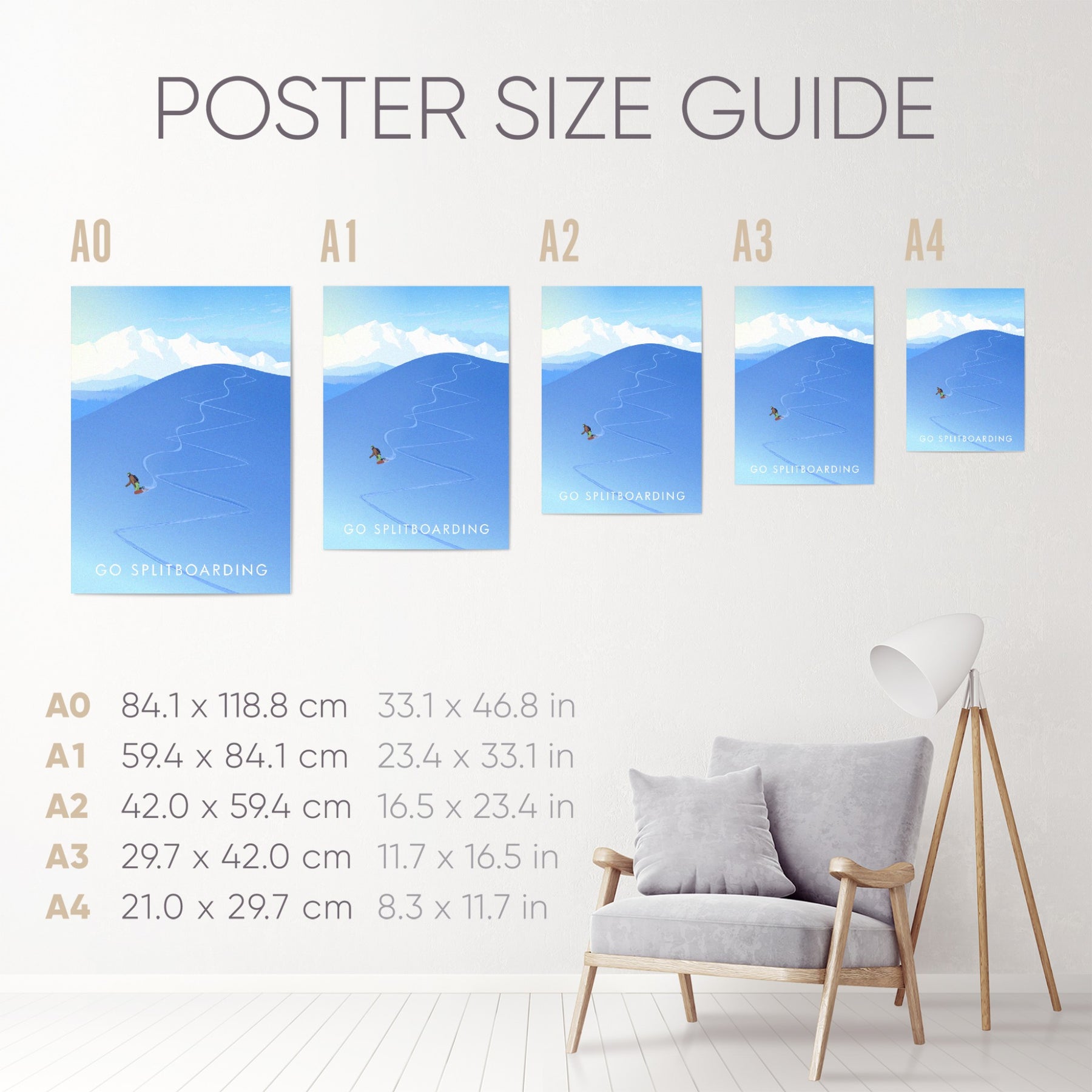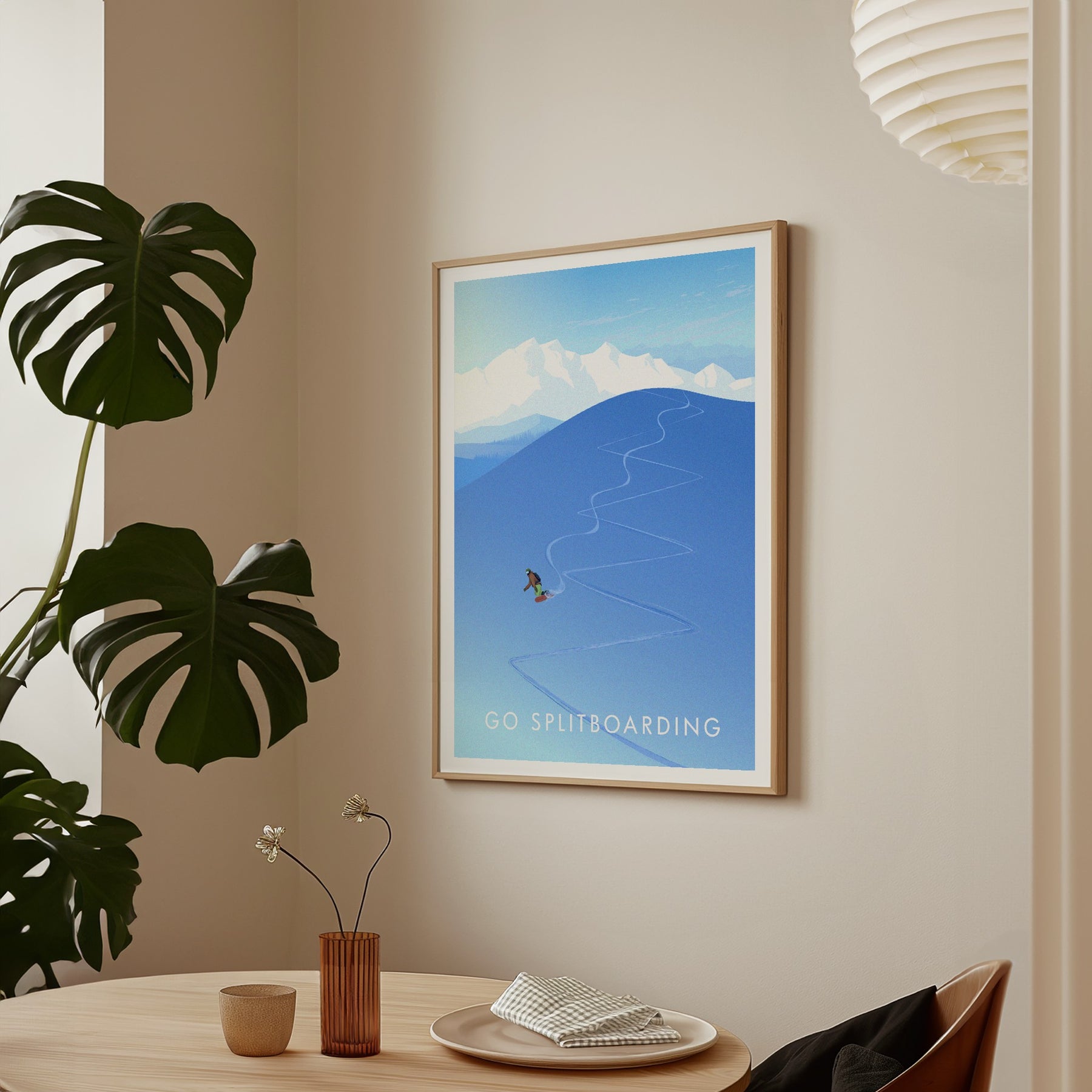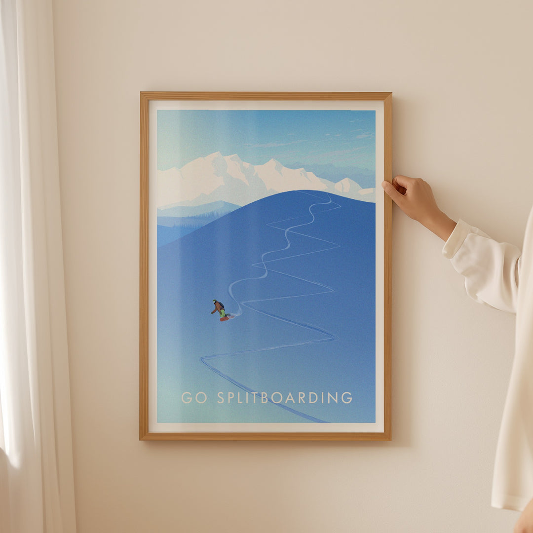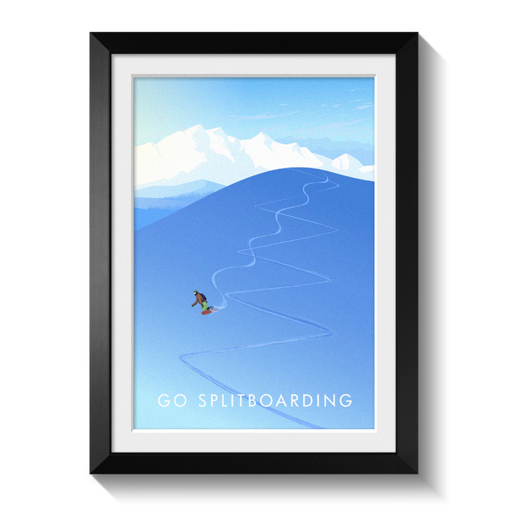This is an original travel poster celebrating the winter sport of splitboarding, the snowboarder's alternative to ski touring. A perfect gift for the splitboarder or snowboarder in your life or a great way to celebrate your love of your favourite adventurous pursuit.