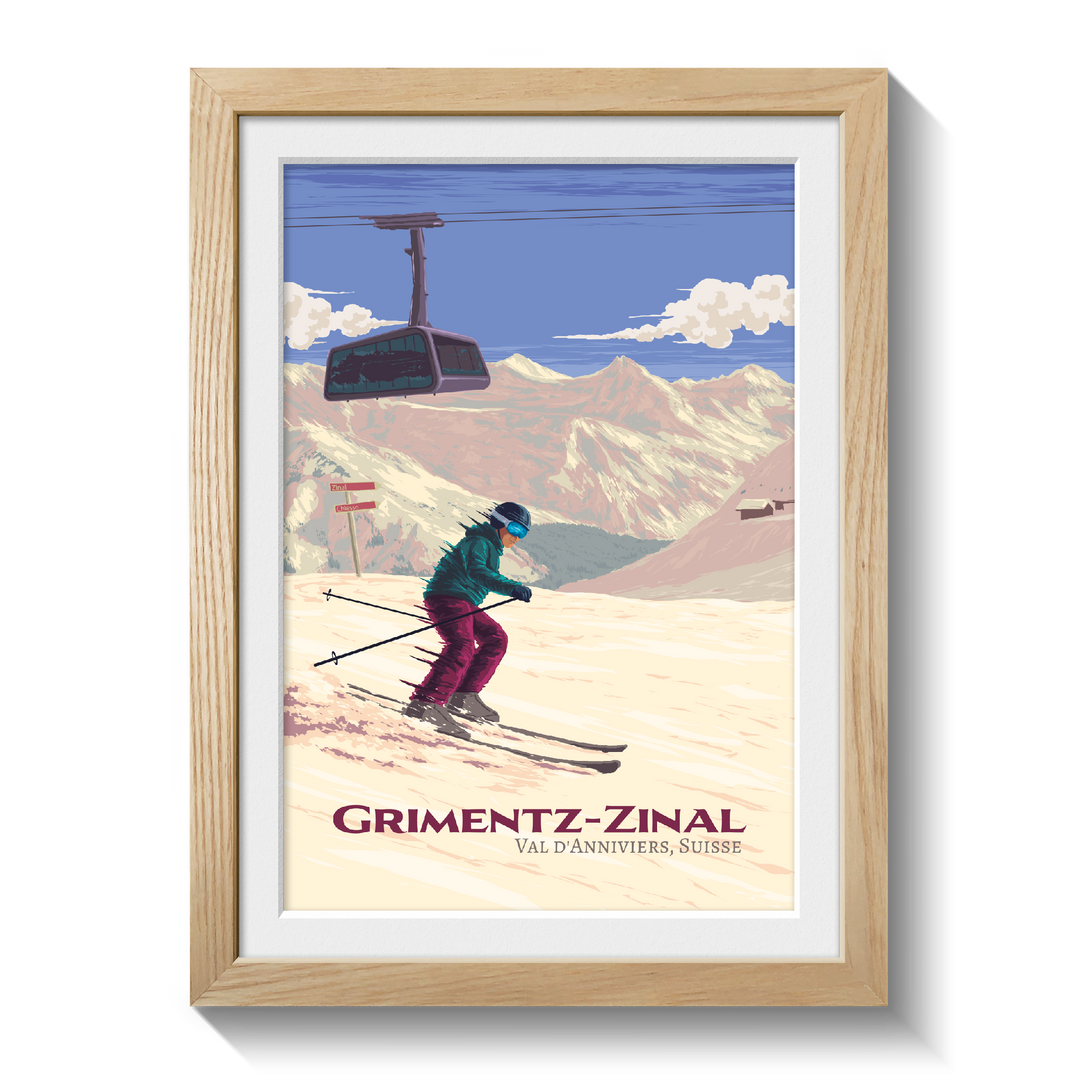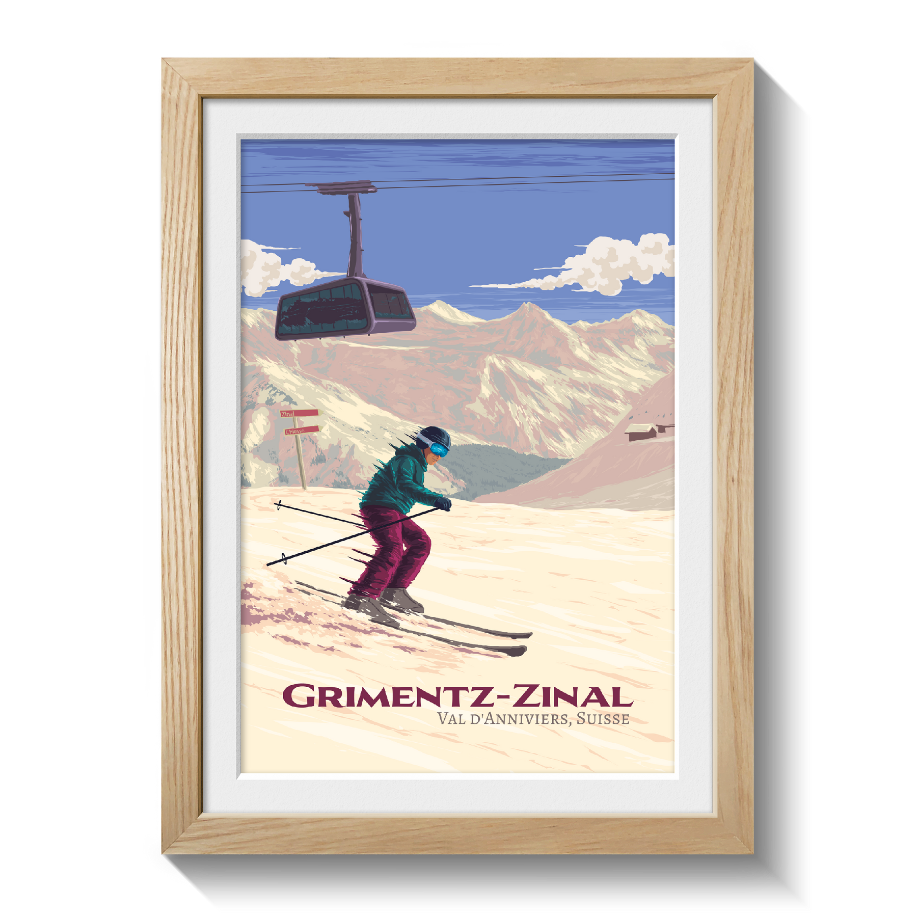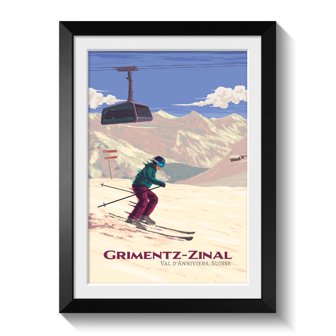 An original travel poster of the Swiss ski resort of Grimentz-Zinal. Formerly 2 separate resorts, the recently installed 3k Sorebois 3km cable car has linked Grimentz and Zinal together to create a larger ski area.