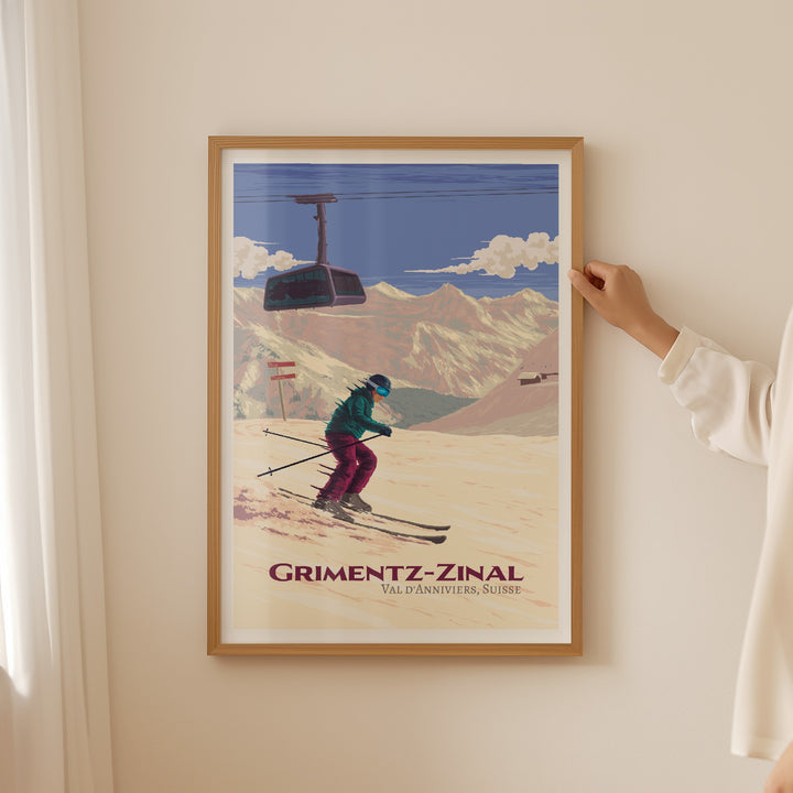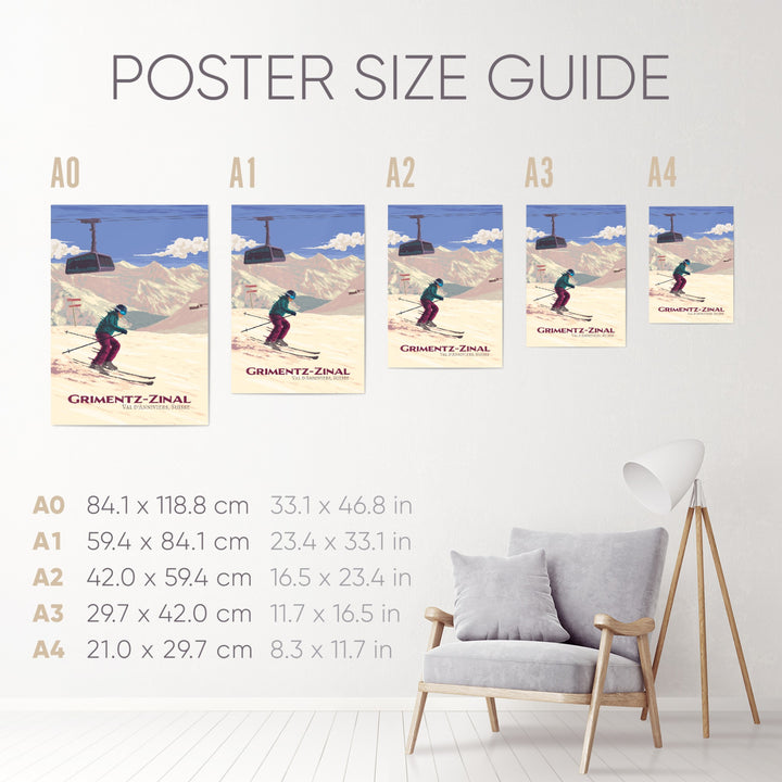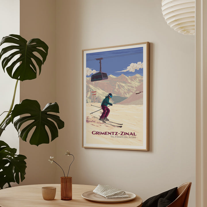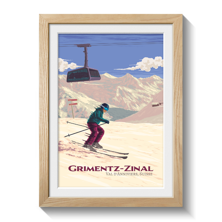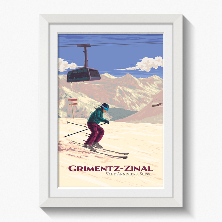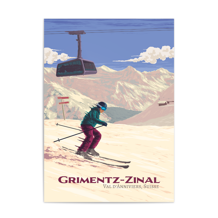 An original travel poster of the Swiss ski resort of Grimentz-Zinal. Formerly 2 separate resorts, the recently installed 3k Sorebois 3km cable car has linked Grimentz and Zinal together to create a larger ski area.