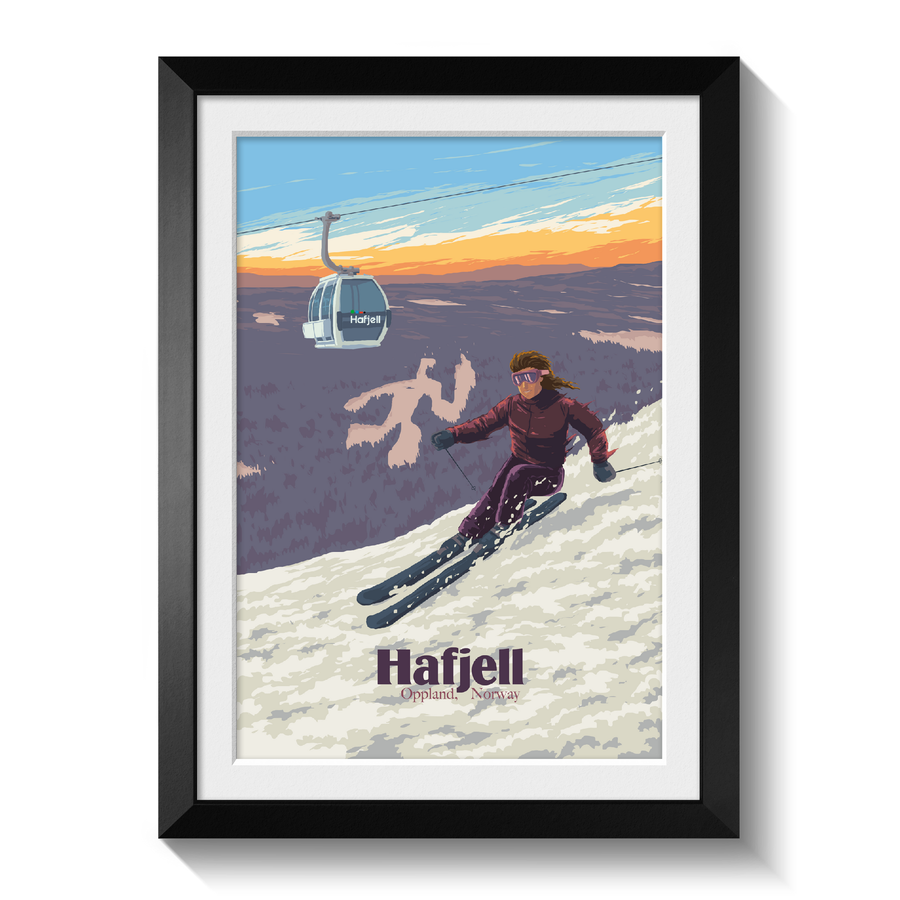 This is an original travel poster featuring the Norwegian ski resort of Hafjell Alpinsenter. Hafjell is one of the major ski resorts in Norway and during the 1994 Winter Olympics the alpine skiing technical events were held here. To commemorate this, the 'Torch Man' was created on the slopes of Hafjell and is visible from all over the mountain.