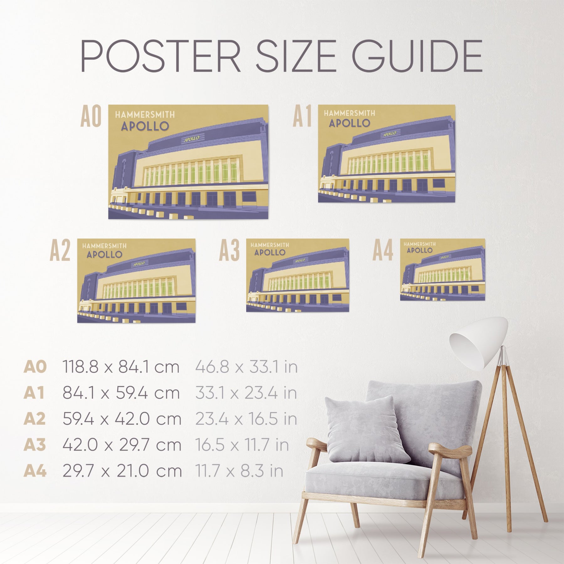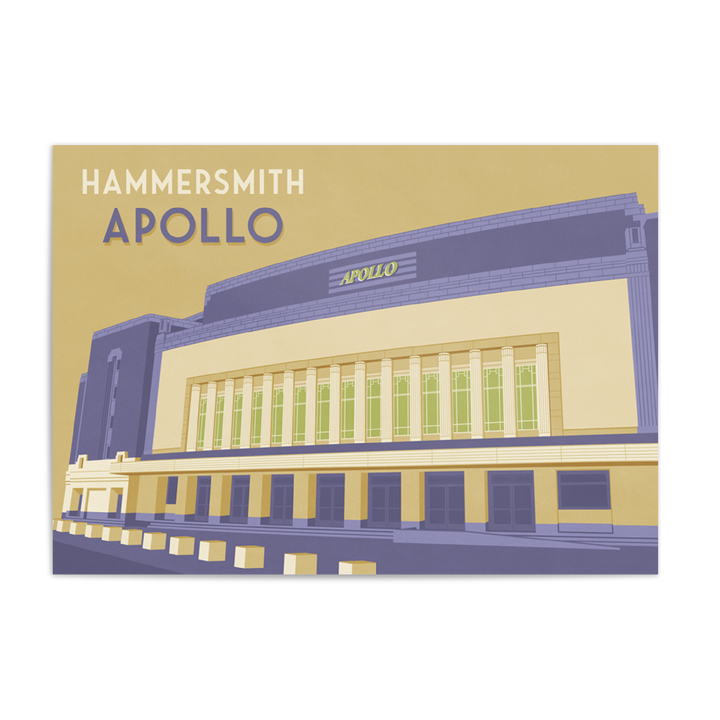 An original travel poster featuring the iconic art deco music venue, the Hammersmith Apollo in West London, home to the famous Live at the Apollo comedy nights.
