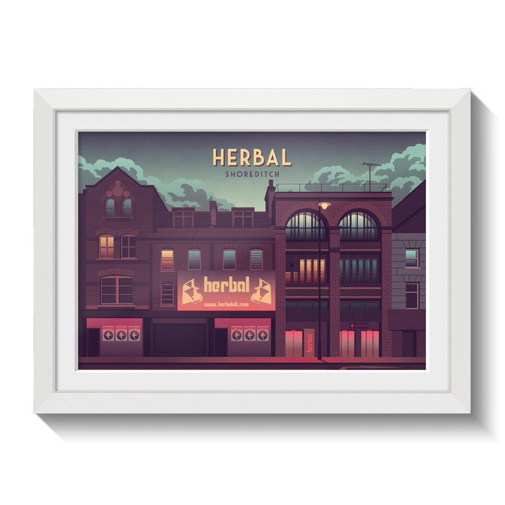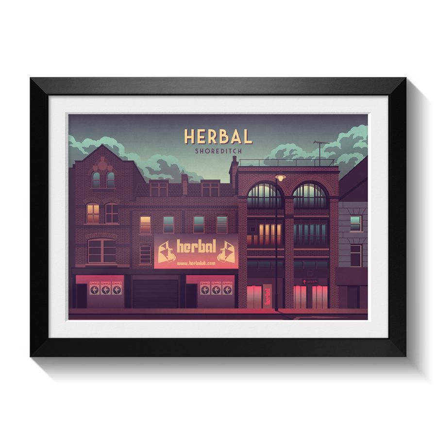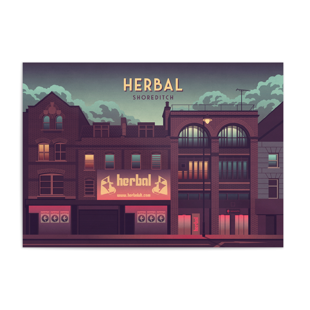 An original travel poster featuring the now sadly closed London nightclub 'Herbal'. Herbal was open on Kingsland Road from 2000 - 2009. This exposed brick warehouse club hosted a slew of big name DJs over the years and paved the way for many clubs to follow.