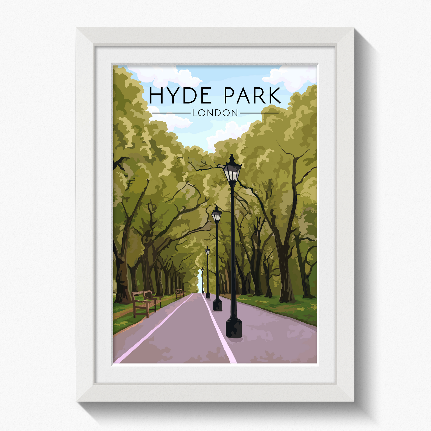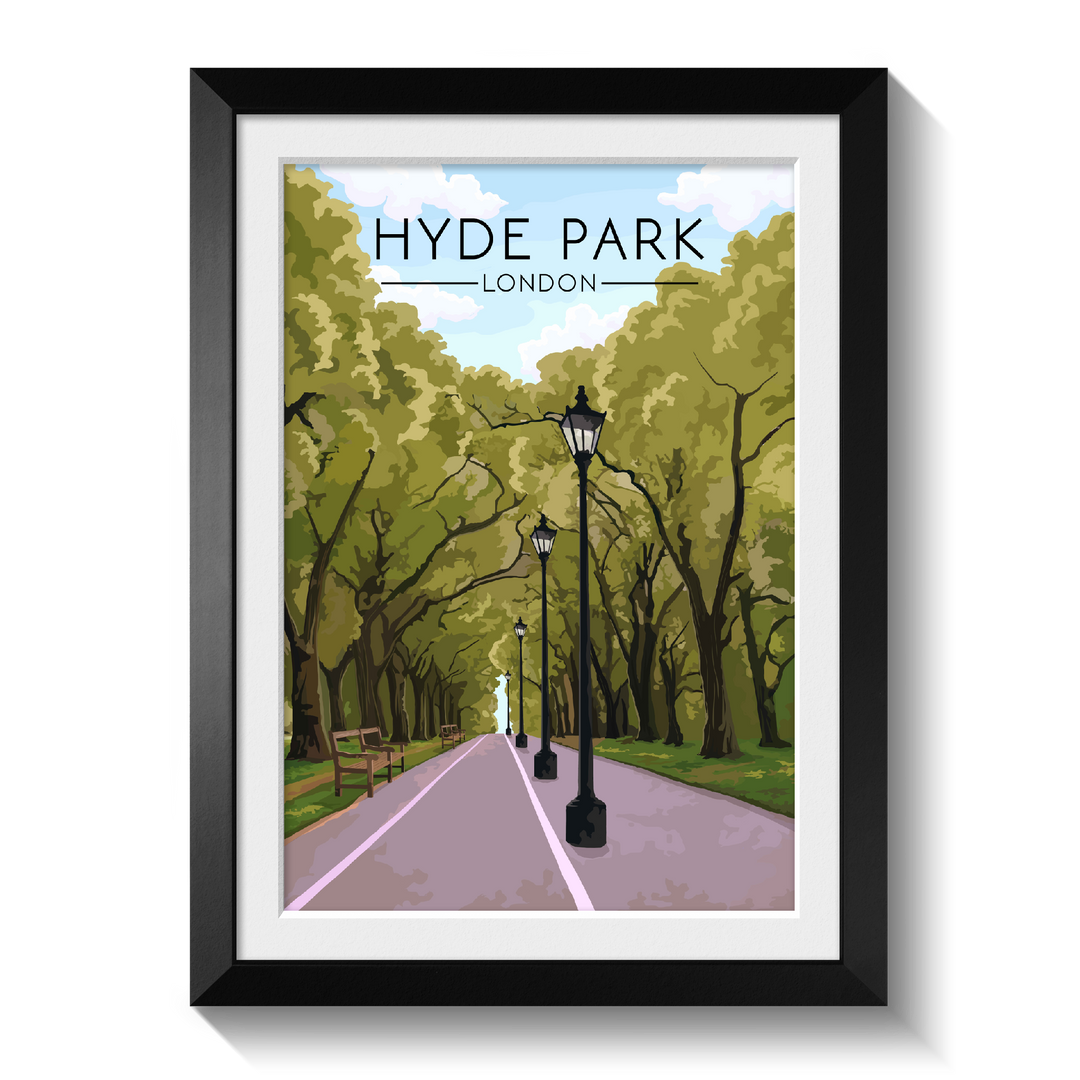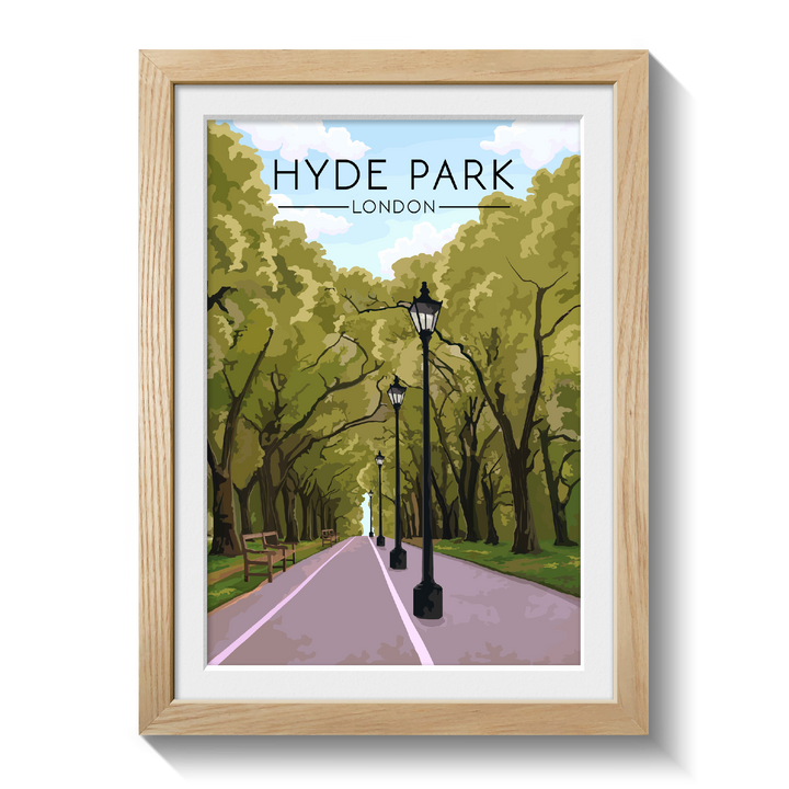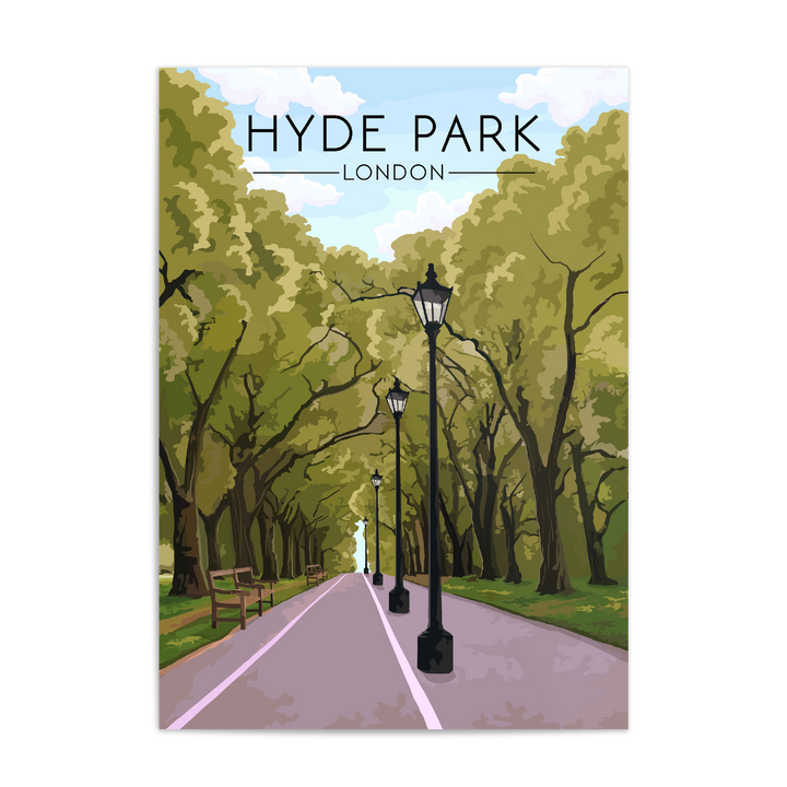 A full colour print featuring a typical Hyde Park scene. It features a picturesque pathway through the park lined by trees and park benches.