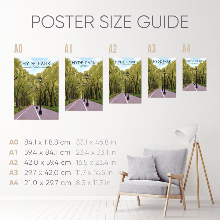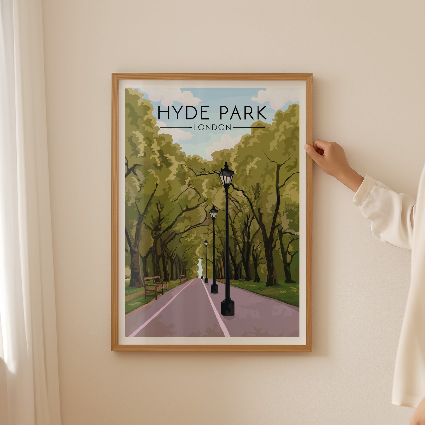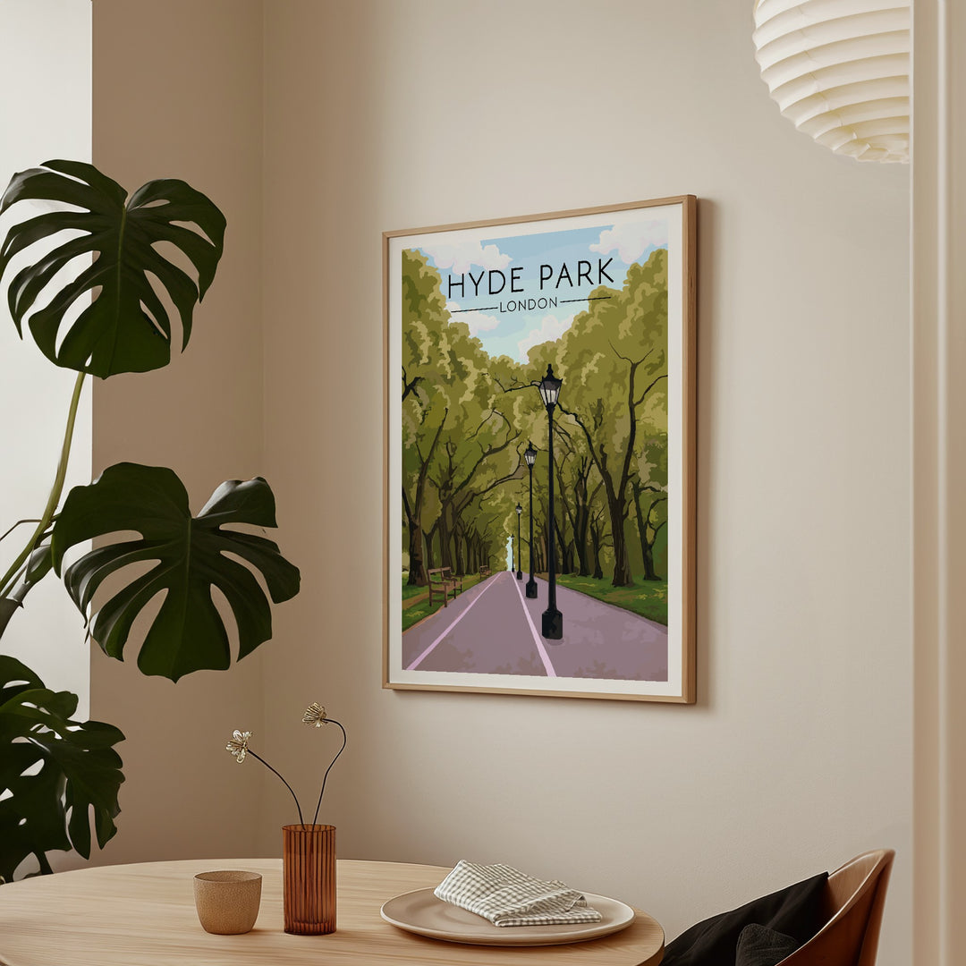 A full colour print featuring a typical Hyde Park scene. It features a picturesque pathway through the park lined by trees and park benches.