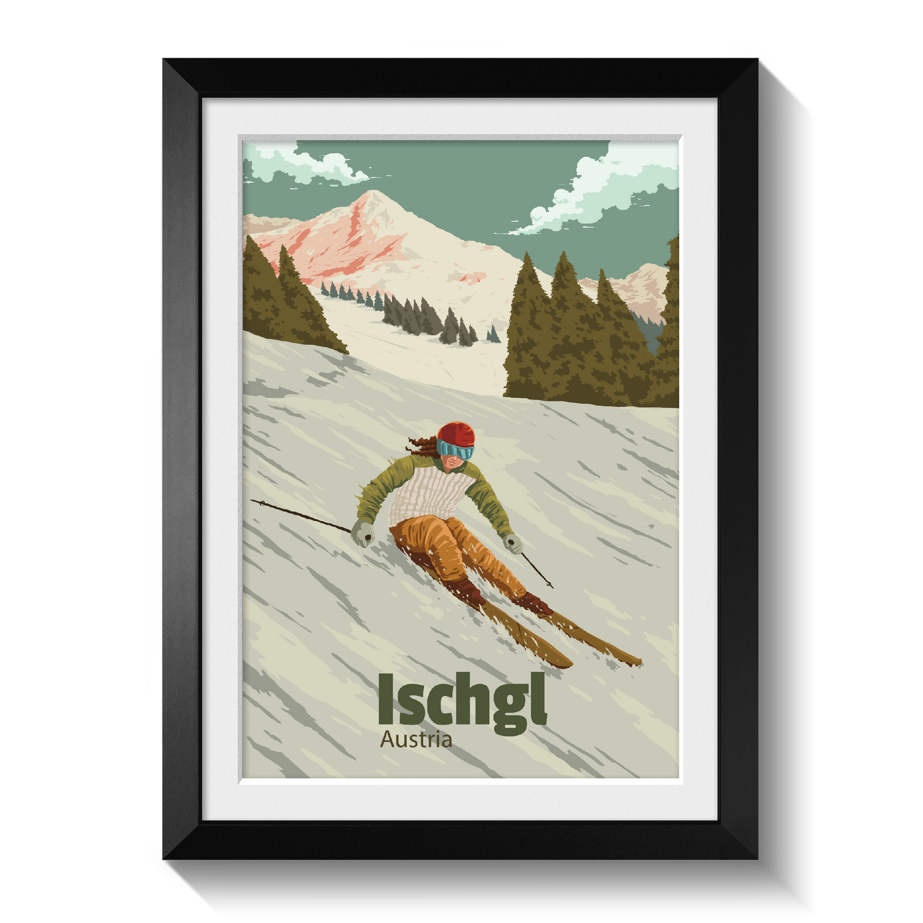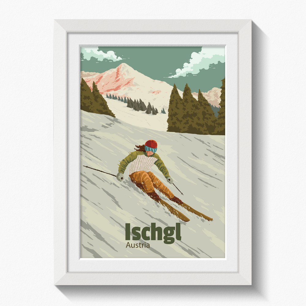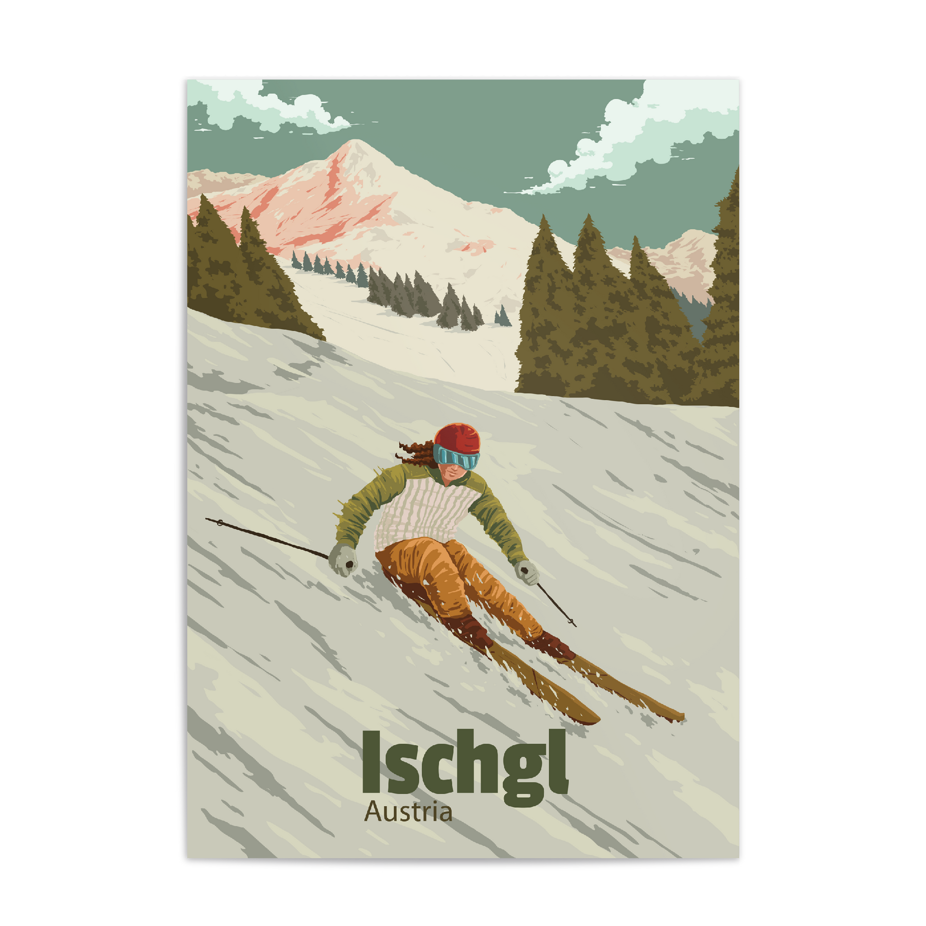 This is an original travel poster featuring the popular Austrian ski resort of Ischgl.