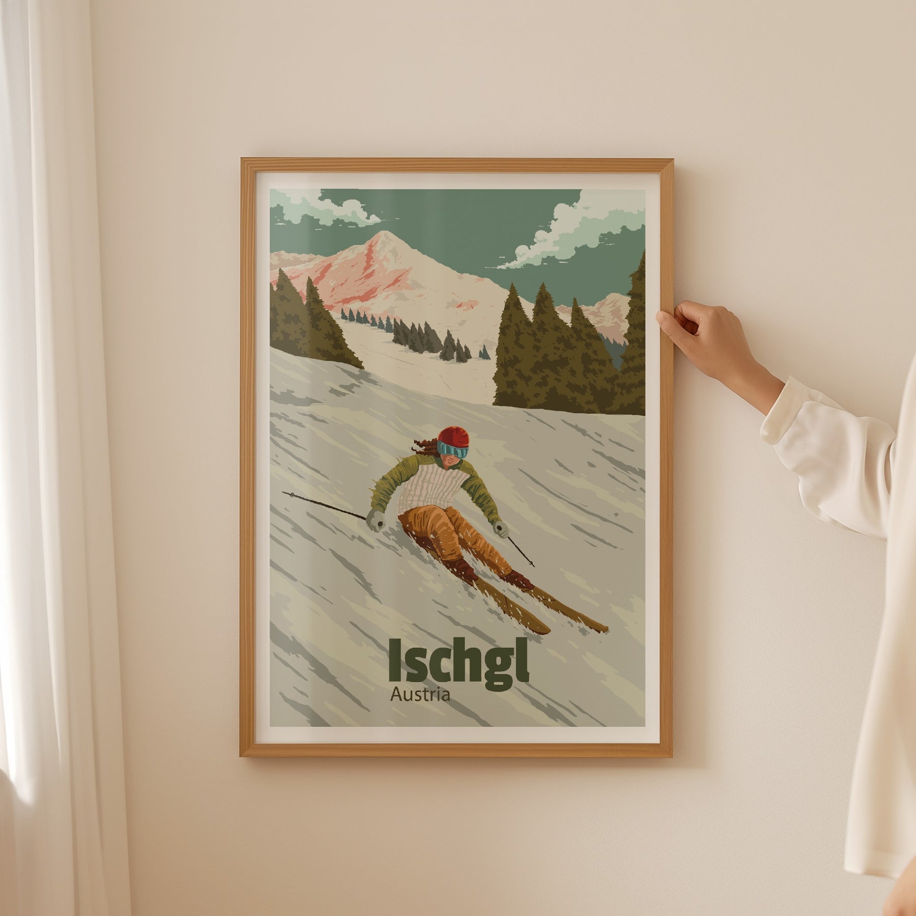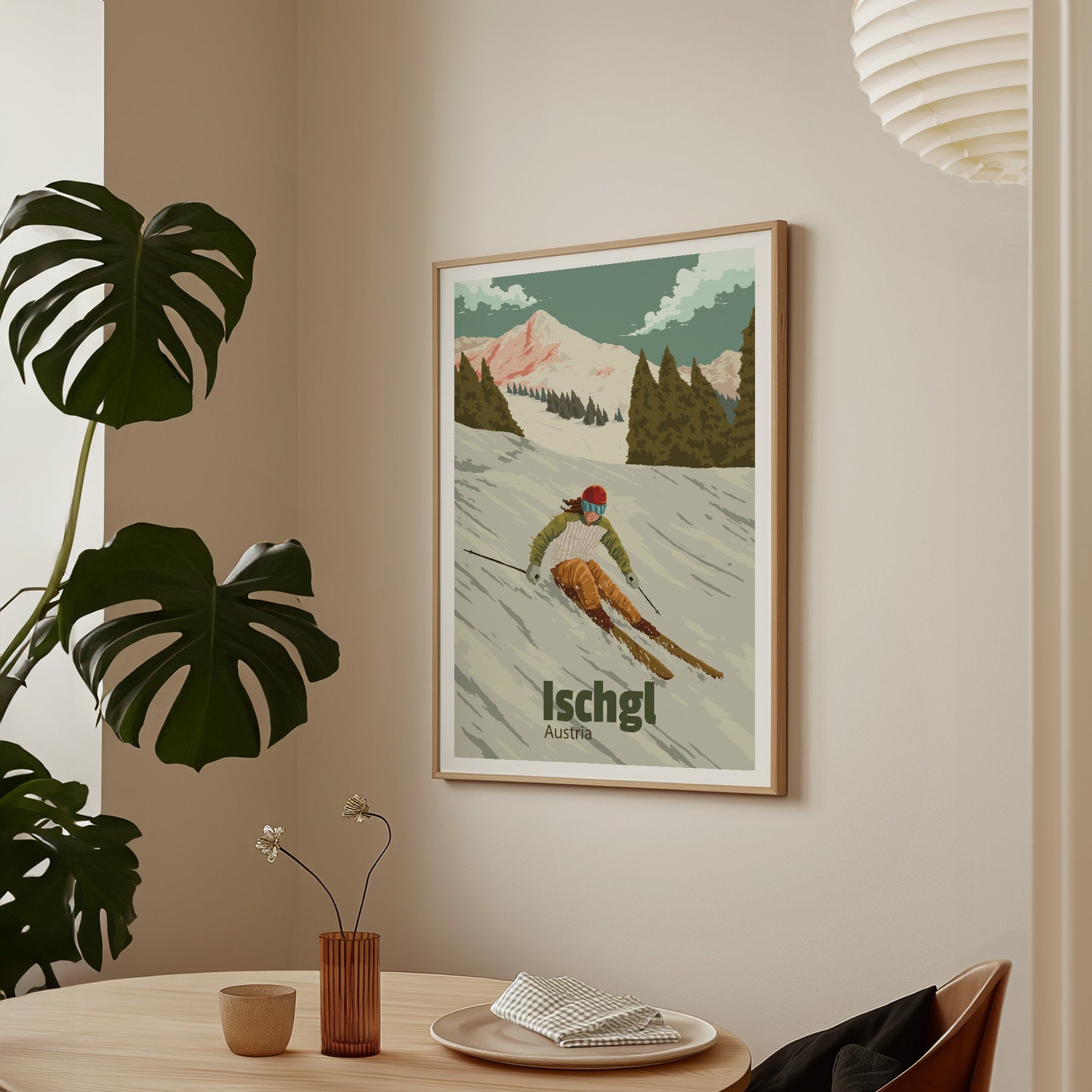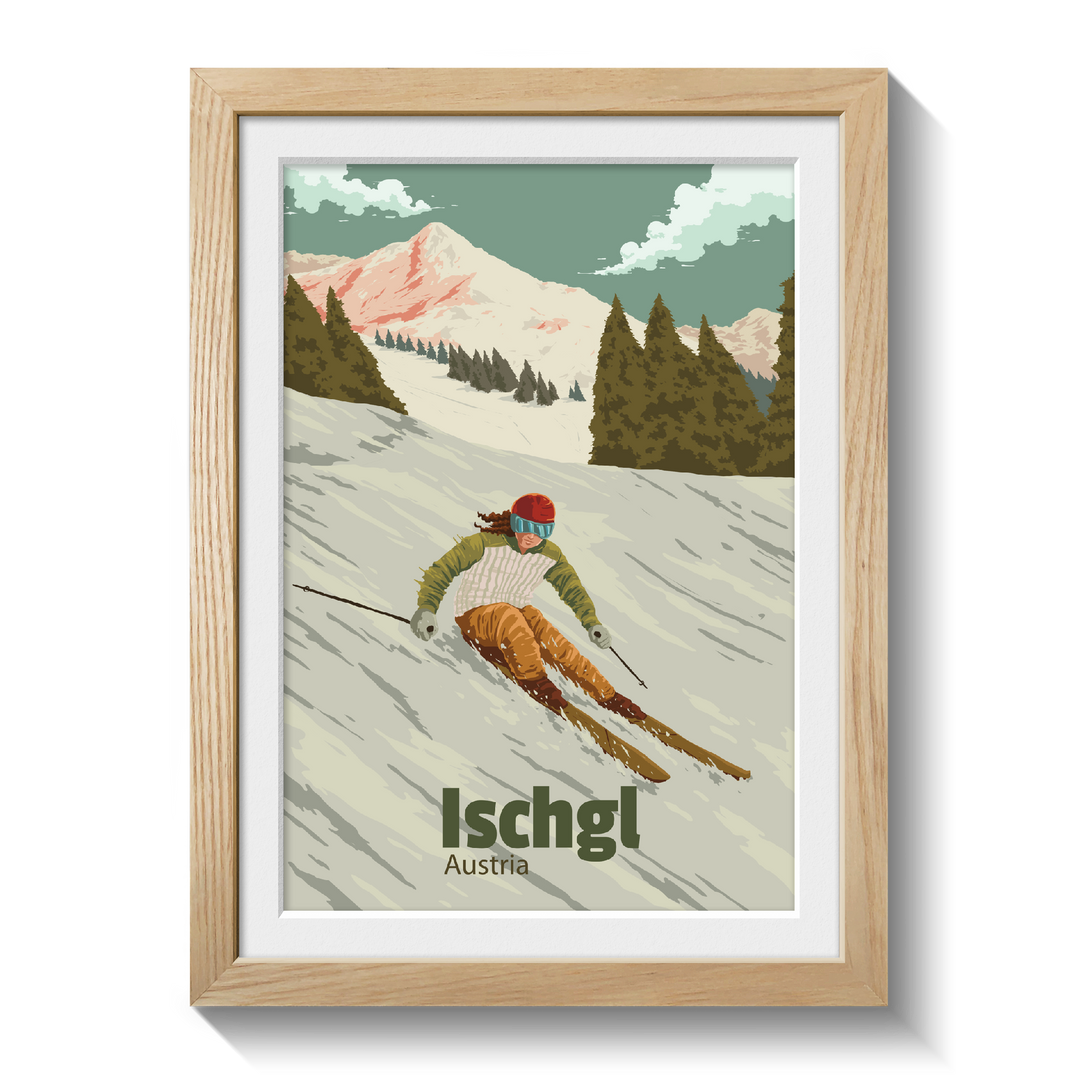 This is an original travel poster featuring the popular Austrian ski resort of Ischgl.