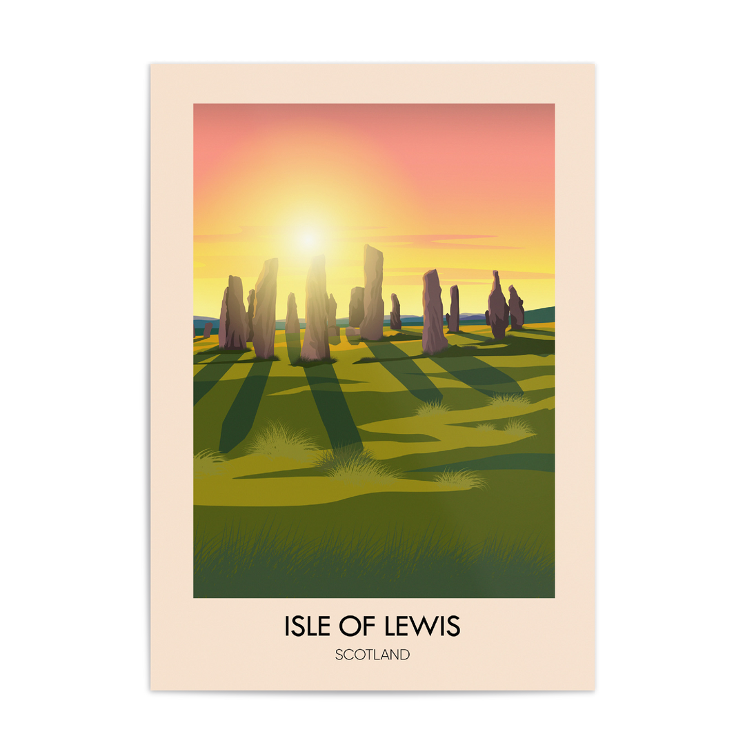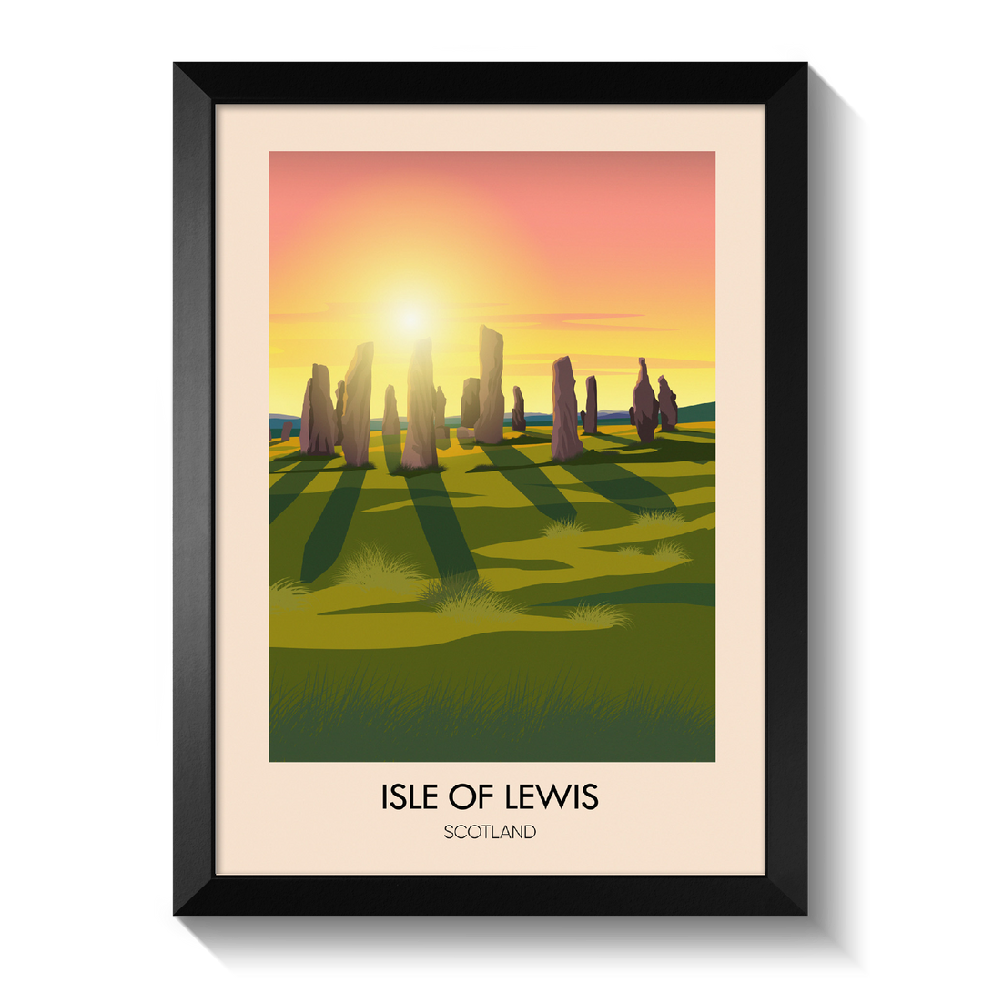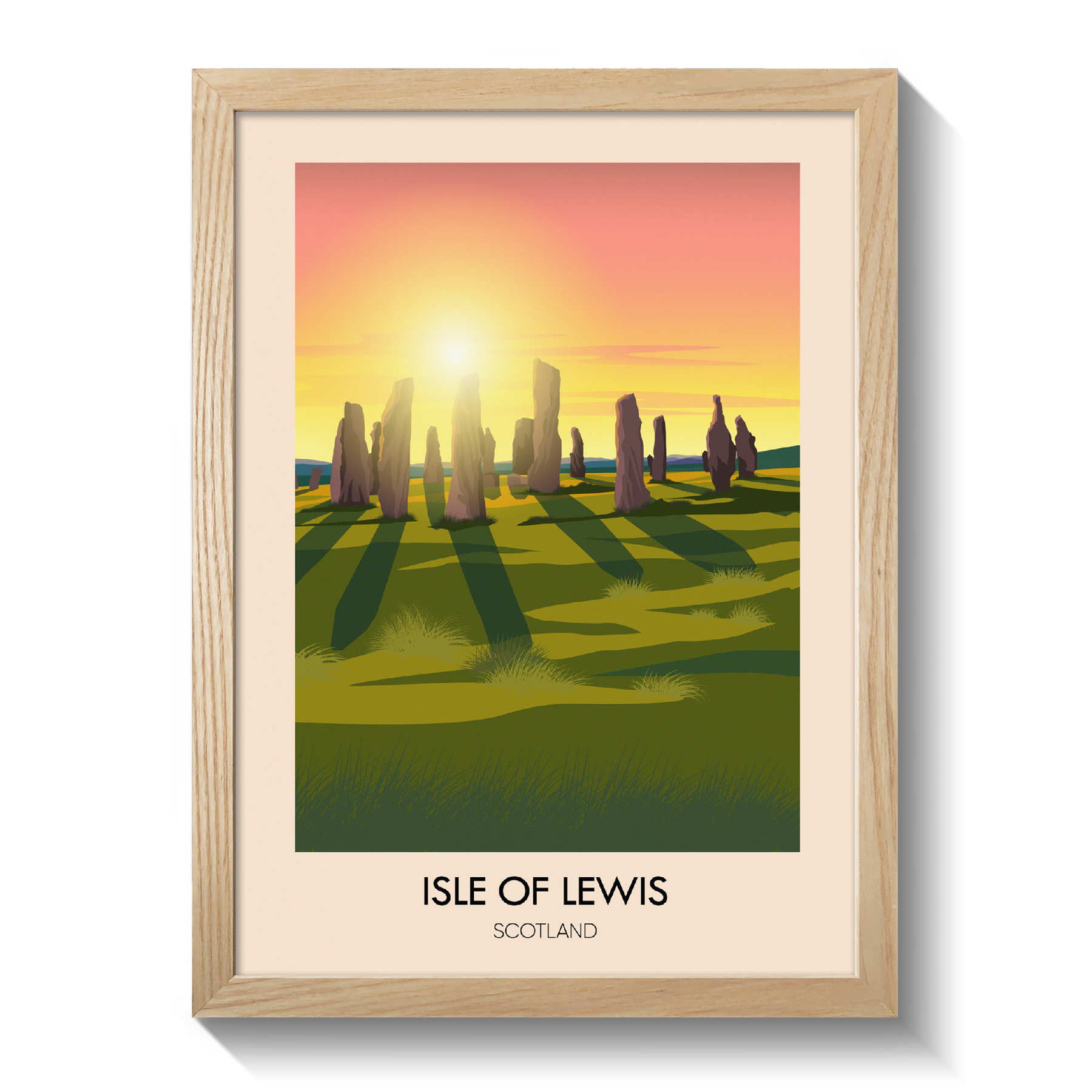 An original travel poster featuring Scotland's Isle of Lewis. The Isle of Lewis is part of Lewis and Harris which between them make up the largest Scottish island. They are divided by mountains and often referred to as separate islands. They are part of the Western Isles or the Outer Hebrides.