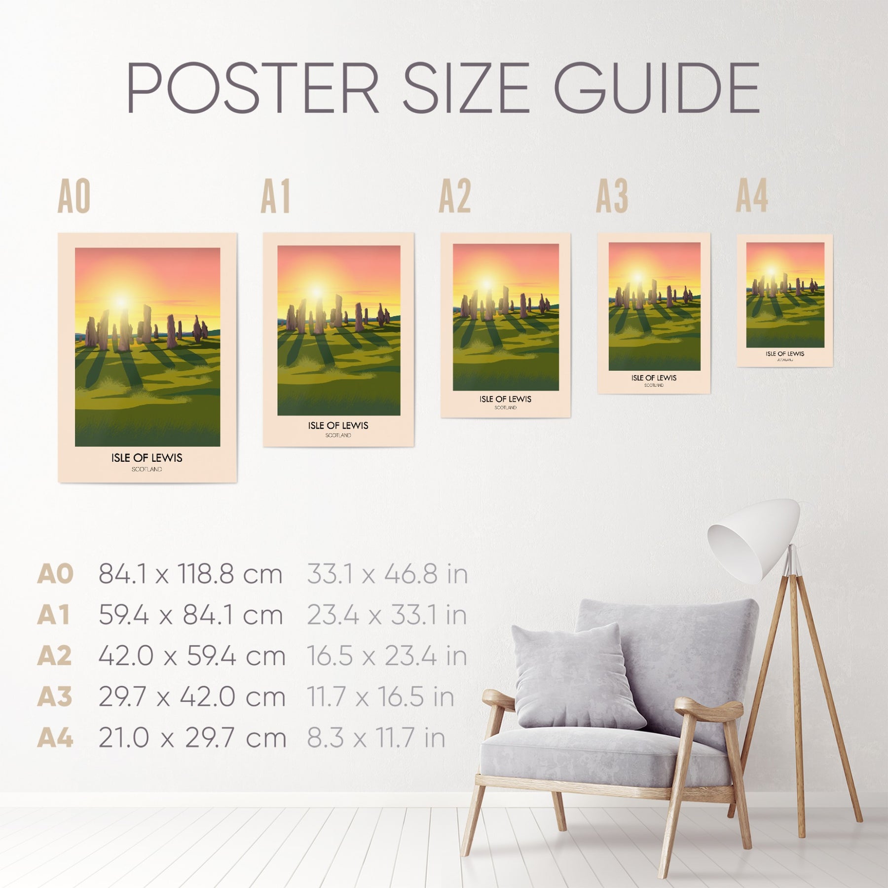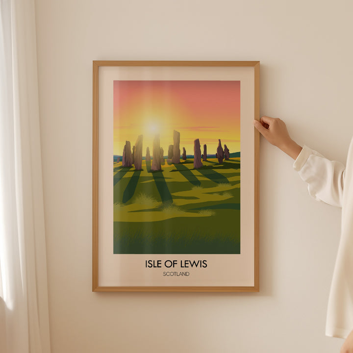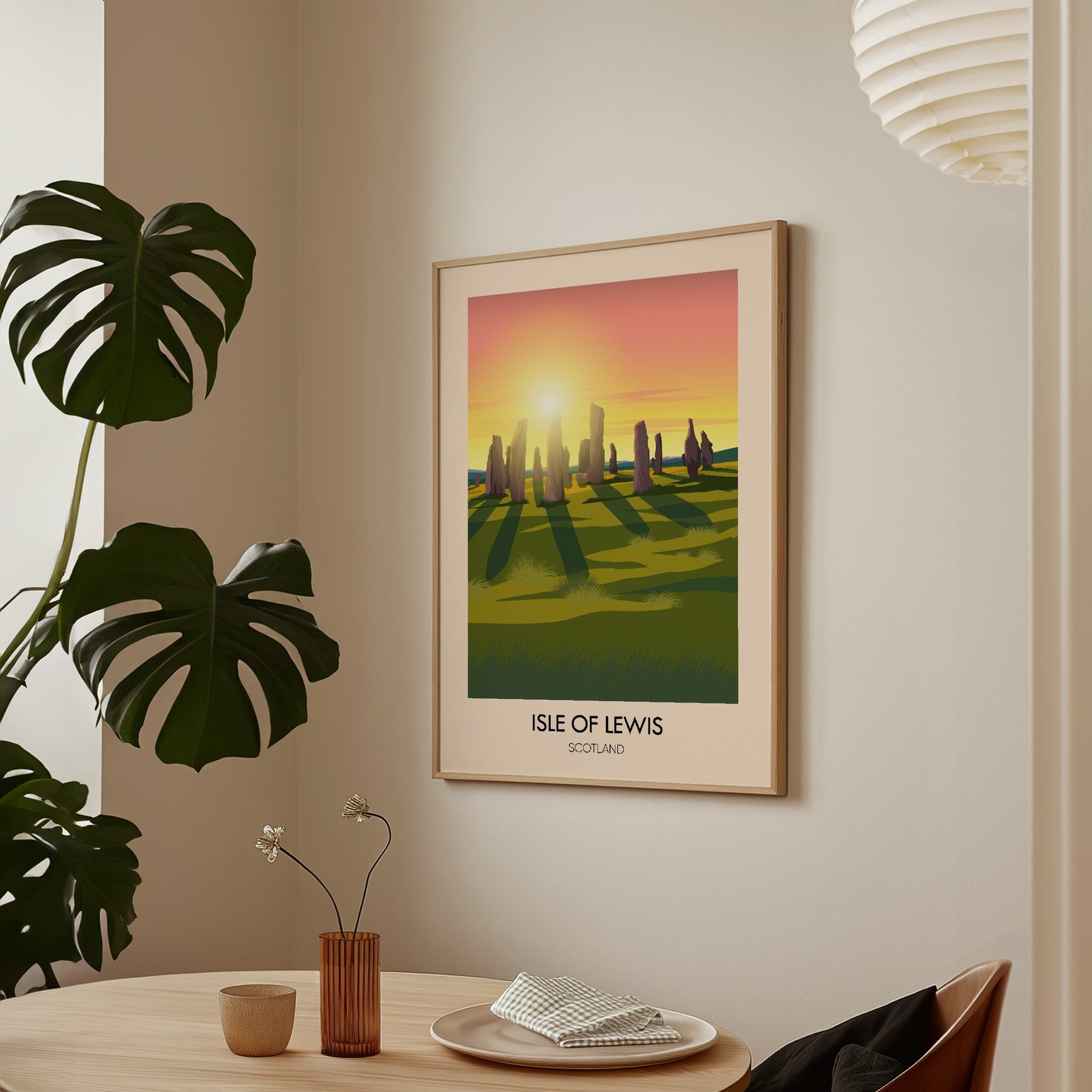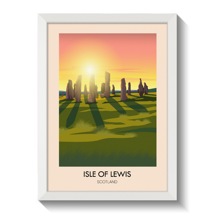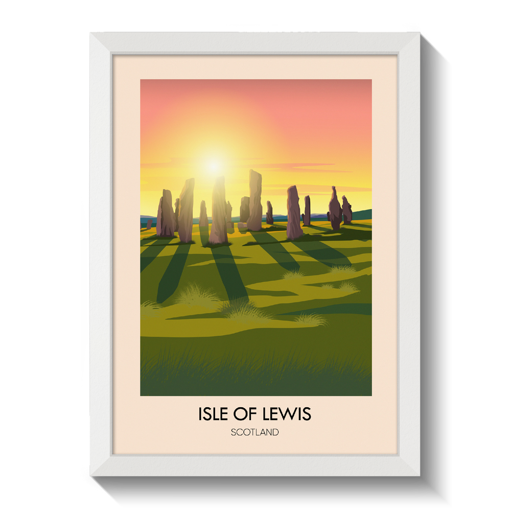 An original travel poster featuring Scotland's Isle of Lewis. The Isle of Lewis is part of Lewis and Harris which between them make up the largest Scottish island. They are divided by mountains and often referred to as separate islands. They are part of the Western Isles or the Outer Hebrides.