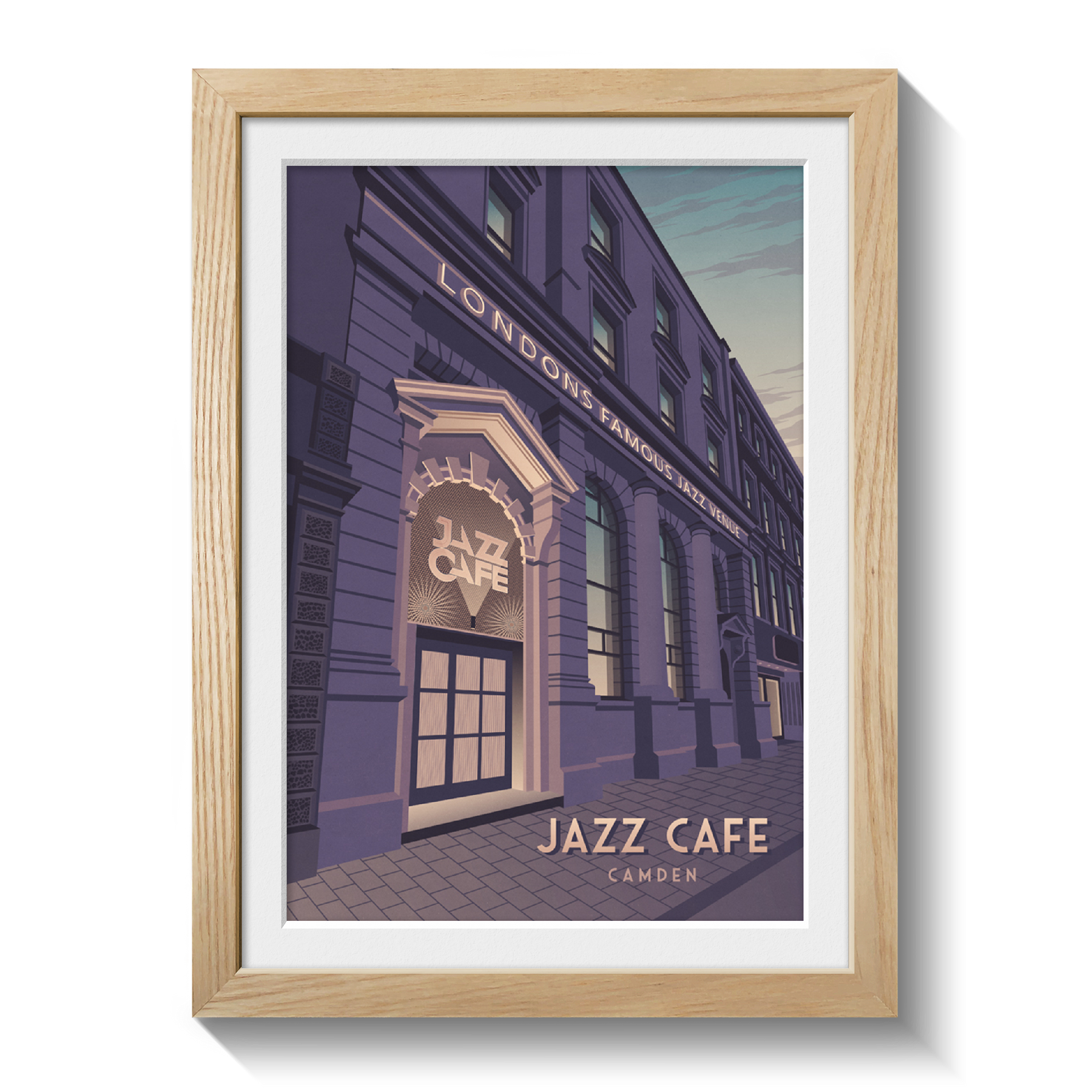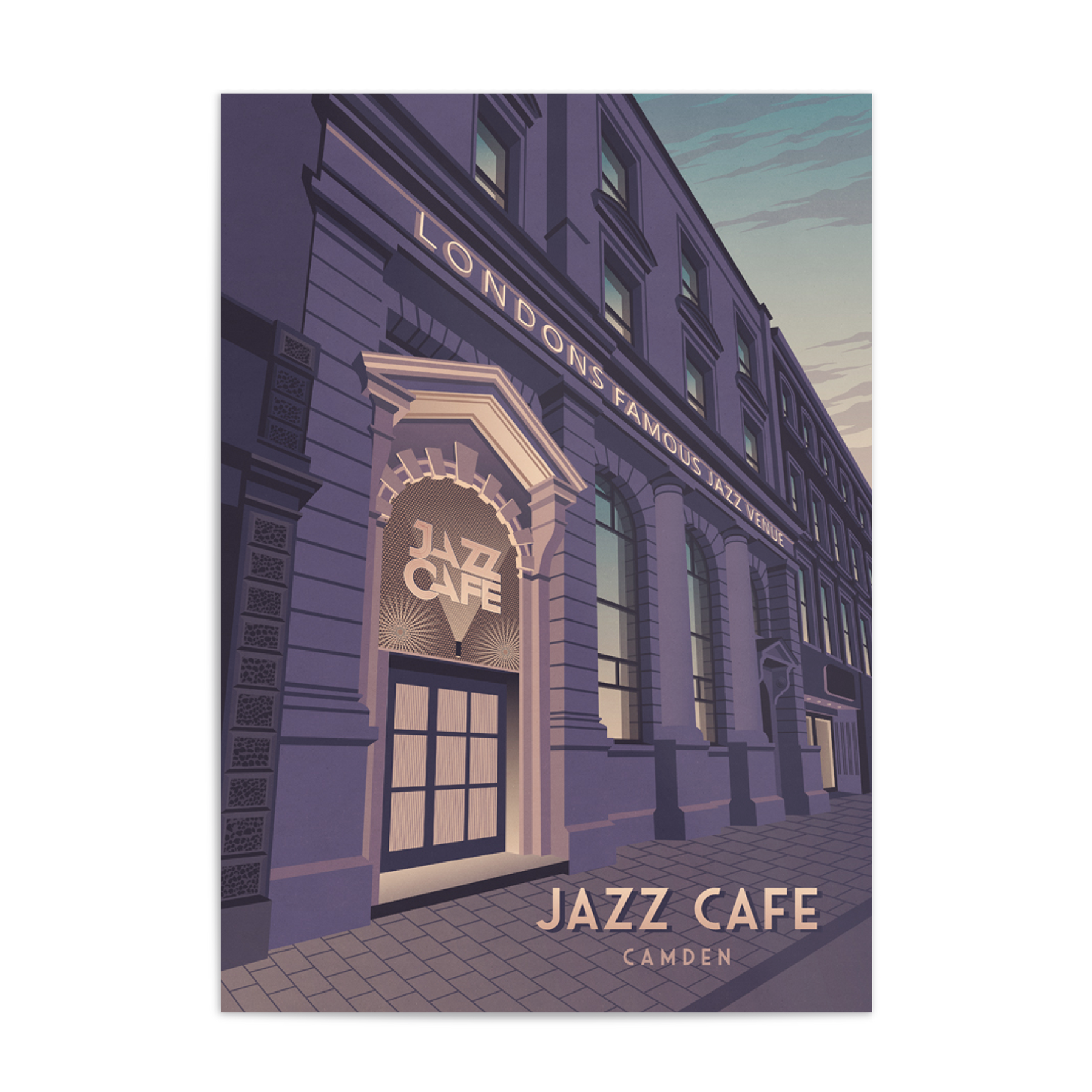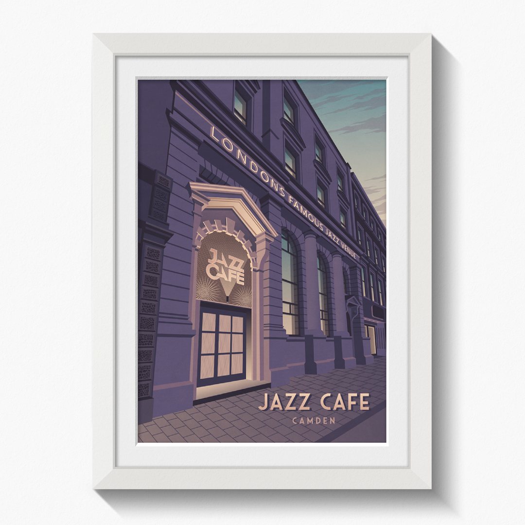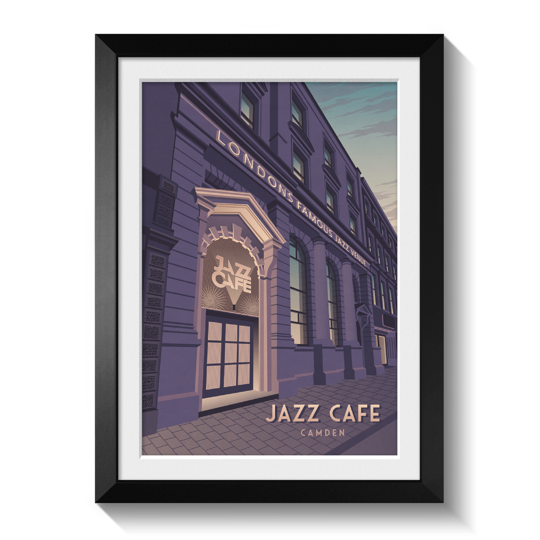 An original travel poster featuring the legendary Jazz Cafe, situated in Camden Town, North London.