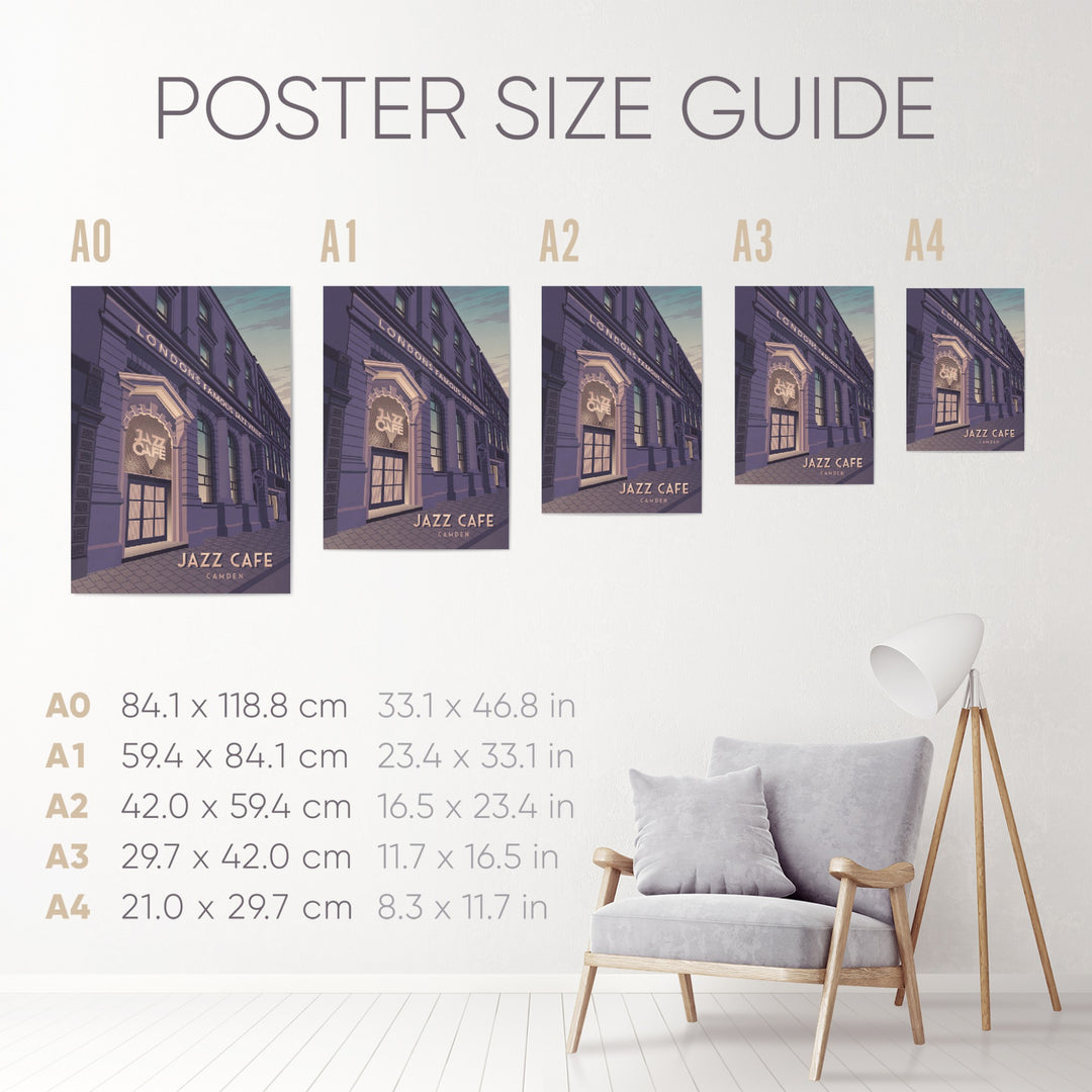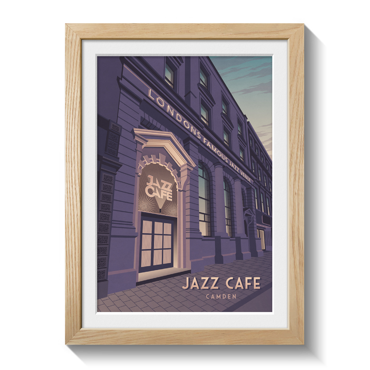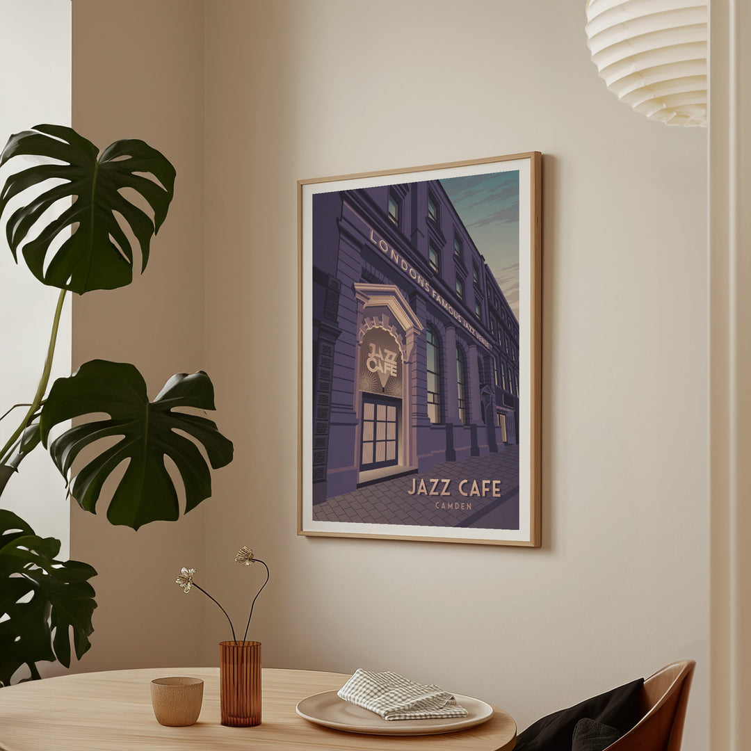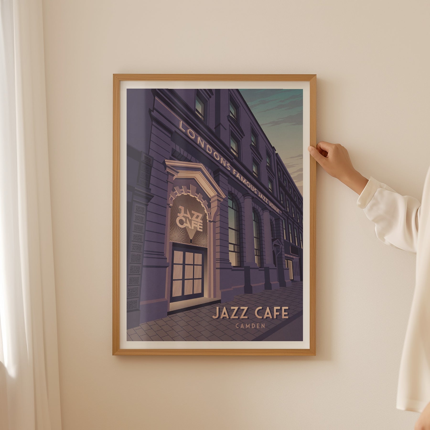 An original travel poster featuring the legendary Jazz Cafe, situated in Camden Town, North London.