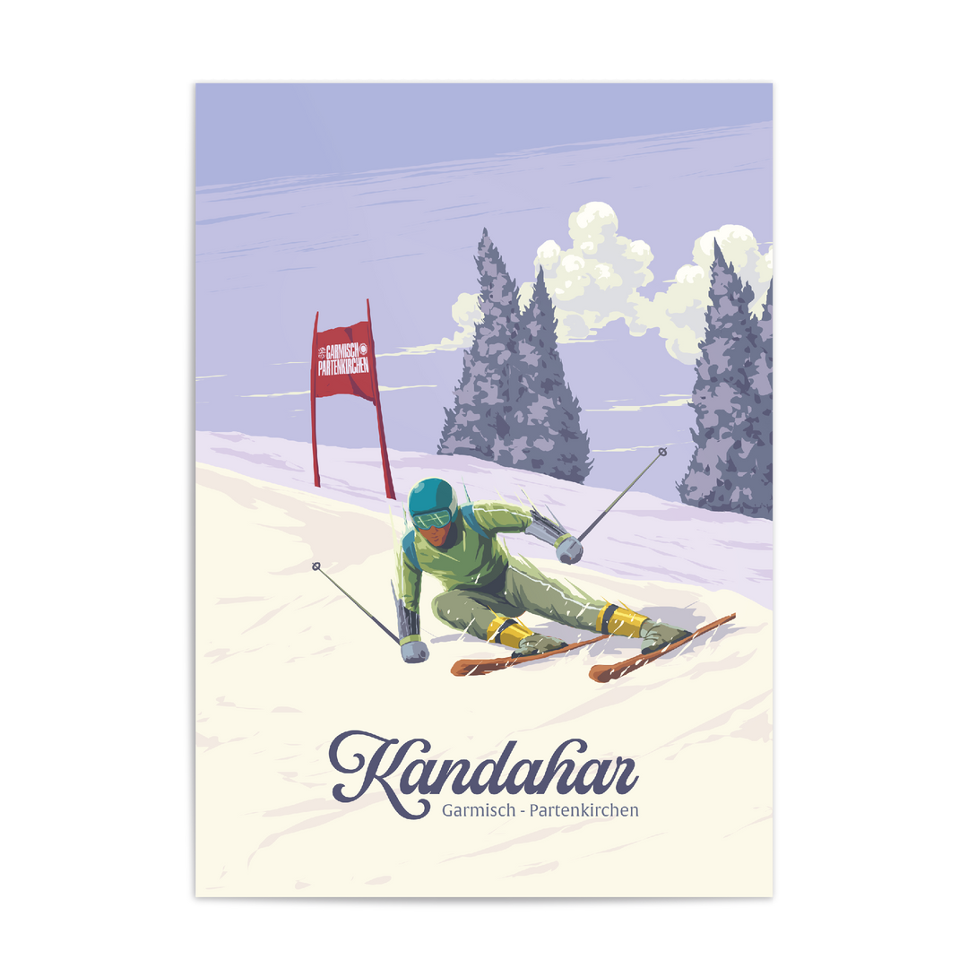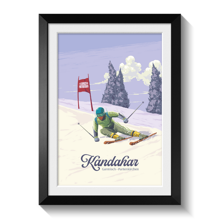 This Kandahar travel poster features the legendary World Cup downhill ski route in southern Germany. Perfect for ski enthusiasts and alpine lovers, it captures the excitement of one of Europe’s most famous slopes. A stylish addition to your decor, celebrating the thrill and beauty of Germany’s premier skiing destination.