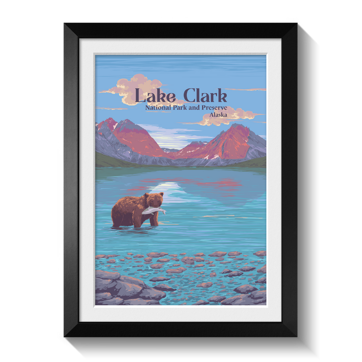 This poster features a grizzly bear catching a fish in one of the many lakes in Alaska's Lake Clark National Park, home to the Chigmit Mountains and the active volcano, Mount Redoubt.