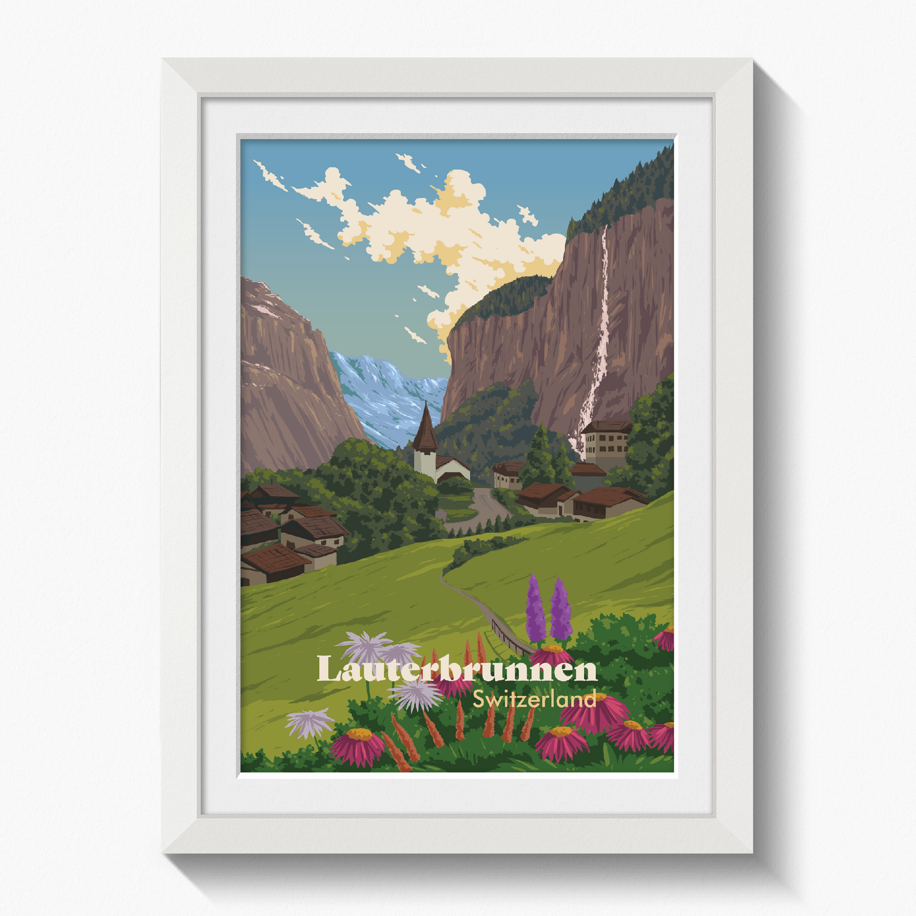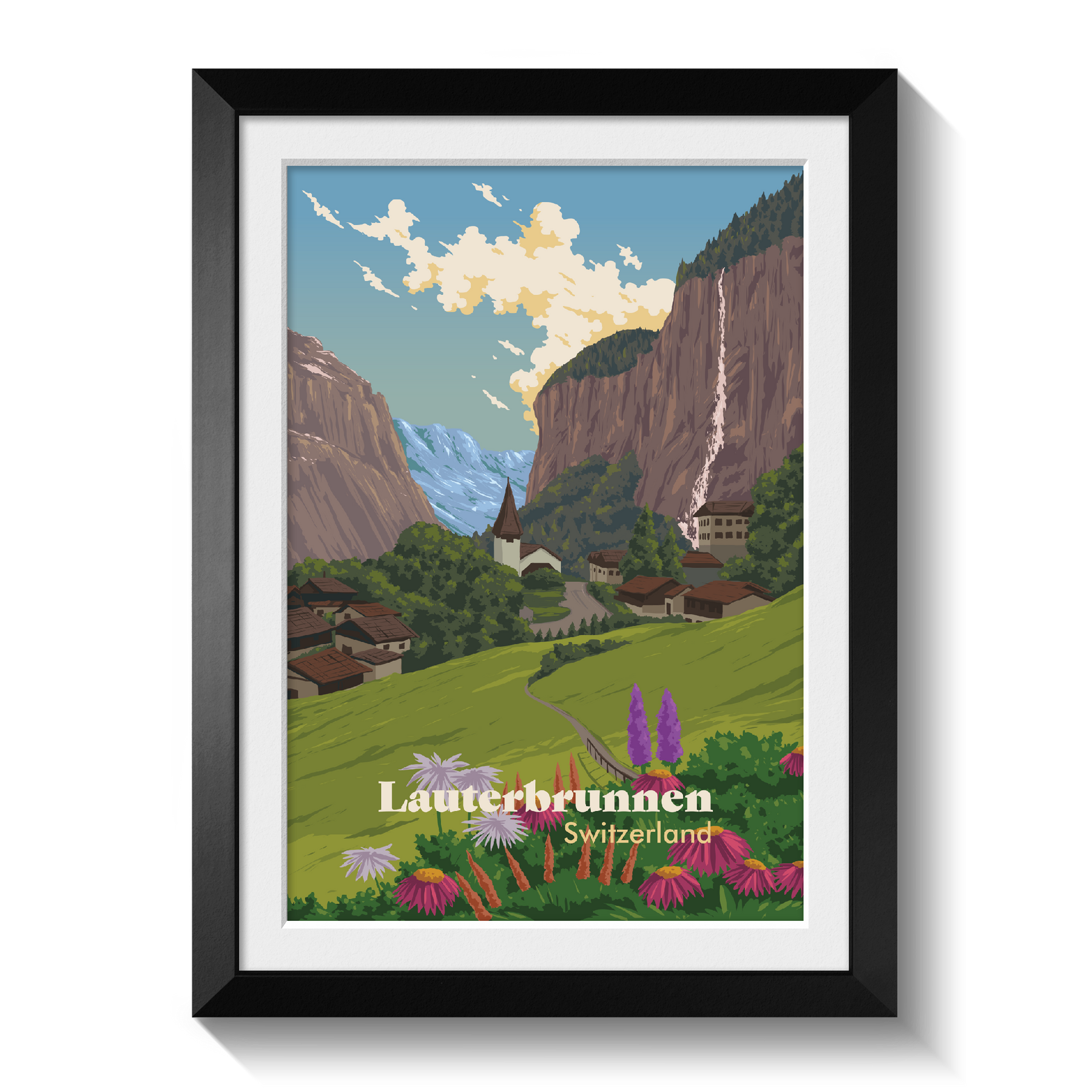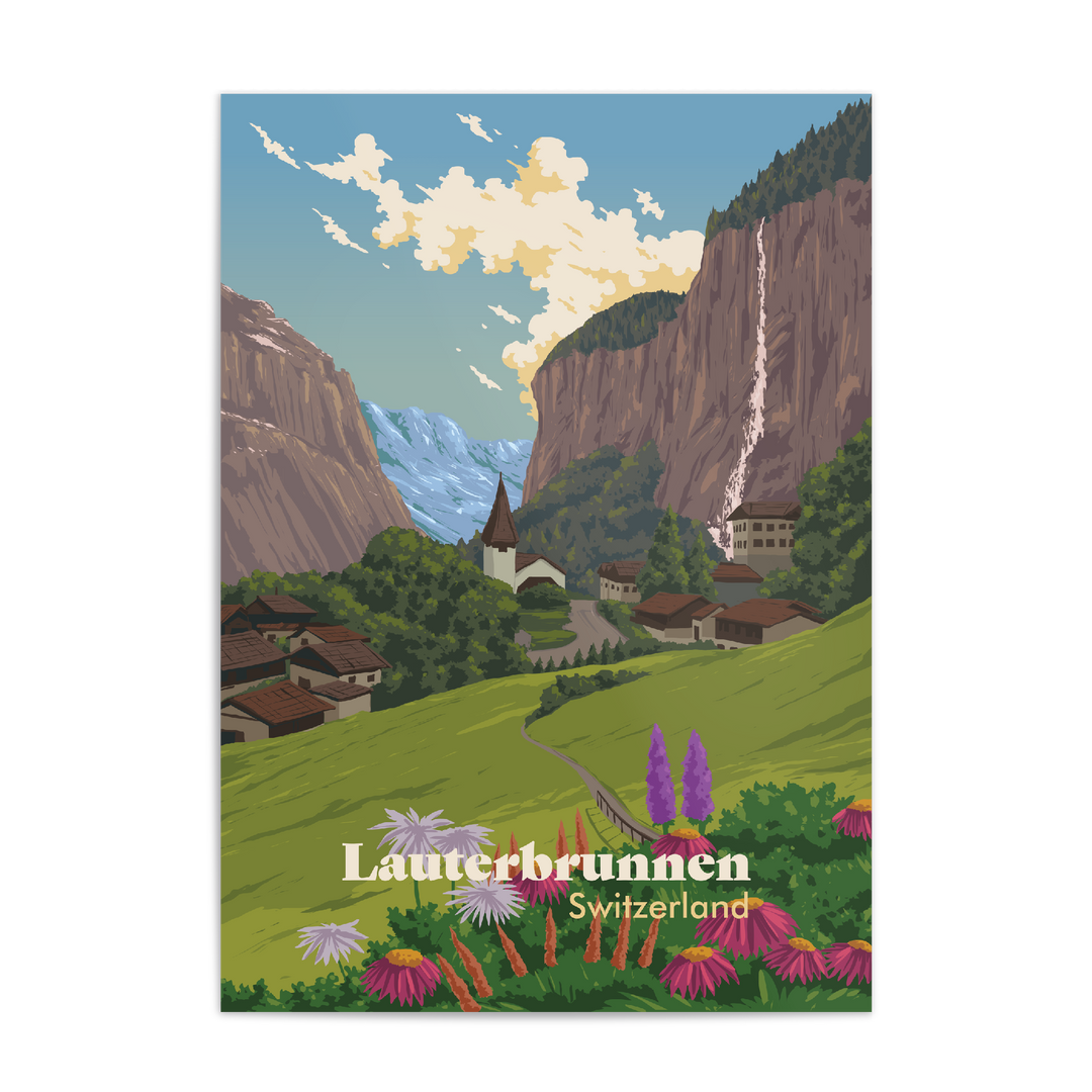 This travel poster features the Swiss alpine village of Lauterbrunnen; regularly referred to as the most beautiful village on earth.