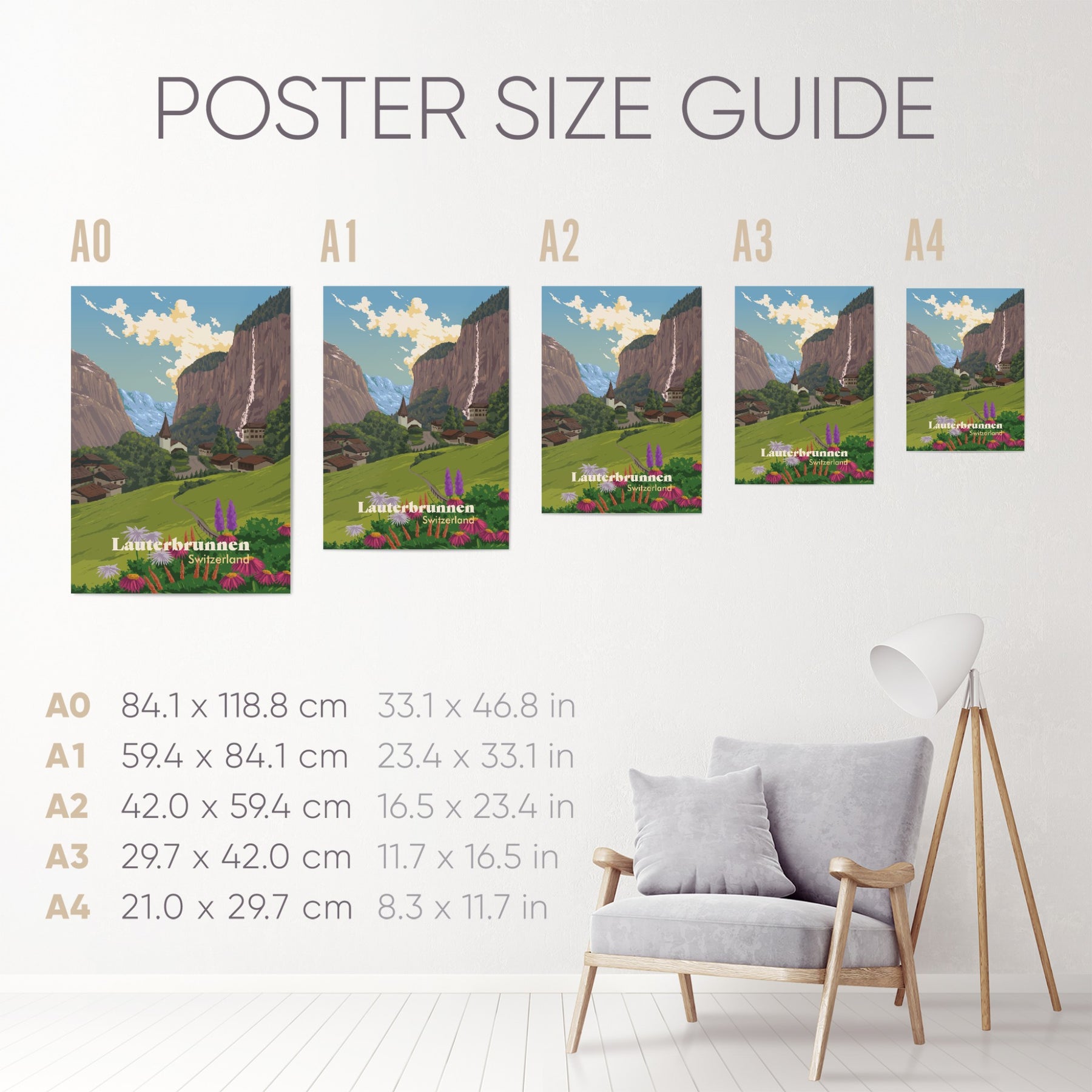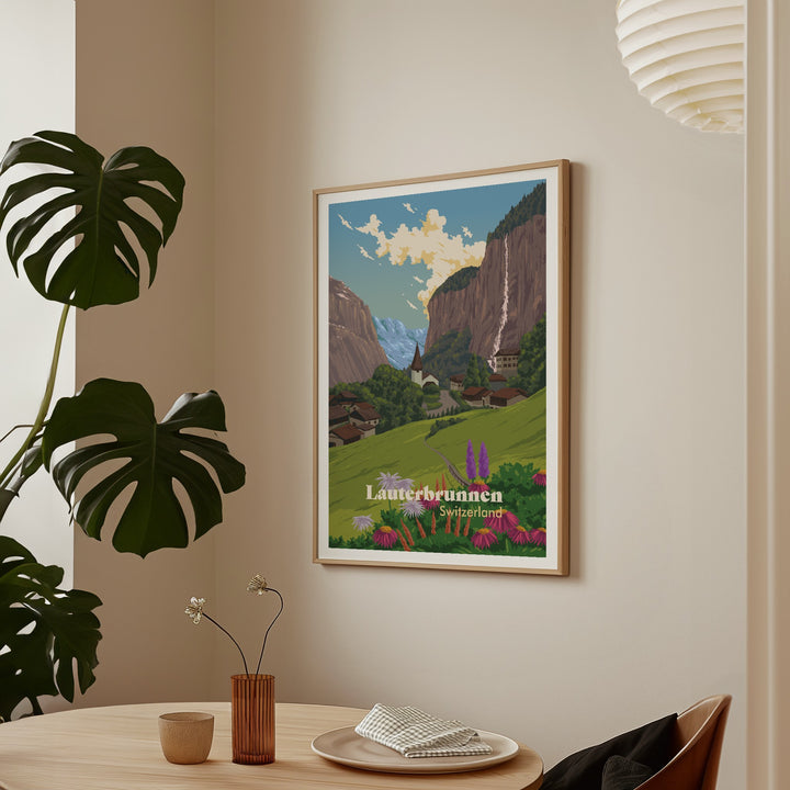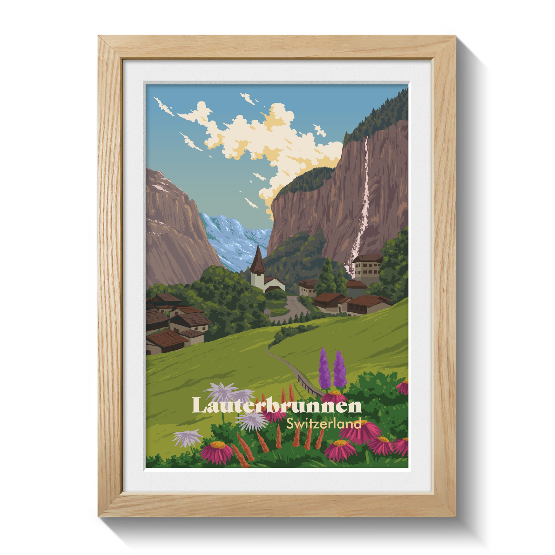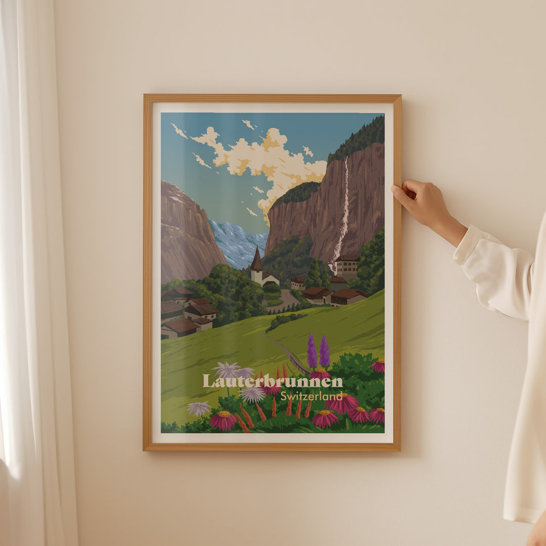 This travel poster features the Swiss alpine village of Lauterbrunnen; regularly referred to as the most beautiful village on earth.