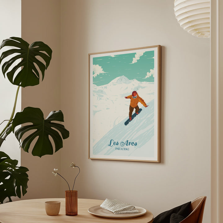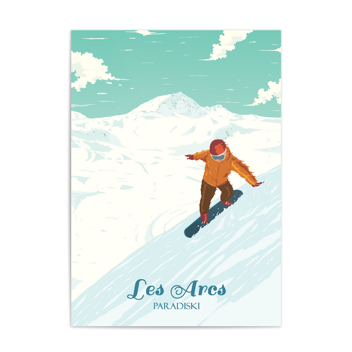 Original travel poster featuring the popular French ski resort of Les Arcs in the Paradiski area of the French Alps.