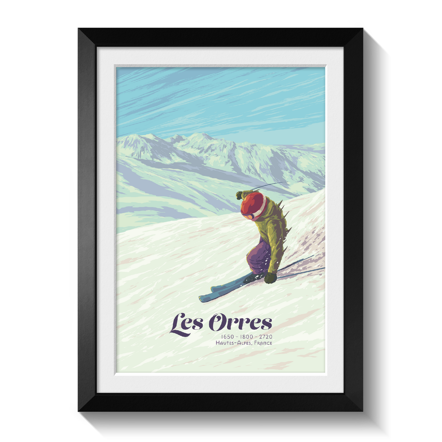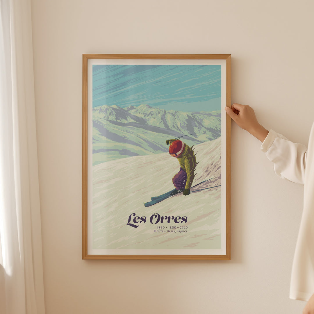 This is an original travel poster featuring the French ski resort of Les Orres in the Southern Alps. Les Orres is based in a Larch Forest, overlooking the Serre Ponçon and Embrun Valleys.