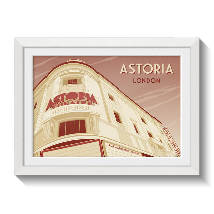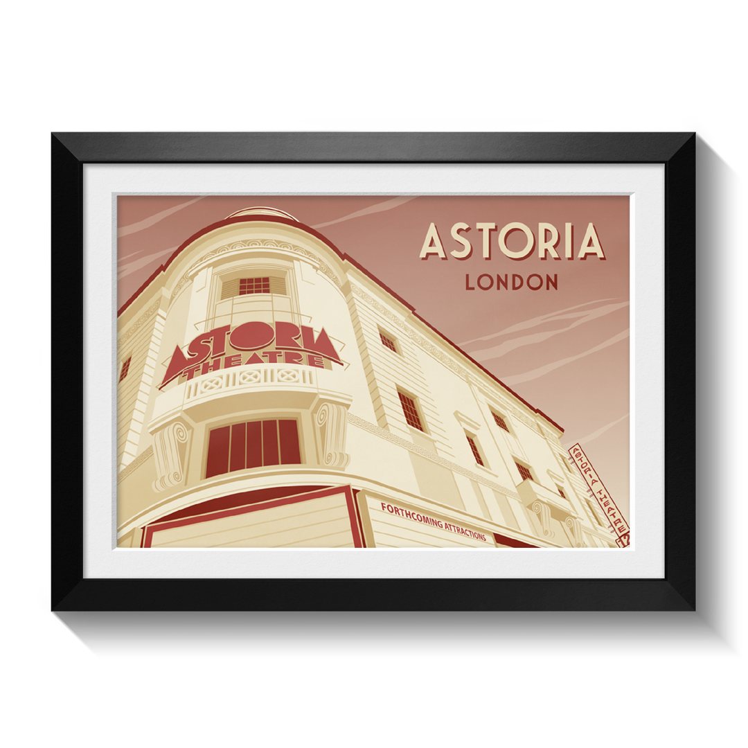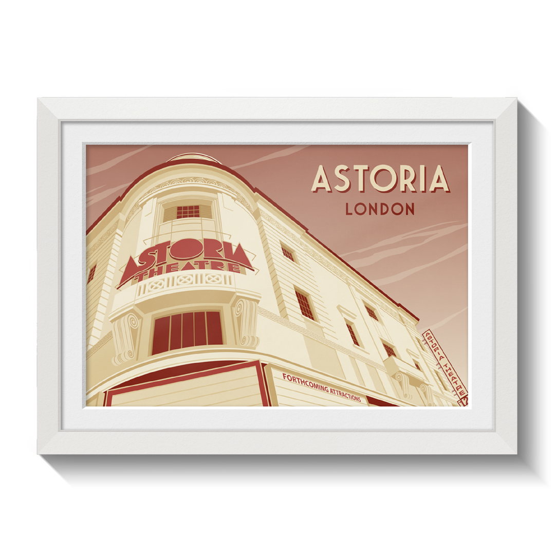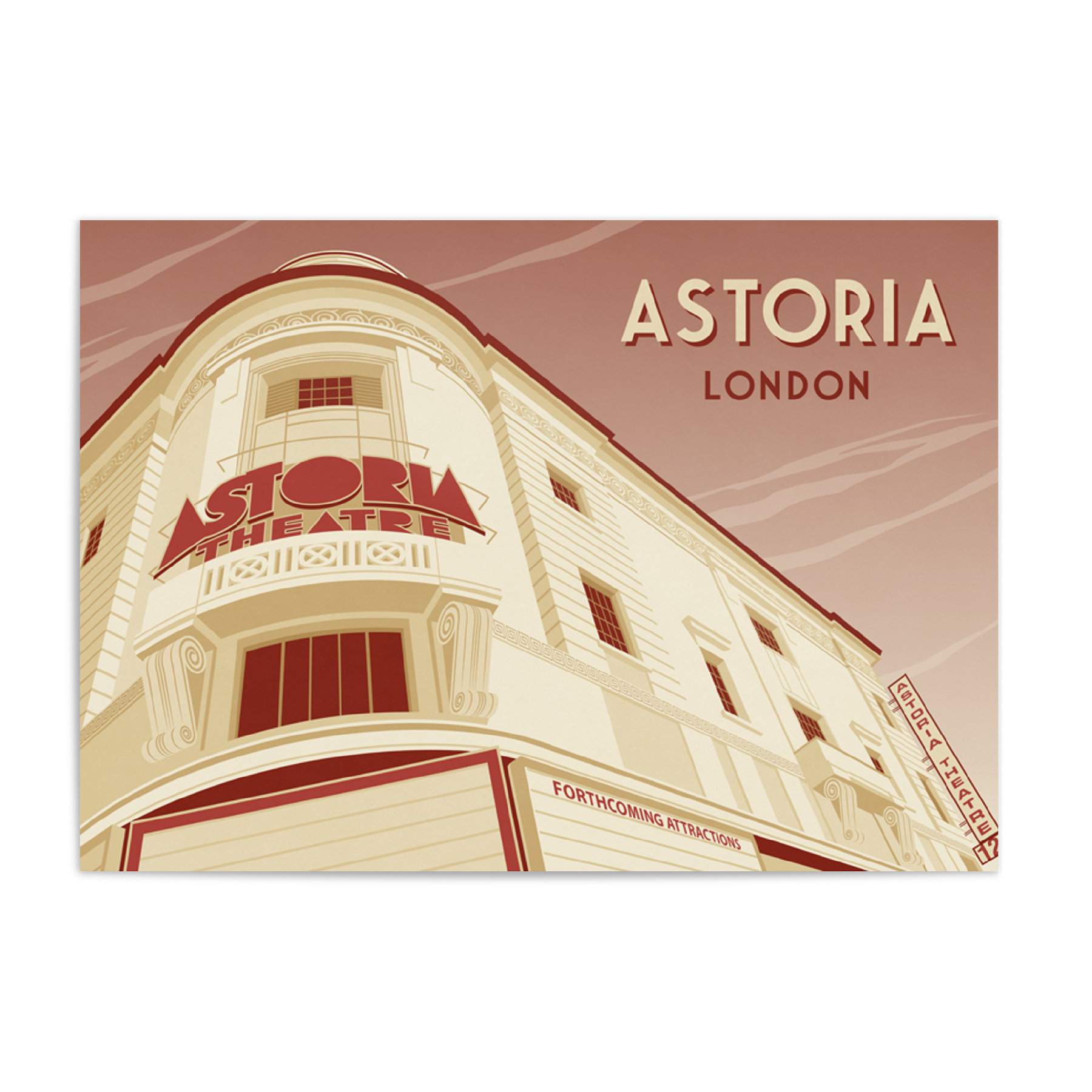 An art deco style music venue travel poster featuring the iconic London Astoria.