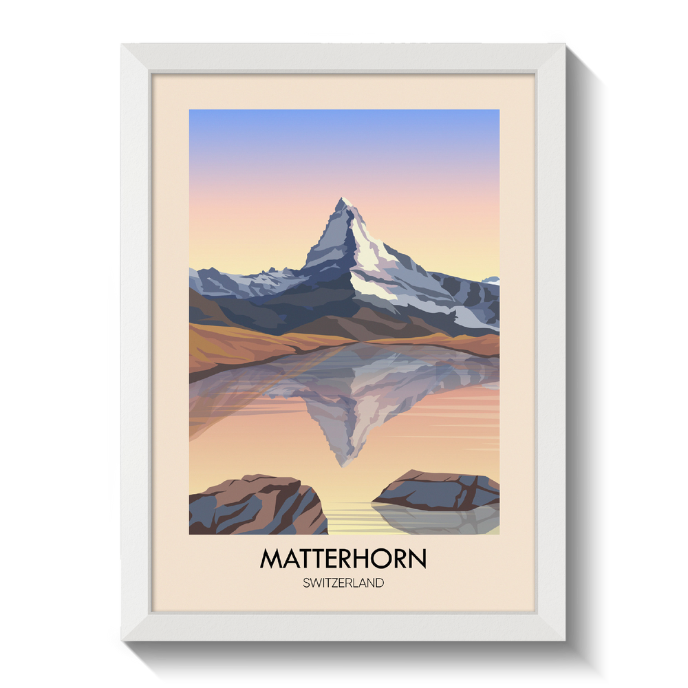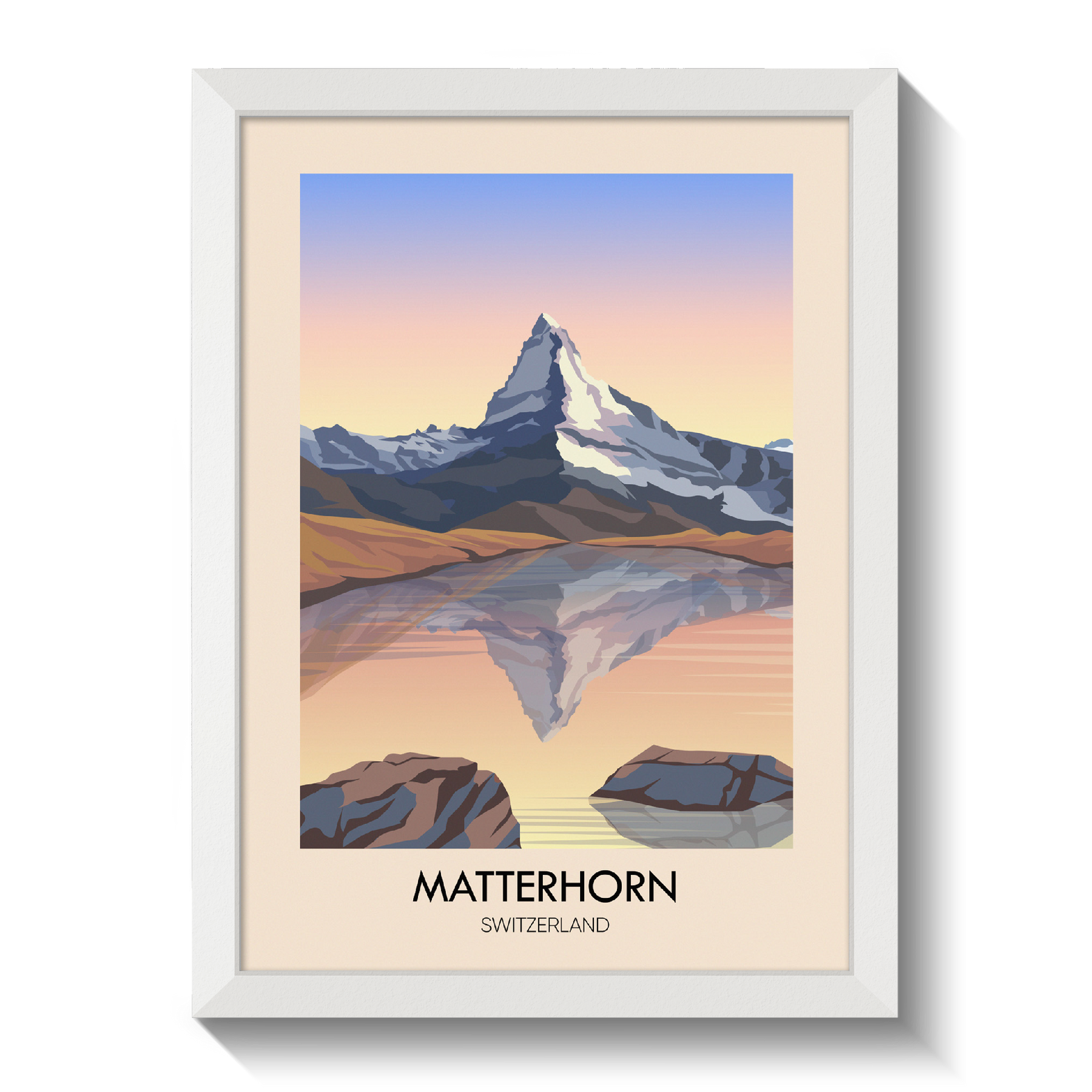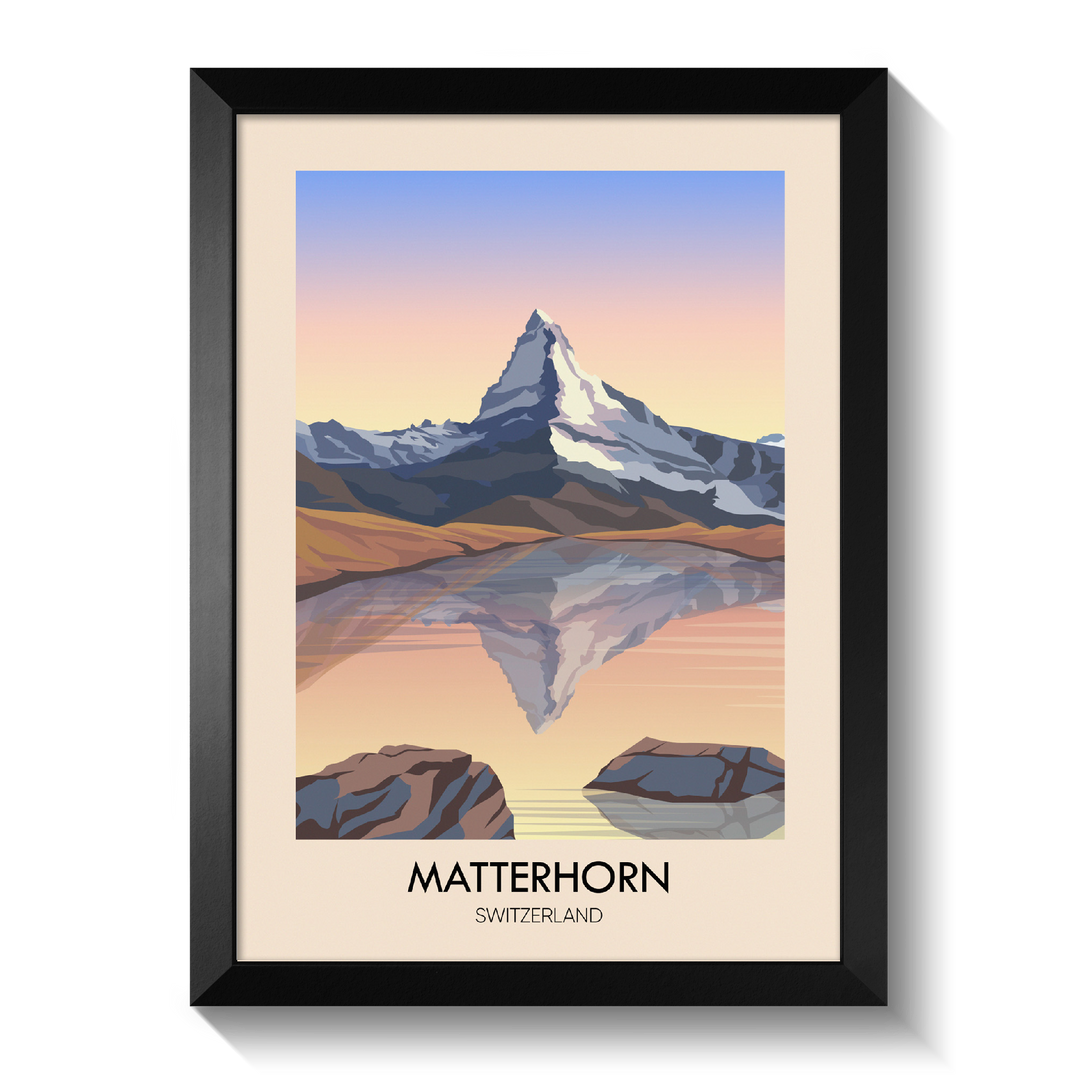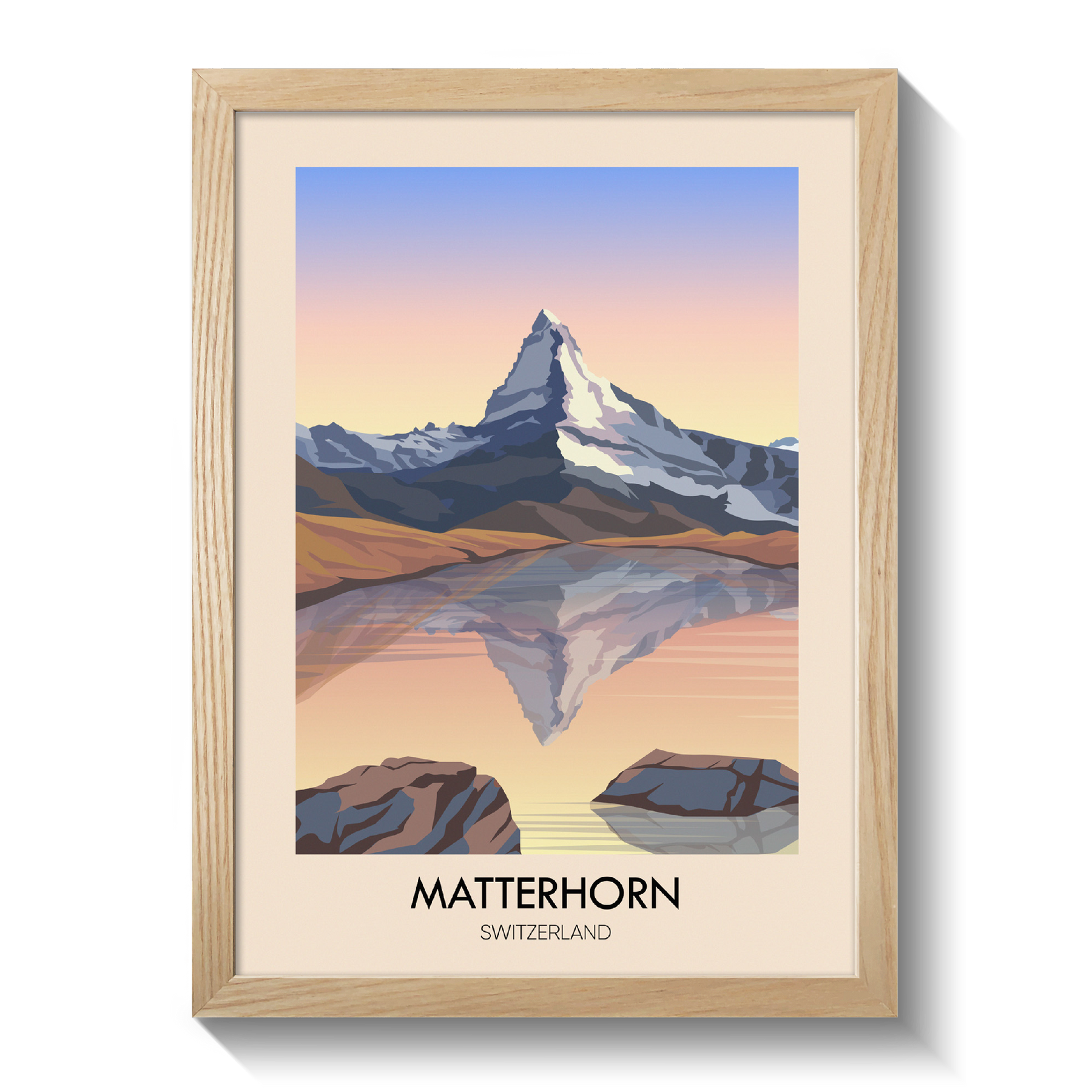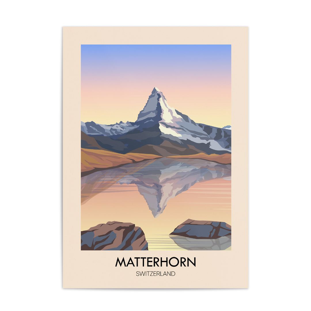 An original travel poster featuring famous Matterhorn mountain. The Matterhorn is one of the most iconic and recognisable mountains in the Alps, straddling the frontier between Switzerland and Italy.